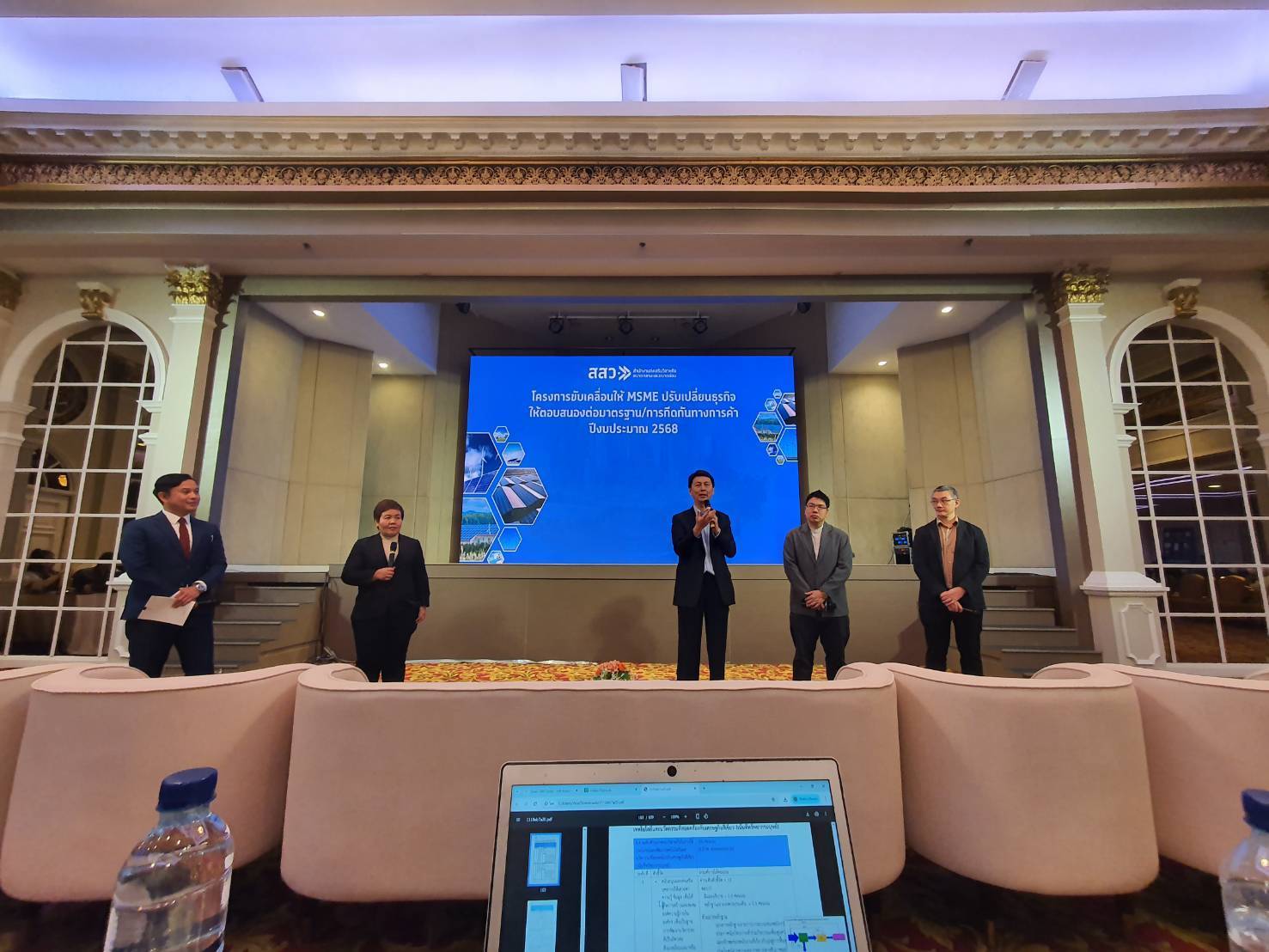 บุคลากรคณะวิทยาศาสตร์และเทคโนโลยี มหาวิทยาลัยสวนดุสิต ได้แก่ ดร.สิมนัส ตรีเดช และ อาจารย์สาวิตรี ม่วงศรี เข้าร่วมกิจกรรมภายใต้ โครงการขับเคลื่อนให้ MSME ปรับเปลี่ยนธุรกิจให้ตอบสนองต่อมาตรฐานและการกีดกันทางการค้า ประจำปีงบประมาณ 2568 ในฐานะทีมที่ปรึกษาด้านการประเมินการปล่อยก๊าซเรือนกระจกของวิสาหกิจขนาดกลางและขนาดย่อม (MSME) โดยเข้าร่วมทั้ง กิจกรรมอบรม และกิจกรรมแถลงความสำเร็จและปิดโครงการ โดยมีรายละเอียดประกอบด้วย 1) กิจกรรมอบรมเรื่อง “การปรับเปลี่ยนธุรกิจให้ตอบสนองต่อมาตรฐานและการกีดกันทางการค้าจากนโยบายความเป็นกลางทางคาร์บอน” จัดขึ้นระหว่างวันที่ 13–14 พฤษภาคม 2568 ณ โรงแรมแมนดาริน กรุงเทพฯ มีวัตถุประสงค์เพื่อเสริมสร้างความรู้ ความเข้าใจ และแนวทางปฏิบัติให้แก่ผู้ประกอบการ MSME ในการปรับตัวสู่ธุรกิจสีเขียว และเตรียมความพร้อมในการรองรับมาตรฐานด้านสิ่งแวดล้อมที่เกี่ยวข้องกับการค้าในระดับสากล และ 2) กิจกรรมแถลงความสำเร็จและปิดโครงการ ซึ่งจัดขึ้นภายใต้ความร่วมมือของ สำนักงานส่งเสริมวิสาหกิจขนาดกลางและขนาดย่อม ร่วมกับ มหาวิทยาลัยศิลปากร และ สถาบันเทคโนโลยีพระจอมเกล้าเจ้าคุณทหารลาดกระบัง ณ โรงแรมแมนดาริน กรุงเทพฯ เมื่อวันที่ 14 กันยายน 2568 โดยมีวัตถุประสงค์3เพื่อสรุปผลและเผยแพร่ความสำเร็จของการดำเนินโครงการ ตลอดจนถ่ายทอดองค์ความรู้และบทเรียนจากการให้คำปรึกษาเชิงลึกแก่ผู้ประกอบการ MSME ในการปรับเปลี่ยนธุรกิจสู่แนวทางธุรกิจสีเขียว เพื่อเสริมสร้างความพร้อมในการตอบสนองต่อมาตรฐานด้านสิ่งแวดล้อมและการกีดกันทางการค้าในระดับประเทศและนานาชาติ