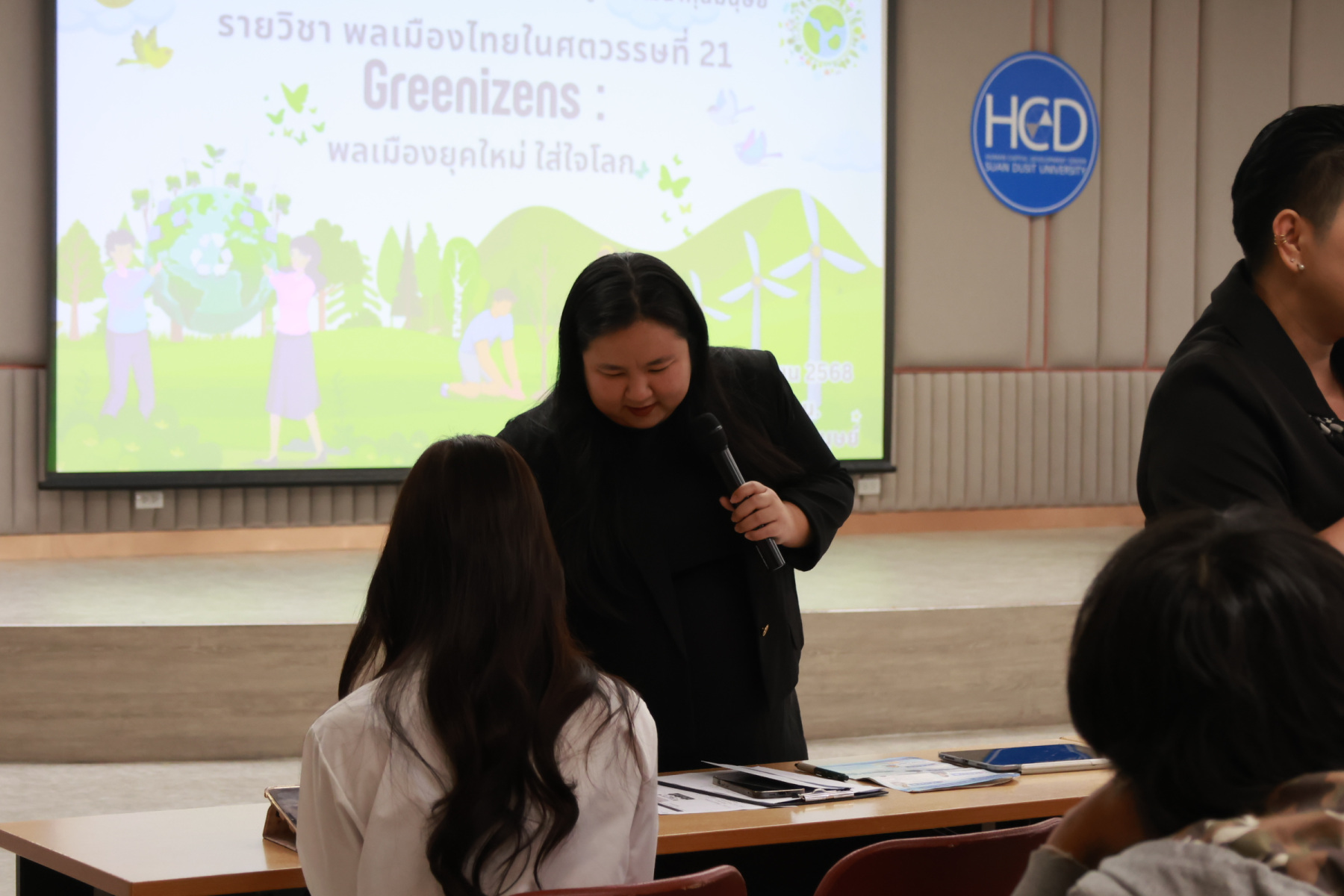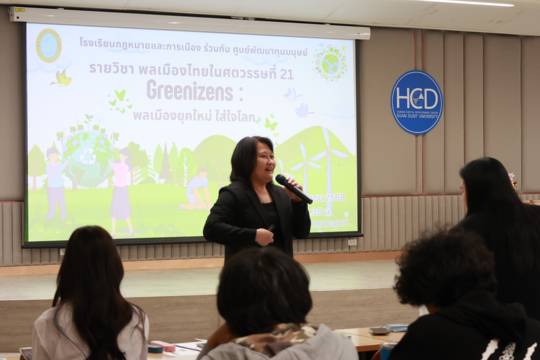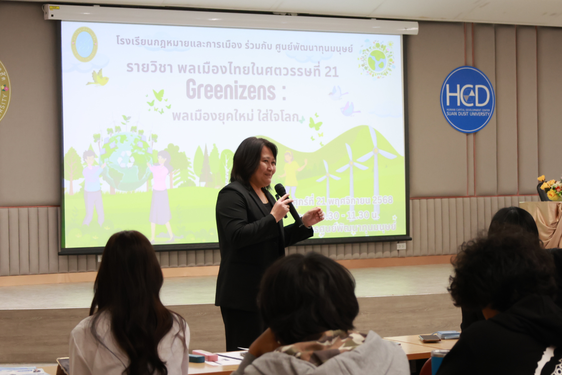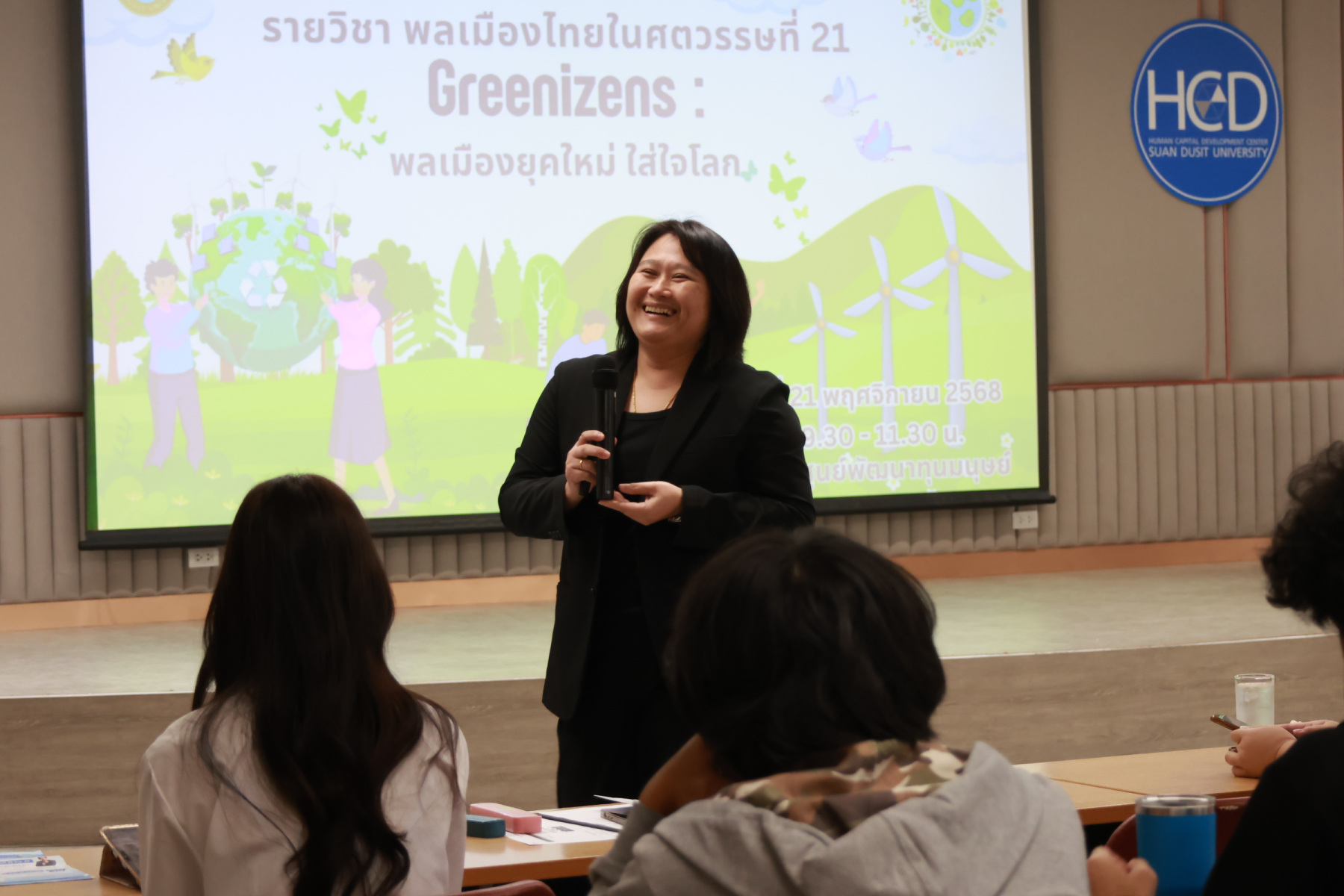 มหาวิทยาลัยสวนดุสิต จัดการเรียนการสอนรายวิชาพลเมืองไทยในศตวรรษที่ 21 ภาคเรียนที่ 2/2568 โดย ดร.พรธิดา เทพประสิทธิ์ ผู้อำนวยการศูนย์สิ่งแวดล้อม มหาวิทยาลัยสวนดุสิต เป็นวิทยากรบรรยายในหัวข้อ Greenizens พลเมืองยุคใหม่ ใส่ใจโลก ณ ห้องประชุม 301 อาคาร ดร.ศิโรจน์ ผลพันธิน ศูนย์พัฒนาทุนมนุษย์ เมื่อวันที่ 21 พฤศจิกายน 2568