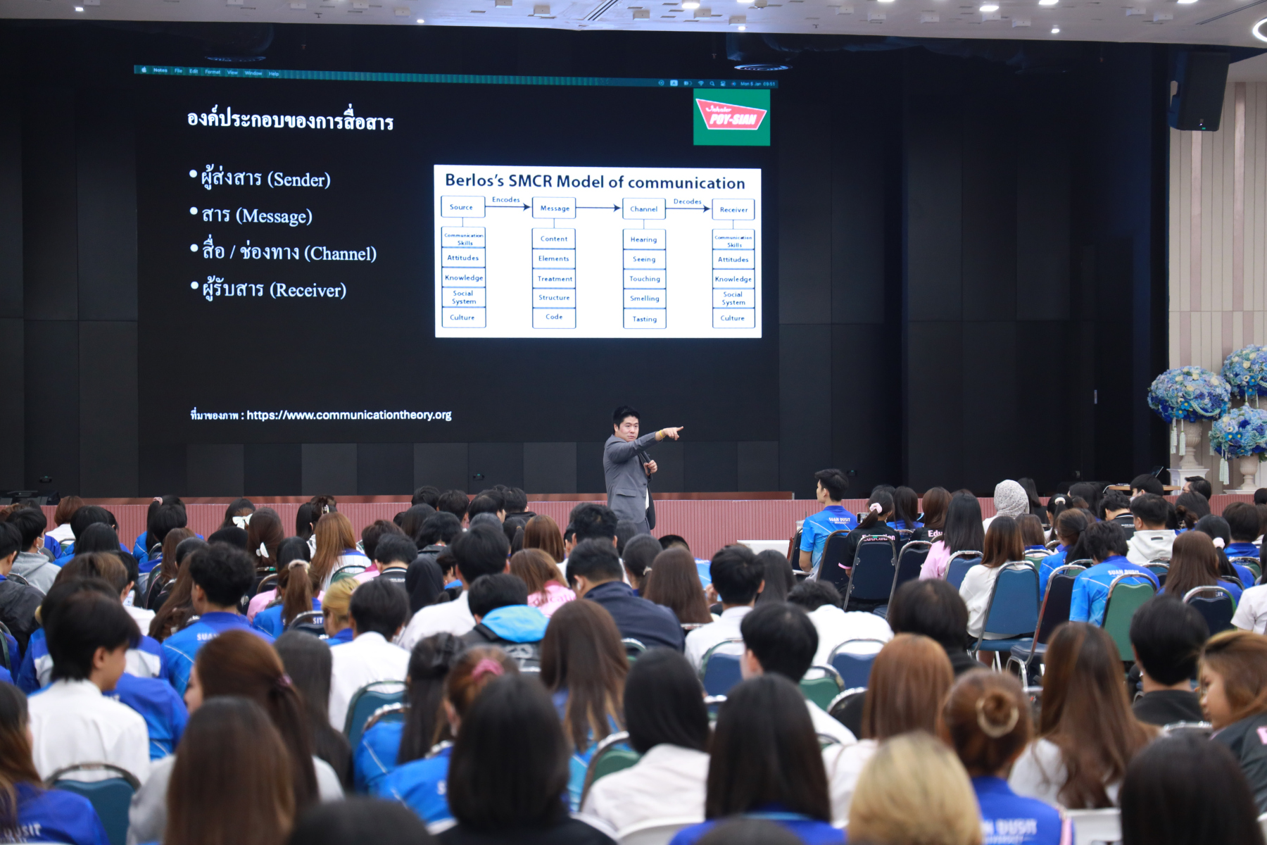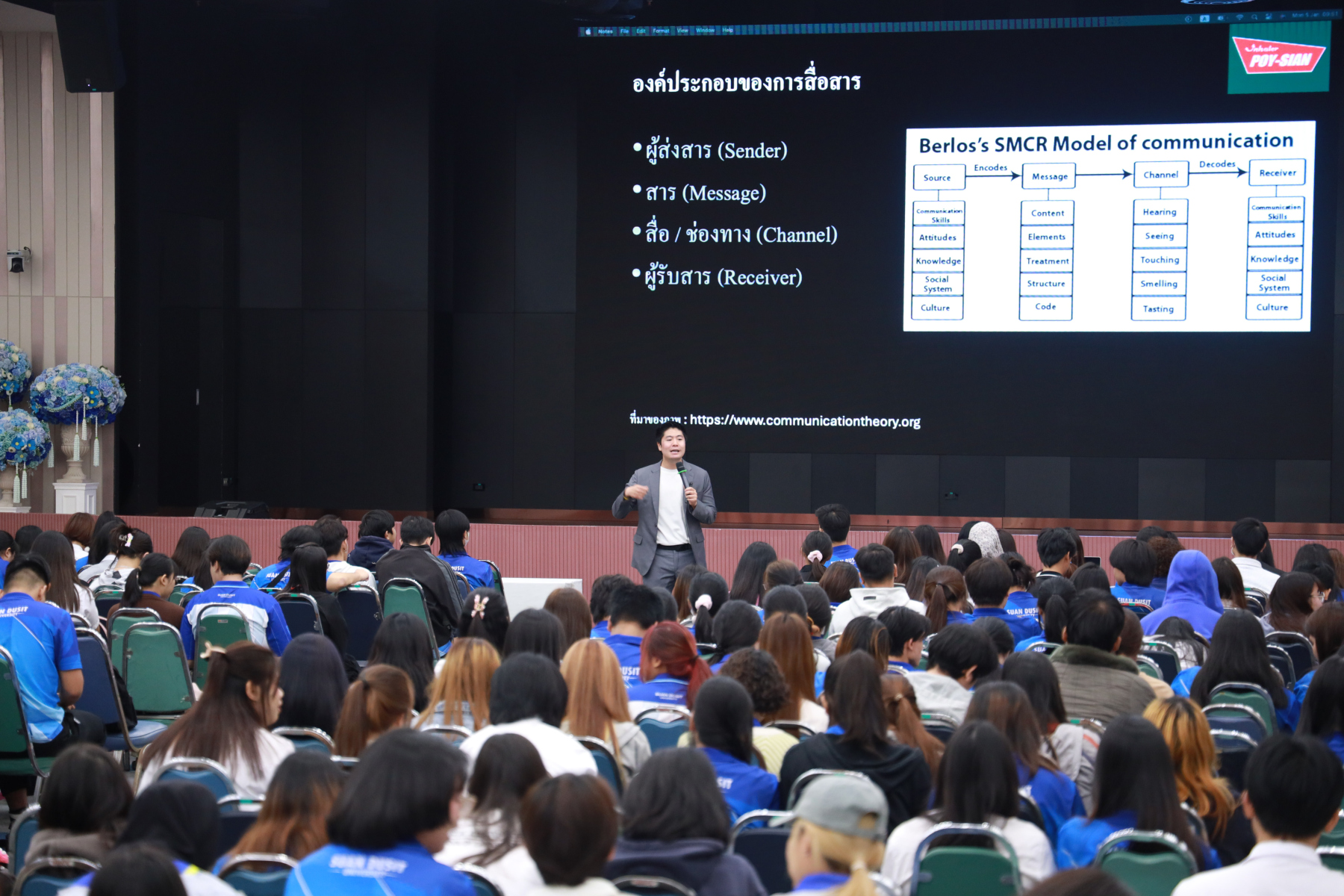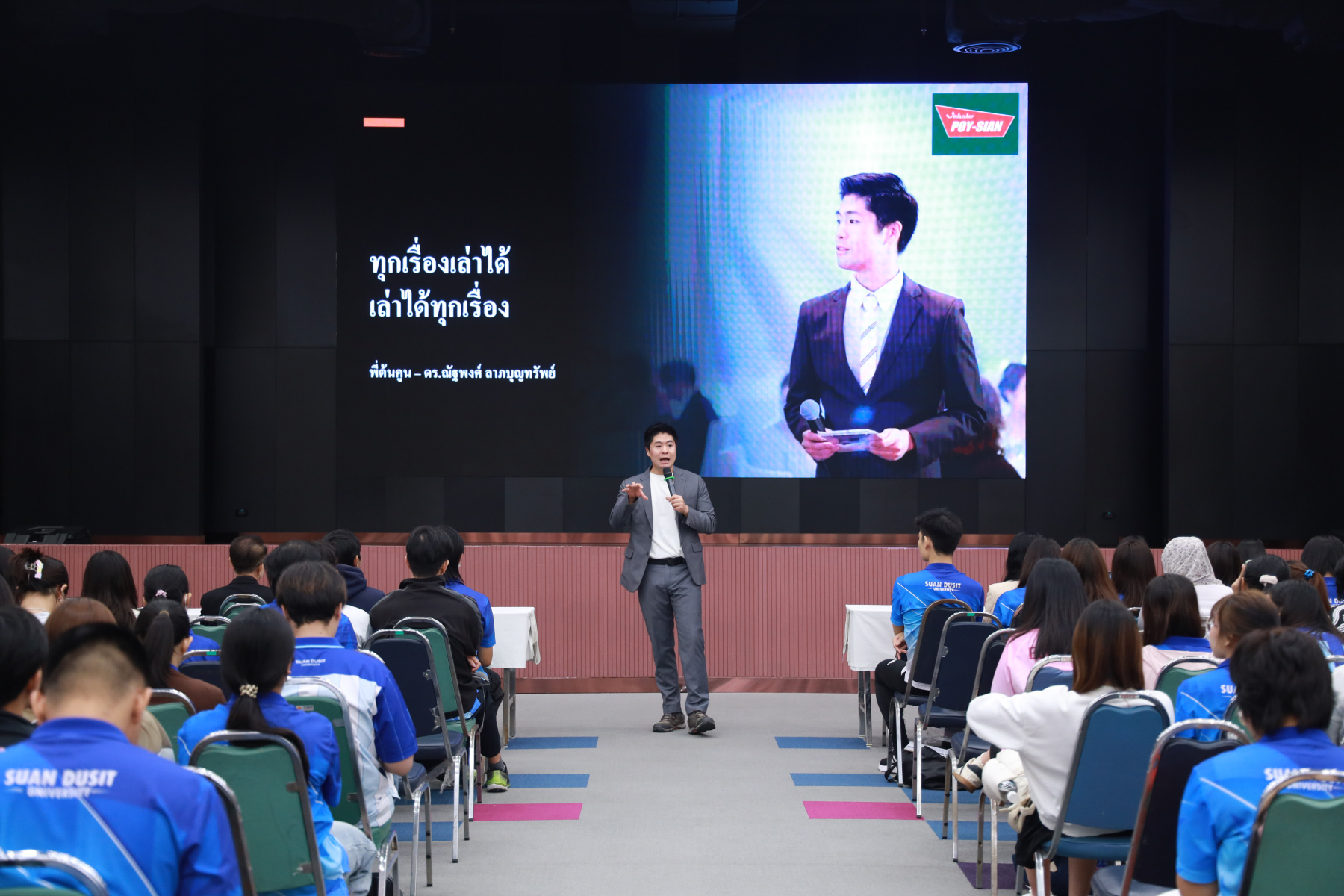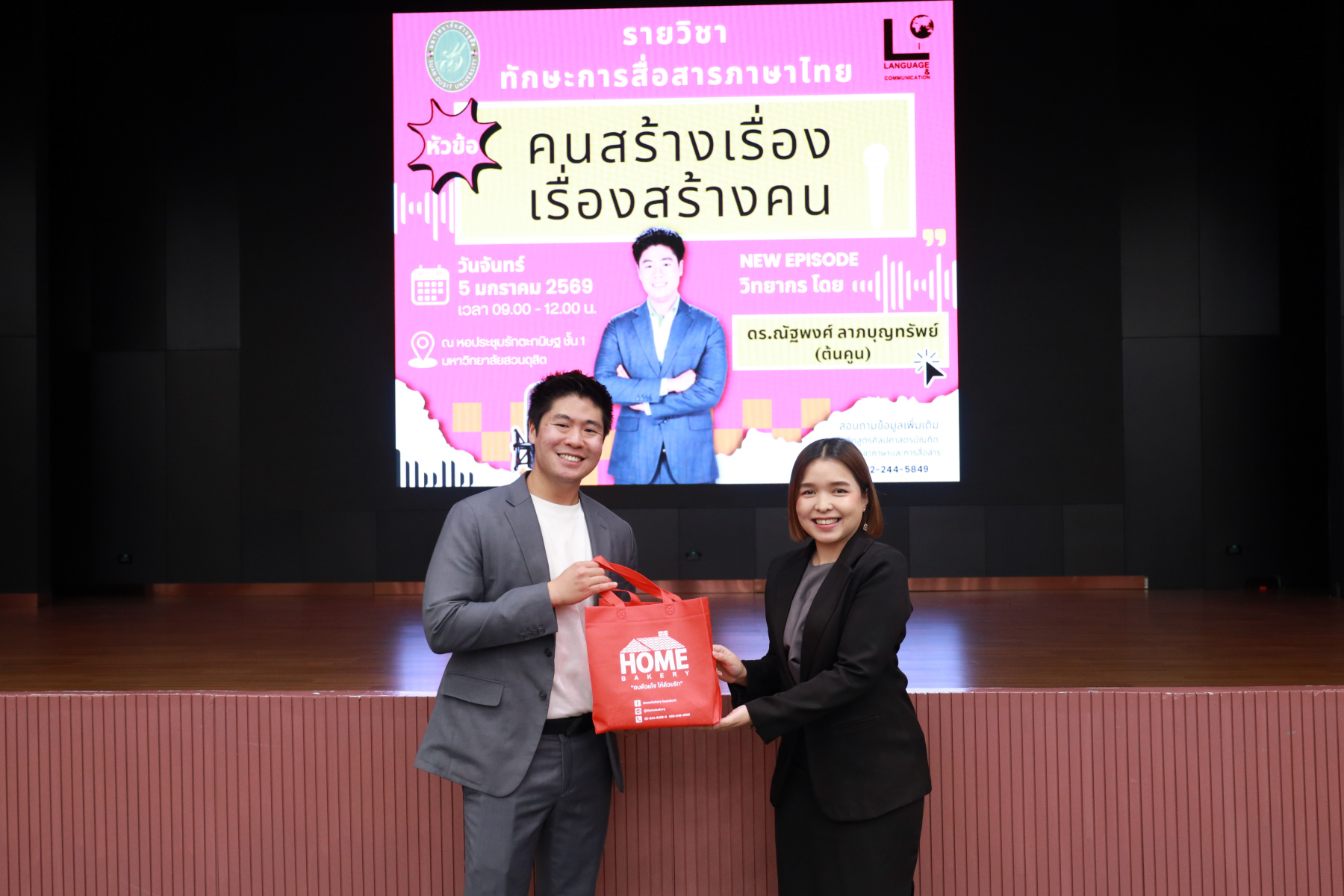 หลักสูตรศิลปศาสตรบัณฑิต สาขาวิชาภาษาและการสื่อสาร จัดโครงการ “พลังภาษาไทย” การพัฒนานักศึกษาเพื่อส่งเสริมทักษะการสื่อสารภาษาไทย ซึ่งเป็นส่วนหนึ่งของกิจกรรมการเรียนการสอนรายวิชาทักษะการสื่อสารภาษาไทย โดยได้รับเกียรติจาก ดร.ณัฐพงศ์ ลาภบุญทรัพย์ เป็นวิทยากรบรรยายในหัวข้อ “คนสร้างเรื่อง เรื่องสร้างคน” วันที่ 5 มกราคม 2569 ออนไซต์ ณ หอประชุมรักตะกนิษฐ ชั้น 1 และระบบออนไลน์ Zoom มหาวิทยาลัยสวนดุสิต