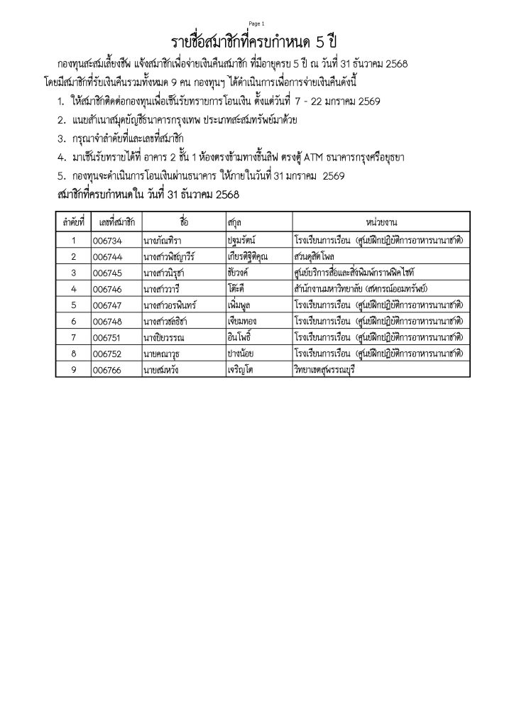กองทุนสะสมเลี้ยงชีพ แจ้งสมาชิกเพื่อจ่ายเงินคืนสมาชิก ที่มีอายุครบ 5 ปี ณ วันที่ 31 ธันวาคม 2568