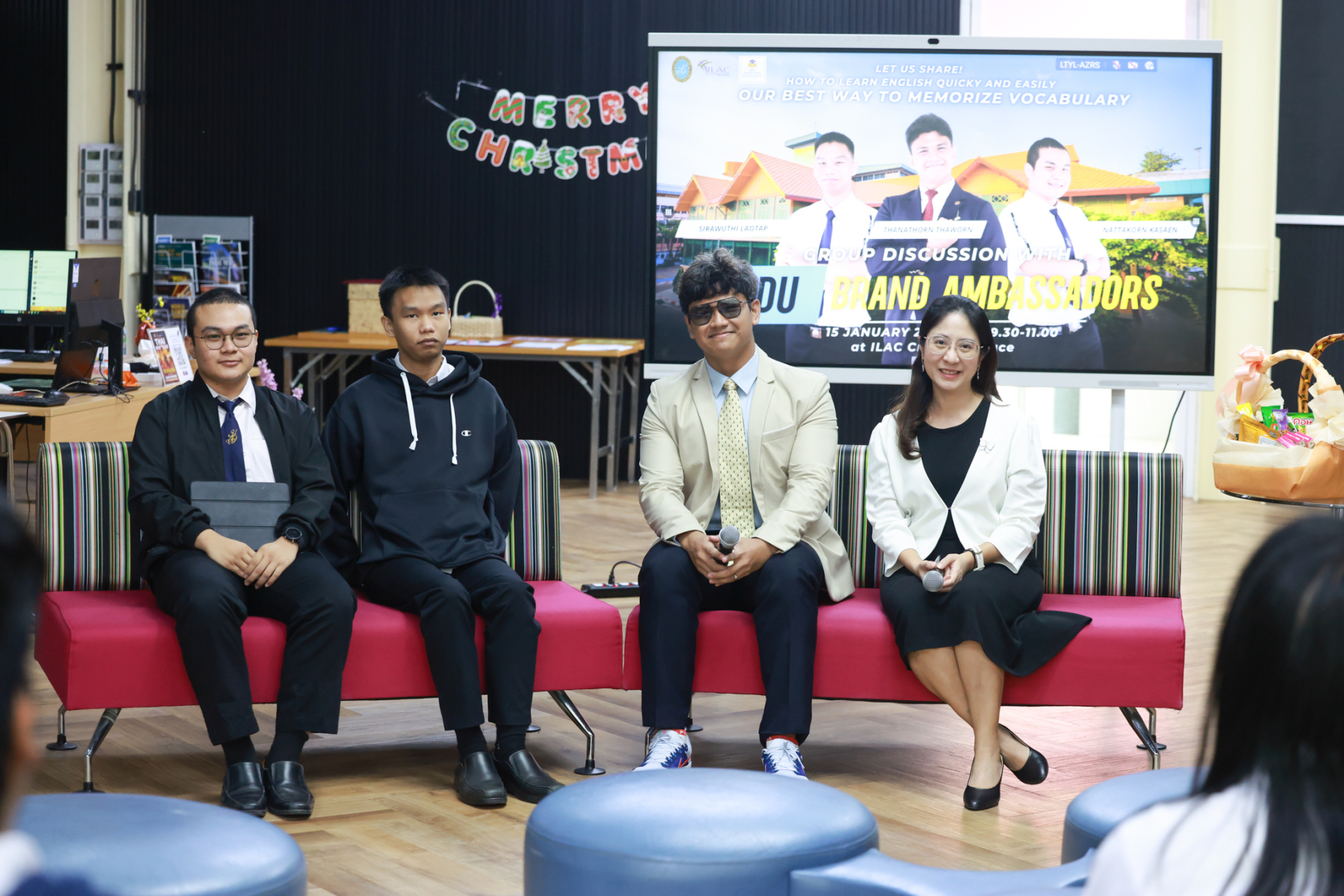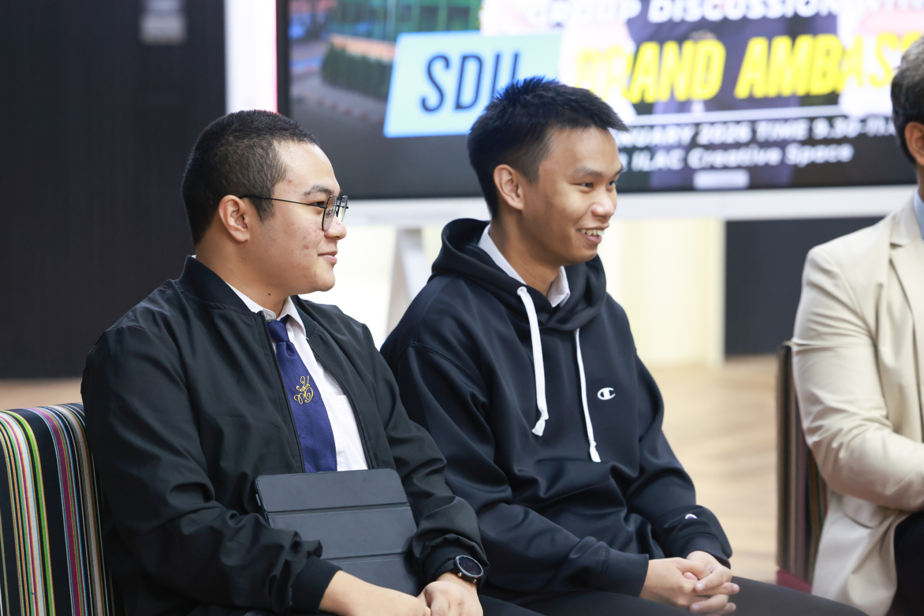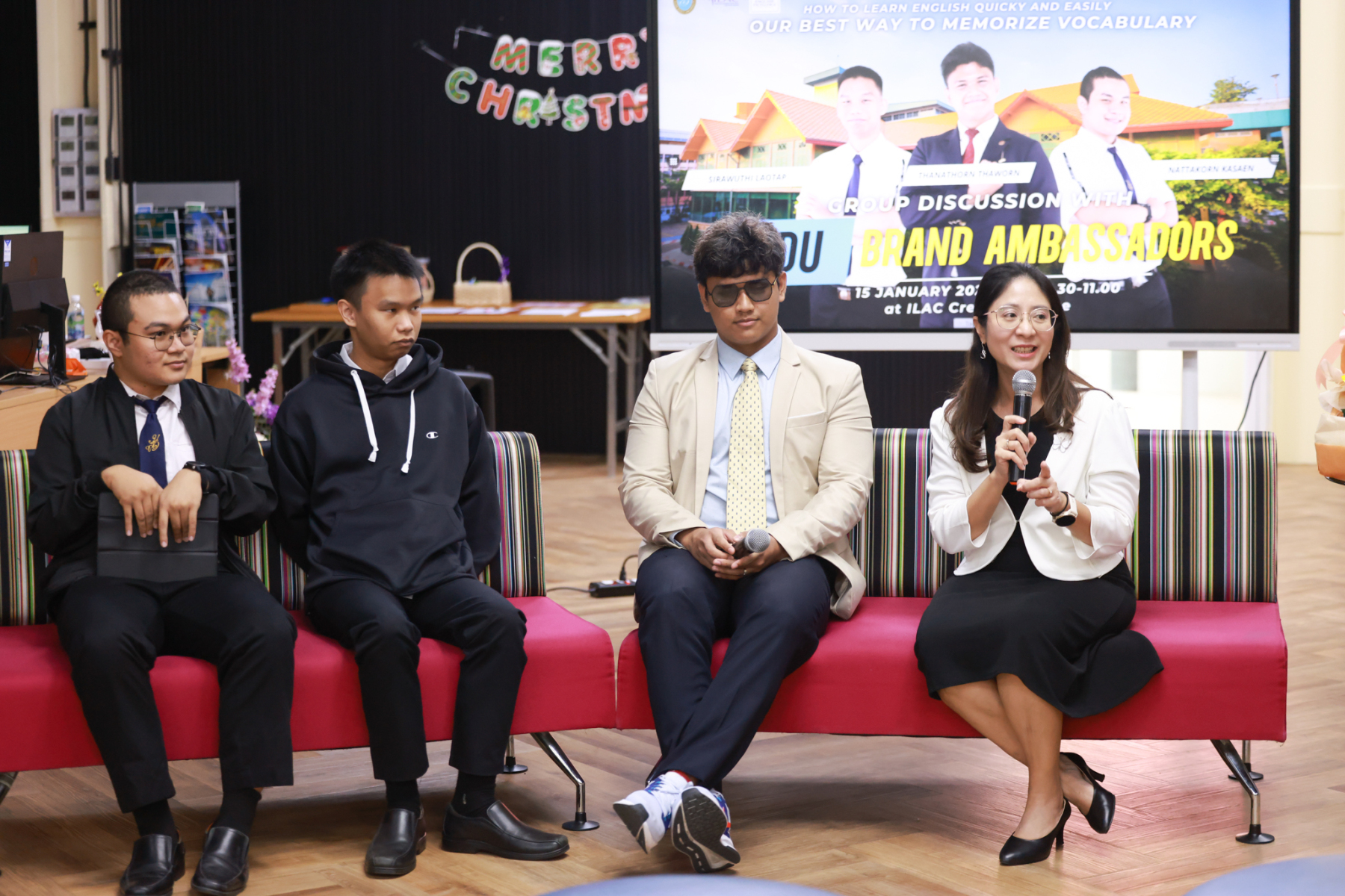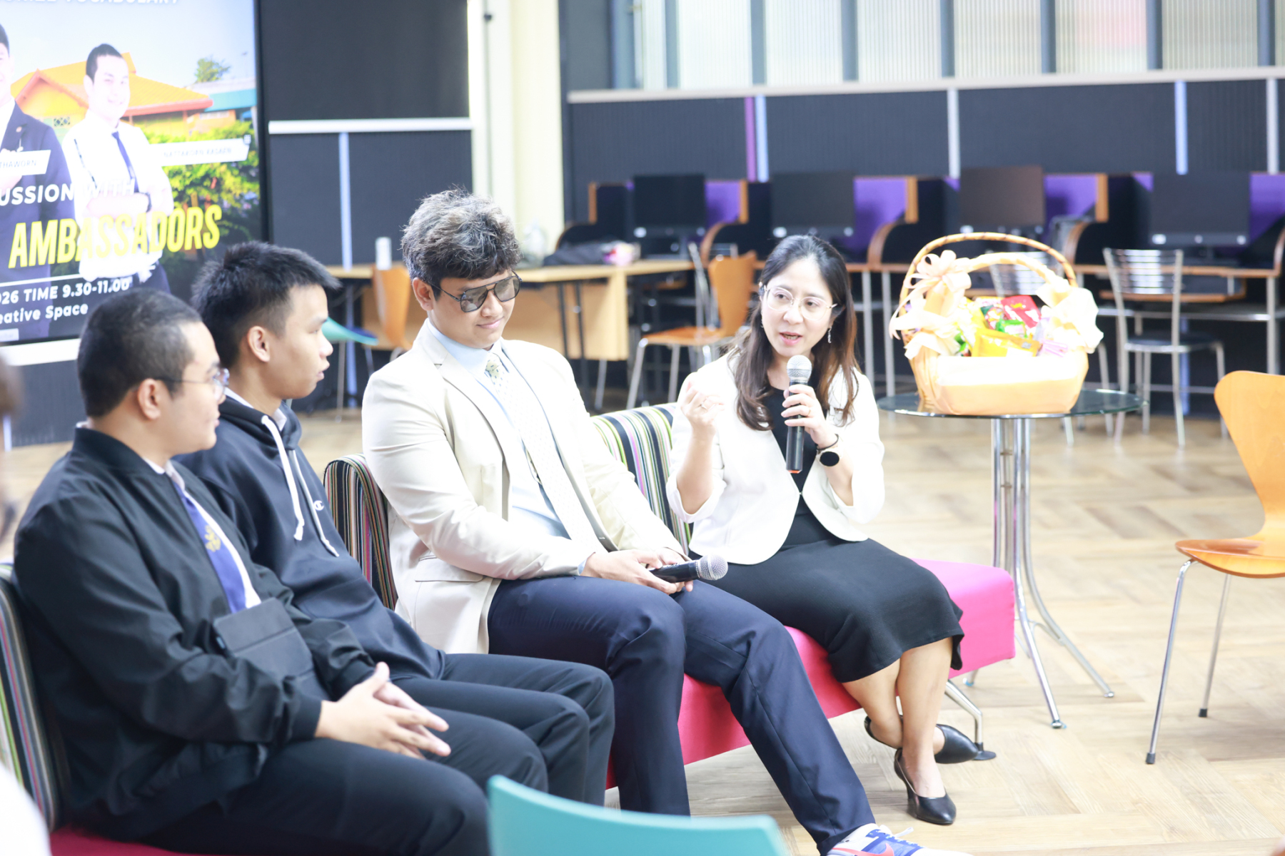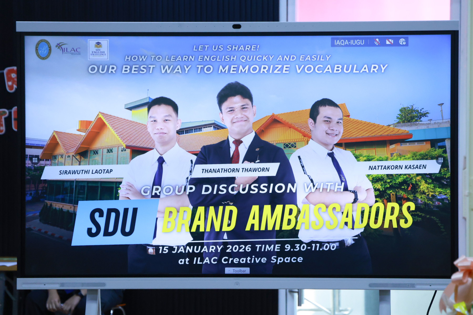 สถาบันภาษา ศิลปะและวัฒนธรรม มหาวิทยาลัยสวนดุสิต จัดกิจกรรม Group Discussion with SDU Brand Ambassador  (ช่วงเช้า) โดยมี ผู้ช่วยศาสตราจารย์ ดร.ณัฐพรโอวาทนุพัฒน์ รองผู้อำนวยการสถาบันภาษา ศิลปะและวัฒนธรรม กล่าวเปิดกิจกรรม ร่วมแลกเปลี่ยน โดย นายธนธรณ์ ถาวร นายสิรวุฒิ เหล่าทัพ และนายณัฏฐกร กาแสน นักศึกษามหาวิทยาลัยสวนดุสิต SDU Brand Ambassador เมื่อวันพฤหัสบดีที่ 15 มกราคม 2569 ห้อง ILAC Creative Space อาคาร 1 ชั้น 2
