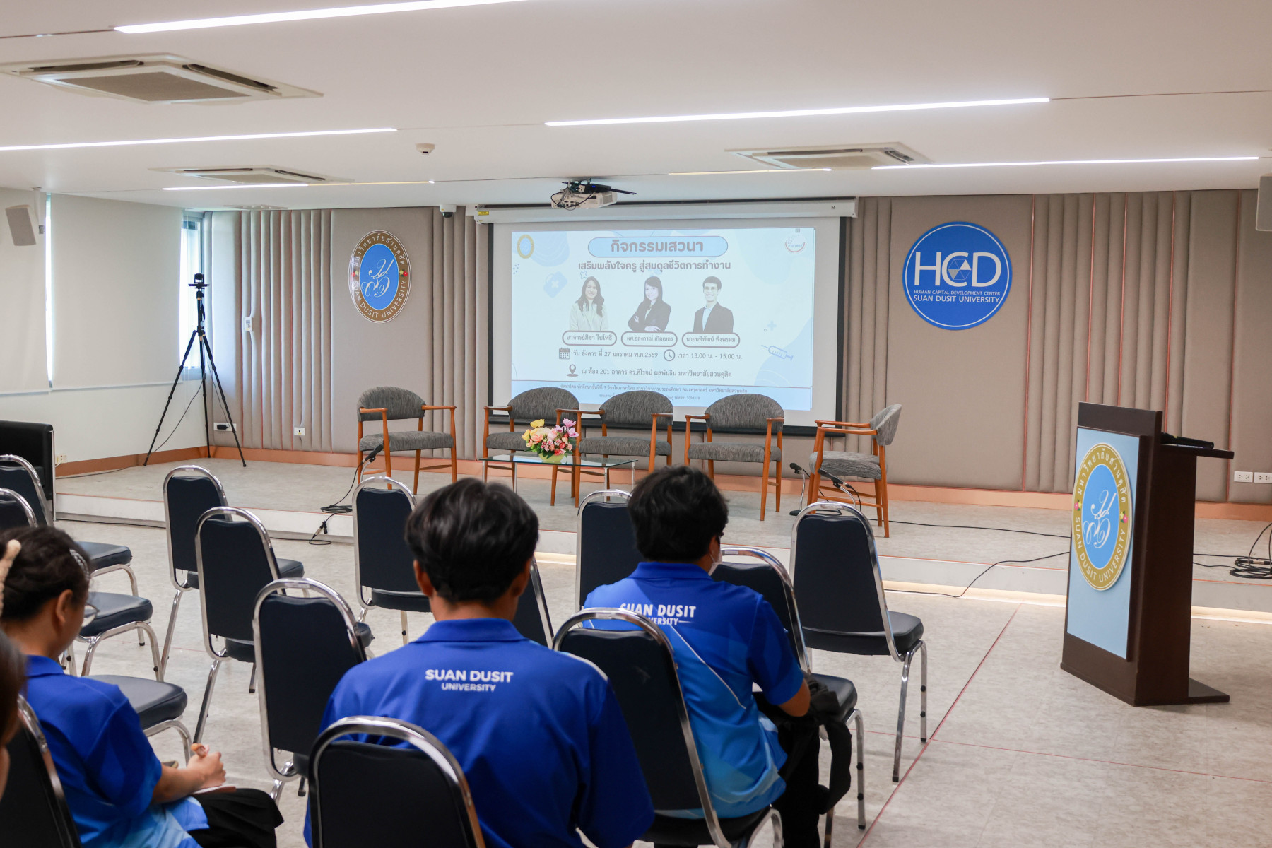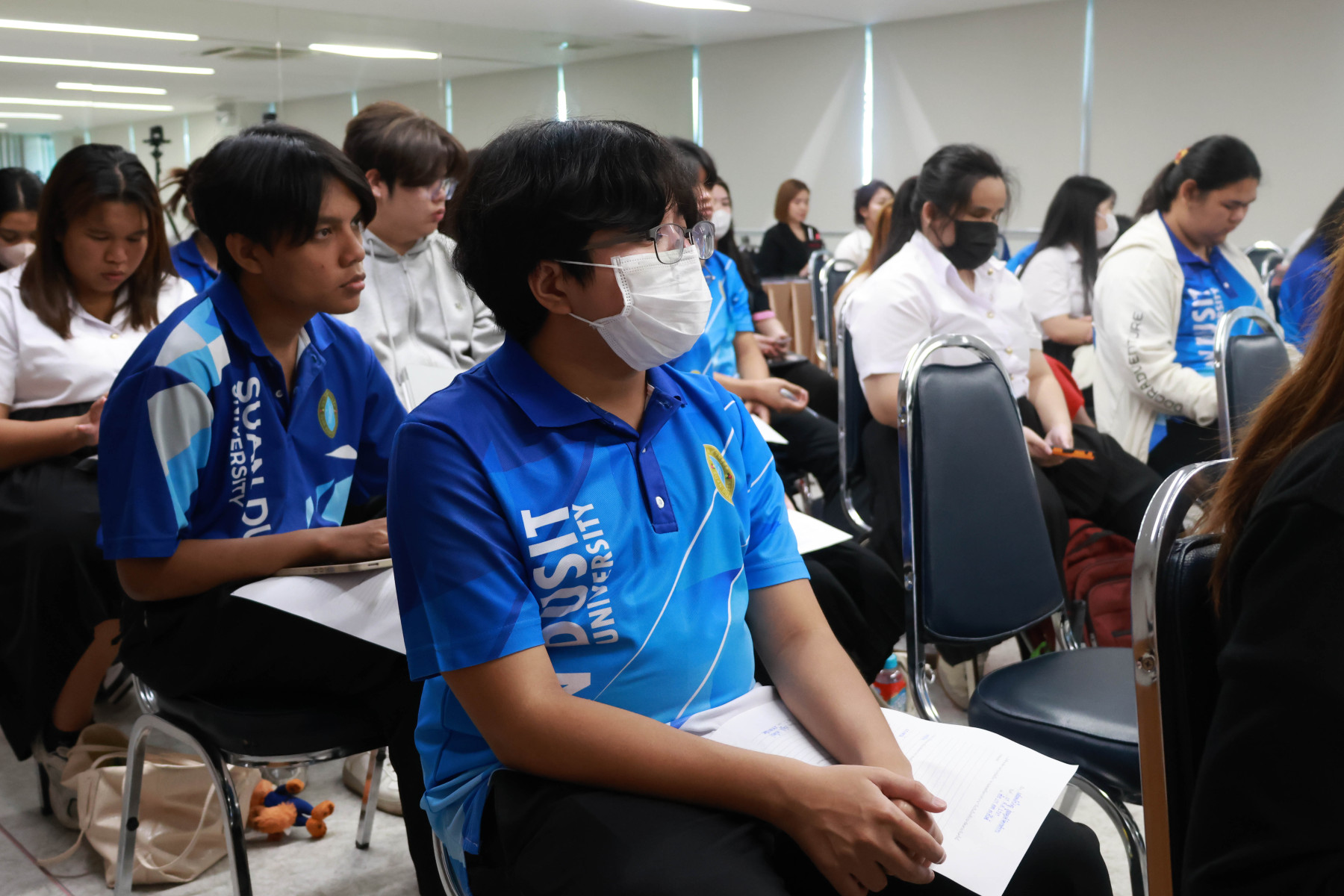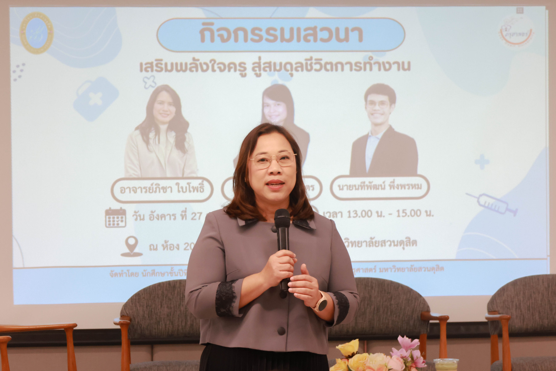 นักศึกษาชั้นปีที่ 3 วิชาโทภาษาไทย สาขาวิชาการประถมศึกษา คณะครุศาสตร์ มหาวิทยาลัยสวนดุสิต จัดกิจกรรมการเสวนาในหัวข้อ “เสริมพลังใจครู สู่สมดุลชีวิตการทำงาน” เพื่อเปิดพื้นที่แห่งการเรียนรู้และแลกเปลี่ยนมุมมองเกี่ยวกับการรู้เท่าทันสภาวะทางอารมณ์และะภาวะหมดไฟ การร่วมกันขับเคลื่อนวัฒนธรรม และะที่สำคัญที่สุดคือการสร้างภูมิคุ้มกันทางใจเพื่อให้ครูและนักศึกษาครูรุ่นใหม่ ซึ่งกิจกรรมดังกล่าวเป็นส่วนหนึ่งของการเรียนการสอนรายวิชาวาทวิทยาสำหรับครู (1093518) โดย ผศ.ดร.ศุภศิริ บุญประเวศ เป็นผู้สอนรายวิชา และได้รับเกียรติจากวิทยากรทั้ง 3 ท่าน ได้แก่ ผศ.อลงกรณ์ เกิดเนตร อาจารย์ภิชา ใบโพธิ์ และนายนทีพัฒน์ พึ่งพรหม ร่วมให้ความรู้ และทักษะสำคัญสำหรับครูยุคใหม่ เพื่อให้ผู้เข้าร่วมนำไปปฏิบัติและประยุกต์ใช้ให้เหมาะสมและมีประสิทธิภาพ ณ อาคาร ดร.ศิโรจน์ ผลพันธิน มหาวิทยาลัยสวนดุสิต ชั้น 2 ห้อง 201