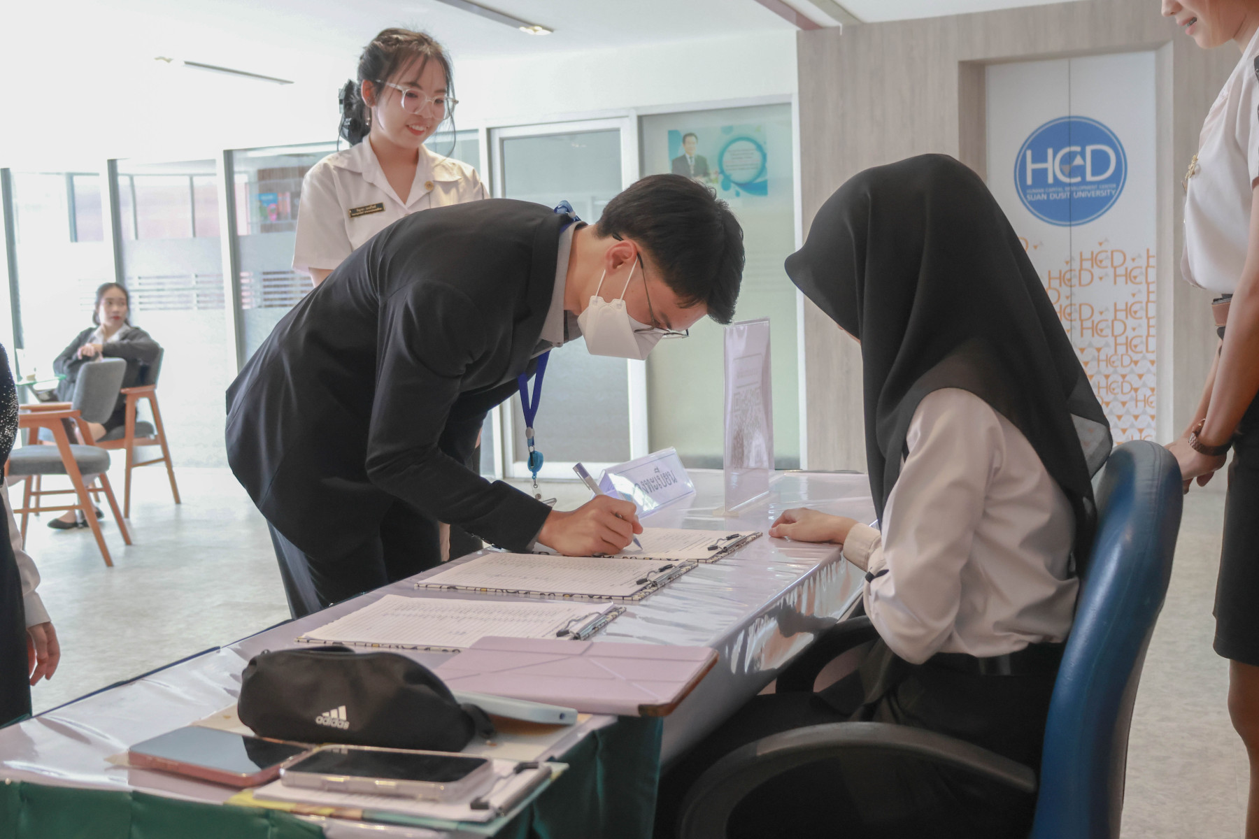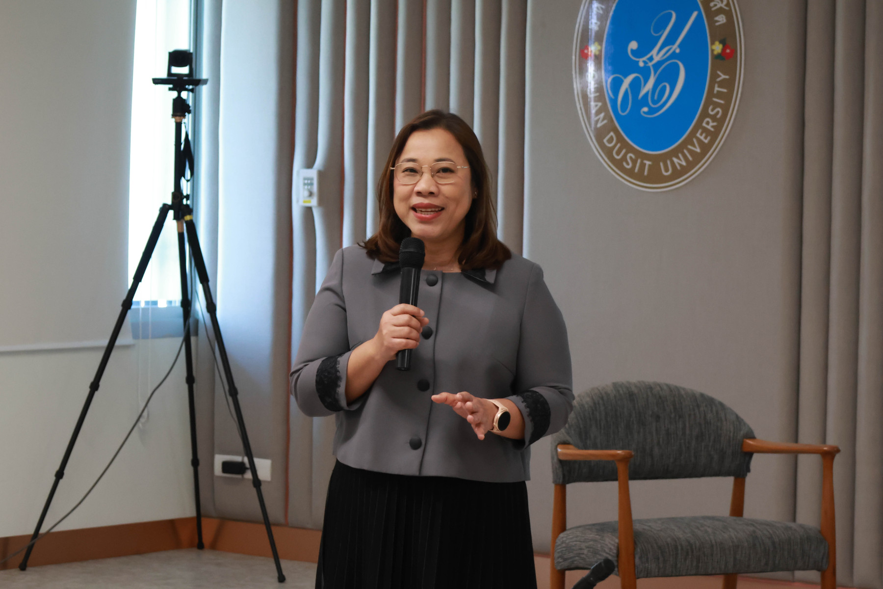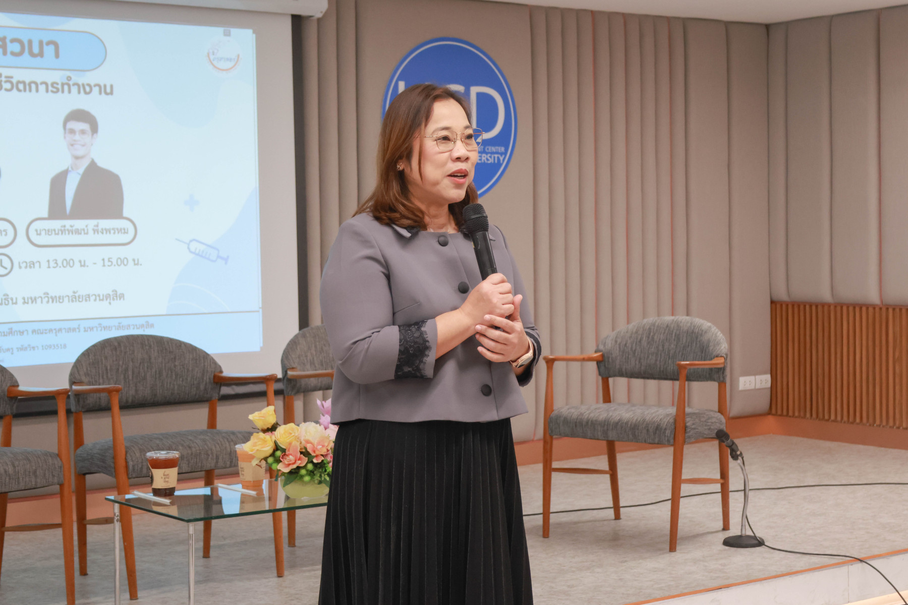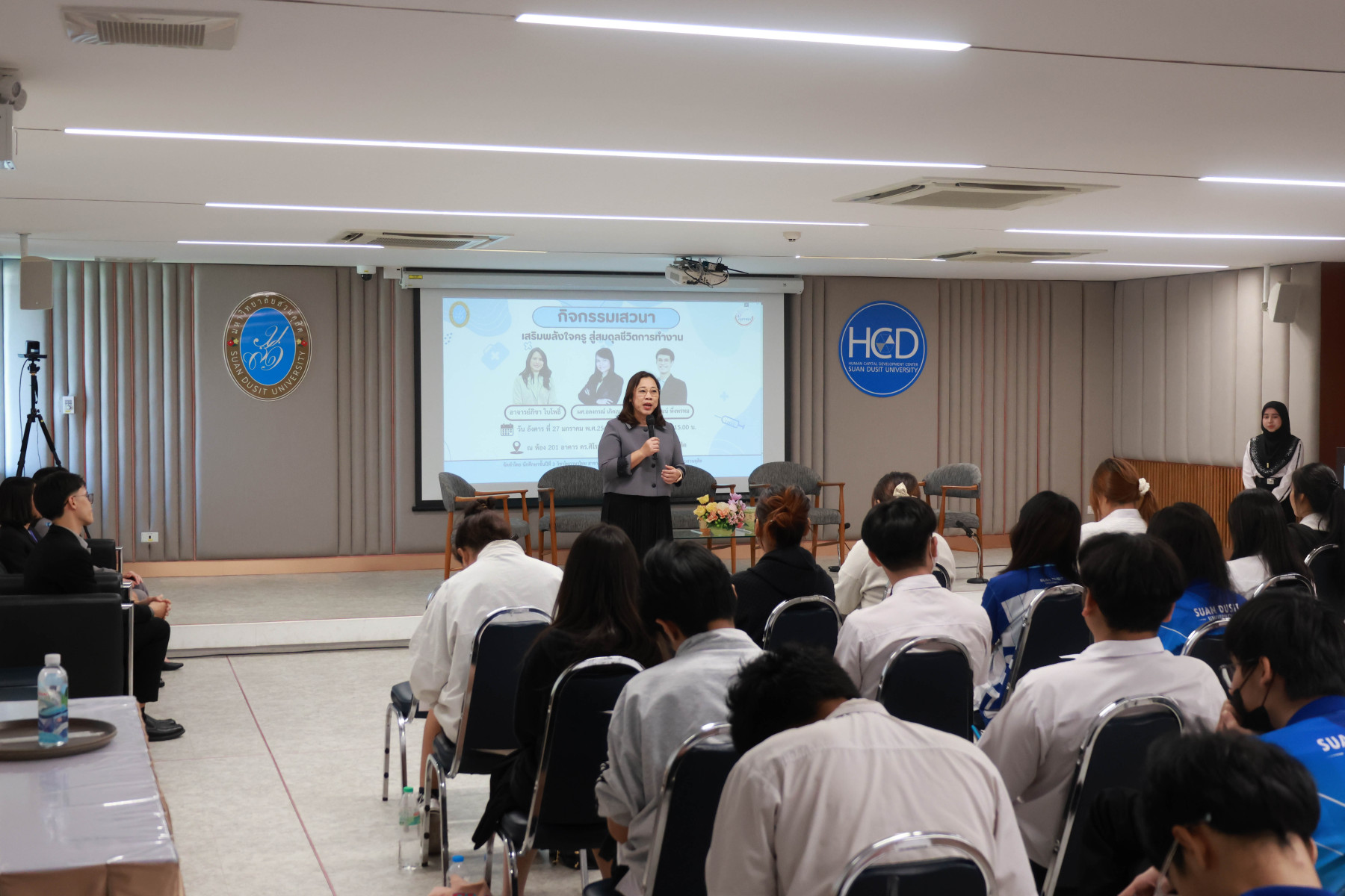 นักศึกษาชั้นปีที่ 3 วิชาโทภาษาไทย สาขาวิชาการประถมศึกษา คณะครุศาสตร์ มหาวิทยาลัยสวนดุสิต จัดกิจกรรมการเสวนาในหัวข้อ “เสริมพลังใจครู สู่สมดุลชีวิตการทำงาน” เพื่อเปิดพื้นที่แห่งการเรียนรู้และแลกเปลี่ยนมุมมองเกี่ยวกับการรู้เท่าทันสภาวะทางอารมณ์และะภาวะหมดไฟ การร่วมกันขับเคลื่อนวัฒนธรรม และะที่สำคัญที่สุดคือการสร้างภูมิคุ้มกันทางใจเพื่อให้ครูและนักศึกษาครูรุ่นใหม่ ซึ่งกิจกรรมดังกล่าวเป็นส่วนหนึ่งของการเรียนการสอนรายวิชาวาทวิทยาสำหรับครู (1093518) โดย ผศ.ดร.ศุภศิริ บุญประเวศ เป็นผู้สอนรายวิชา และได้รับเกียรติจากวิทยากรทั้ง 3 ท่าน ได้แก่ ผศ.อลงกรณ์ เกิดเนตร อาจารย์ภิชา ใบโพธิ์ และนายนทีพัฒน์ พึ่งพรหม ร่วมให้ความรู้ และทักษะสำคัญสำหรับครูยุคใหม่ เพื่อให้ผู้เข้าร่วมนำไปปฏิบัติและประยุกต์ใช้ให้เหมาะสมและมีประสิทธิภาพ ณ อาคาร ดร.ศิโรจน์ ผลพันธิน มหาวิทยาลัยสวนดุสิต ชั้น 2 ห้อง 201