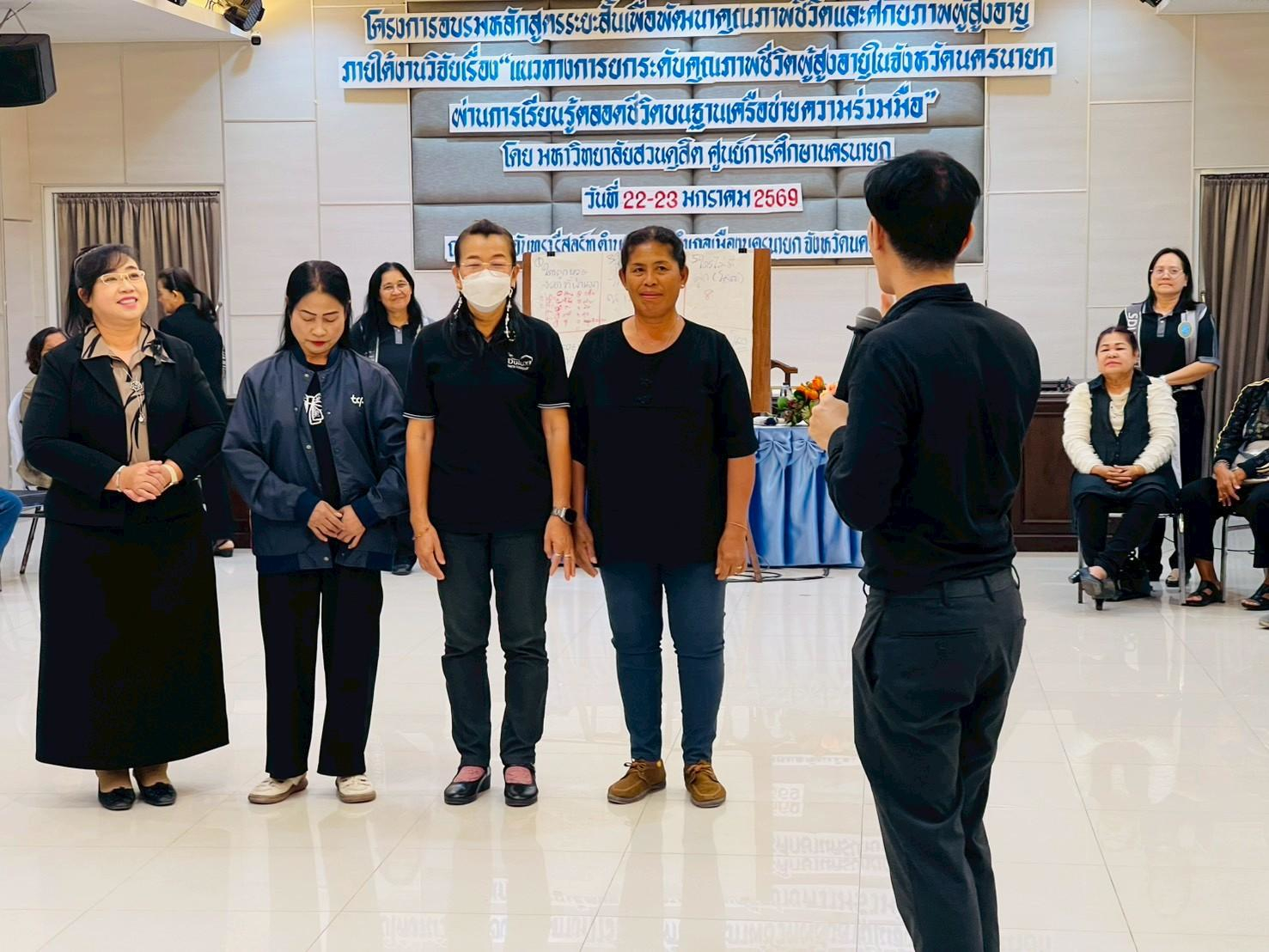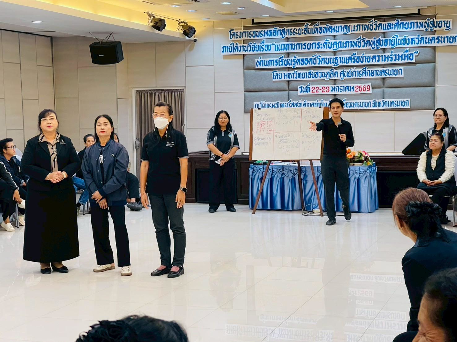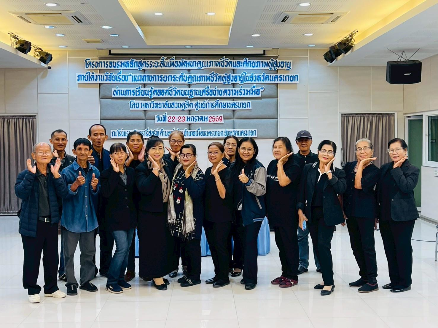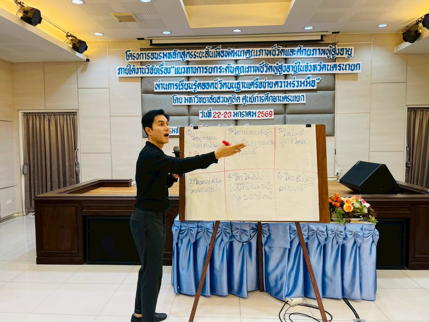 มหาวิทยาลัยสวนดุสิต ศูนย์การศึกษา นครนายก จัดอบรมหลักสูตรระยะสั้น ภายใต้งานวิจัย เรื่อง “แนวทางการยกระดับคุณภาพชีวิตผู้สูงอายุในจังหวัดนครนายกผ่านการเรียนรู้ตลอดชีวิตบนฐานเครือข่ายความร่วมมือ” ภายใต้แผนงานการพัฒนากลไกและข้อเสนอเชิงนโยบายการพัฒนาการเรียนรู้ตลอดชีวิตเพื่อสร้างโอกาสและลดความเหลื่อมล้ำของคนในพื้นที่จังหวัดนครนายก  โดยมีผู้ช่วยศาสตราจารย์ ว่าที่ร้อยตรีหญิง ดร.ขวัญใจ จริยาทัศน์กร อาจารย์ประจำหลักสูตรศึกษาศาสตรบัณฑิต สาขาวิชาการศึกษาปฐมวัย เป็นหัวหน้าโครงการวิจัย  กิจกรรมการอบรมครั้งนี้ มีผู้ช่วยศาสตราจารย์ ดร.พิสิทธิ์ โสภณพงศพัฒน์ เป็นวิทยากรให้ความรู้แก่ผู้เข้าร่วมอบรมจากโรงเรียนผู้สูงอายุตำบลวังกระโจม, โรงเรียนผู้สูงอายุตำบลบางสมบูรณ์, ชมรมผู้สูงอายุบ้านเขาเพิ่ม และโรงเรียนผู้สูงอายุตำบลหนองแสง จังหวัดนครนายก ในวันที่ 23 มกราคม 2569 เวลา 09.00 – 16.00 น. ณ โรงแรมจันทรา รีสอร์ท จังหวัดนครนายก