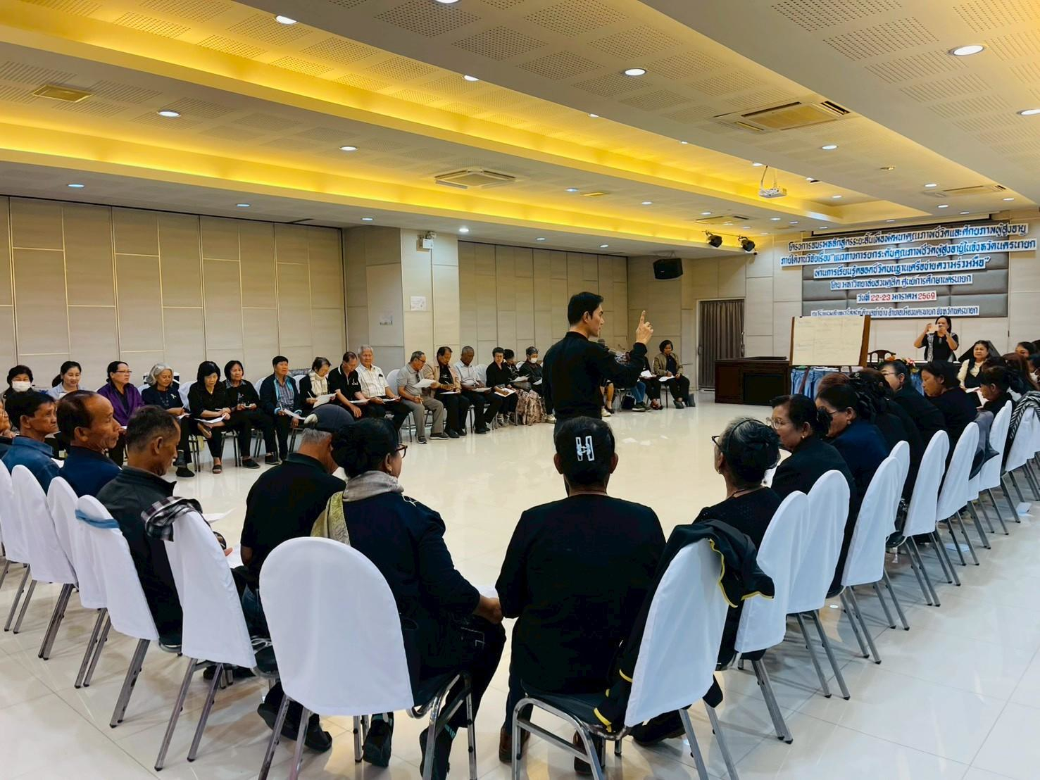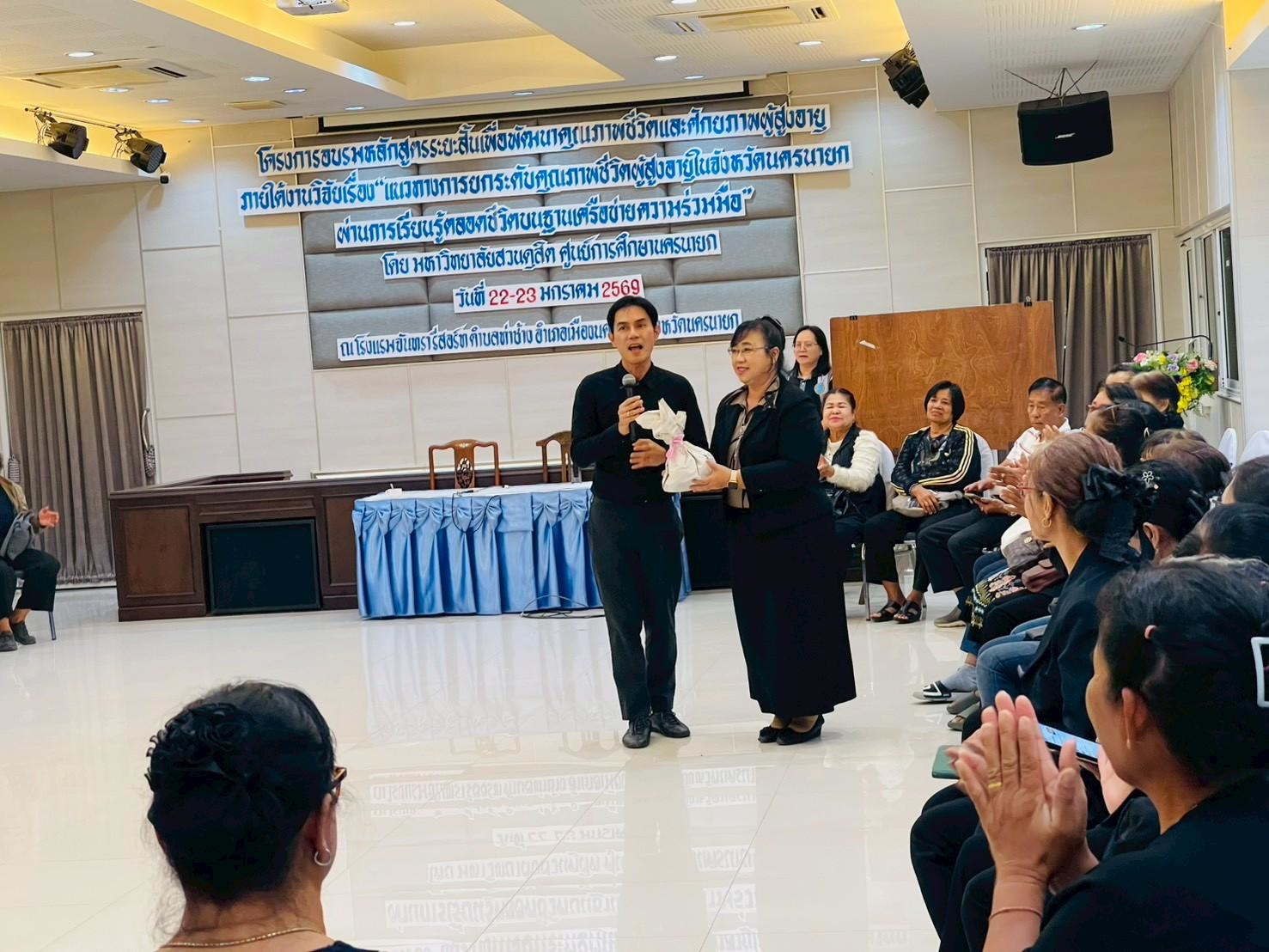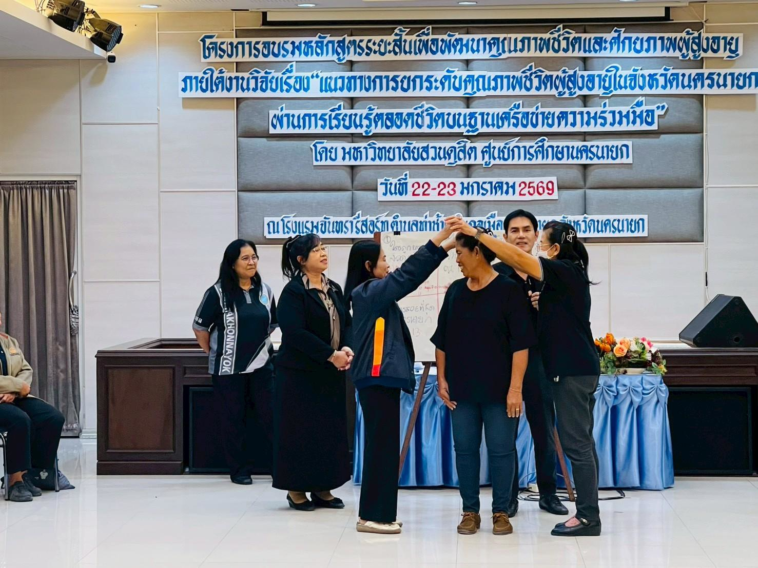 มหาวิทยาลัยสวนดุสิต ศูนย์การศึกษา นครนายก จัดอบรมหลักสูตรระยะสั้น ภายใต้งานวิจัย เรื่อง “แนวทางการยกระดับคุณภาพชีวิตผู้สูงอายุในจังหวัดนครนายกผ่านการเรียนรู้ตลอดชีวิตบนฐานเครือข่ายความร่วมมือ” ภายใต้แผนงานการพัฒนากลไกและข้อเสนอเชิงนโยบายการพัฒนาการเรียนรู้ตลอดชีวิตเพื่อสร้างโอกาสและลดความเหลื่อมล้ำของคนในพื้นที่จังหวัดนครนายก  โดยมีผู้ช่วยศาสตราจารย์ ว่าที่ร้อยตรีหญิง ดร.ขวัญใจ จริยาทัศน์กร อาจารย์ประจำหลักสูตรศึกษาศาสตรบัณฑิต สาขาวิชาการศึกษาปฐมวัย เป็นหัวหน้าโครงการวิจัย  กิจกรรมการอบรมครั้งนี้ มีผู้ช่วยศาสตราจารย์ ดร.พิสิทธิ์ โสภณพงศพัฒน์ เป็นวิทยากรให้ความรู้แก่ผู้เข้าร่วมอบรมจากโรงเรียนผู้สูงอายุตำบลวังกระโจม, โรงเรียนผู้สูงอายุตำบลบางสมบูรณ์, ชมรมผู้สูงอายุบ้านเขาเพิ่ม และโรงเรียนผู้สูงอายุตำบลหนองแสง จังหวัดนครนายก ในวันที่ 23 มกราคม 2569 เวลา 09.00 – 16.00 น. ณ โรงแรมจันทรา รีสอร์ท จังหวัดนครนายก