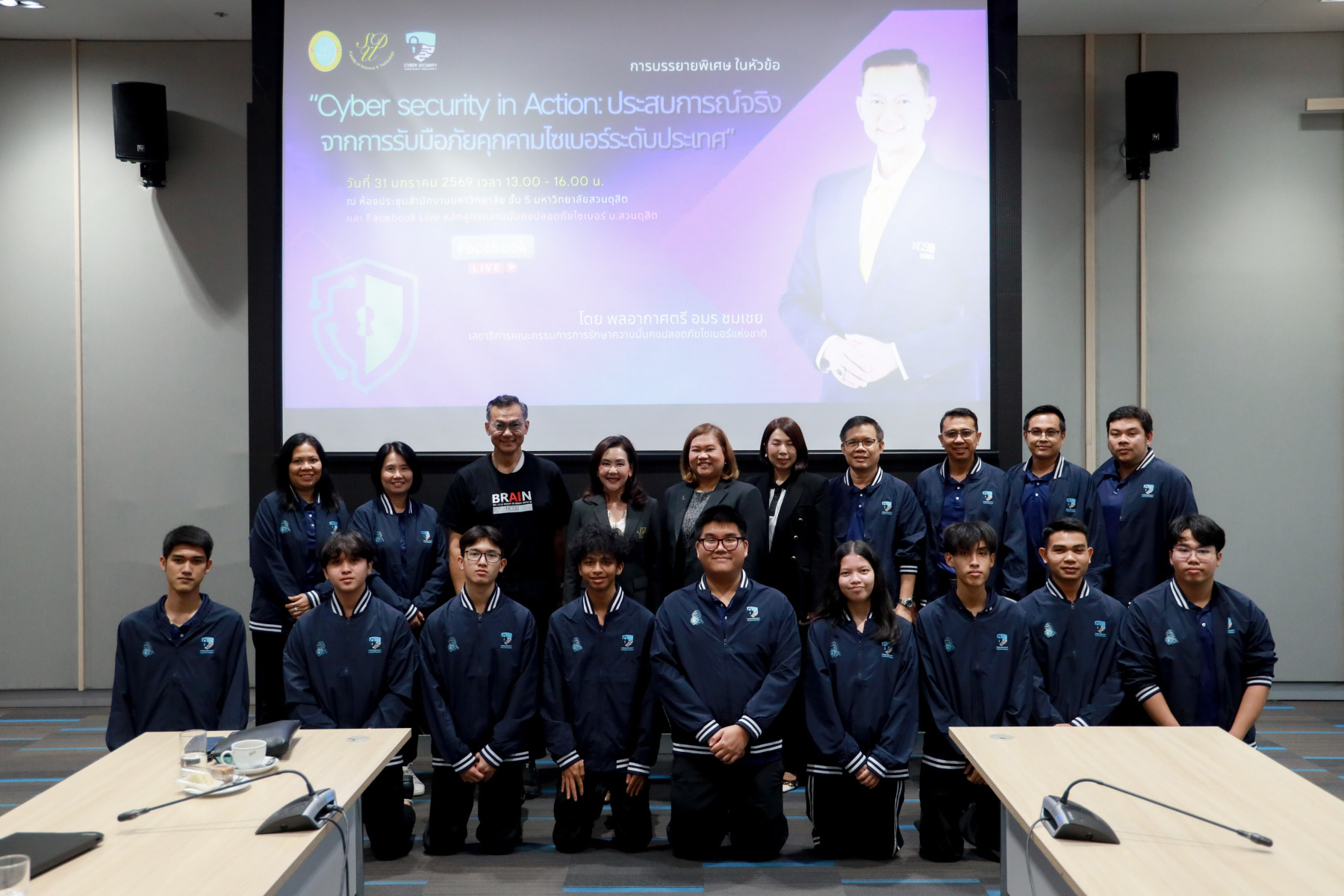 ผู้ช่วยศาสตราจารย์ ดร.พรชณิตว์ แก้วเนตร รองอธิการบดีฝ่ายวิชาการ และกิจการต่างประเทศมหาวิทยาลัยสวนดุสิต เป็นประธานเปิดการบรรยายพิเศษ ในหัวข้อ Cybersecurity in Action: ประสบการณ์จริงจากการรับมือภัยคุกคามไซเบอร์ระดับประเทศ โดยได้รับเกียรติจาก พลอากาศตรี อมร ชมเชย เลขาธิการคณะกรรมการการรักษาความมั่นคงปลอดภัยไซเบอร์แห่งชาติ และนายปิยชาติ วิสุทธิอารีย์รักษ์ เจ้าหน้าที่กลุ่มวิชาชีพเฉพาะด้านไซเบอร์ เป็นวิทยากรบรรยาย เมื่อวันที่ 31 มกราคม 2569 ณ ห้องประชุมสำนักงานมหาวิทยาลัย ชั้น 5 มหาวิทยาลัยสวนดุสิต