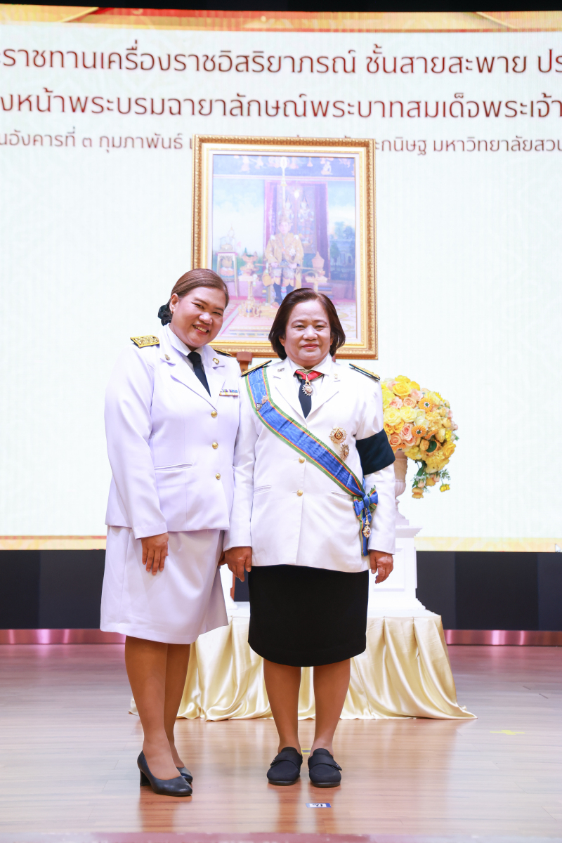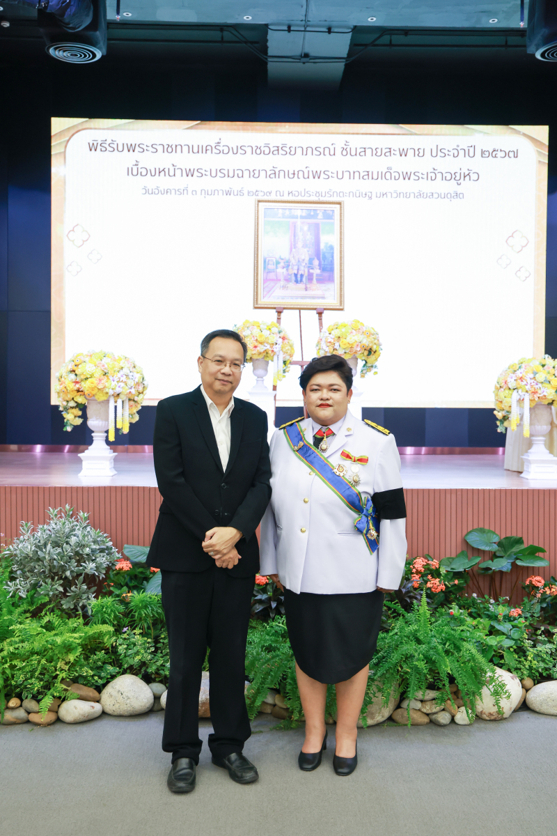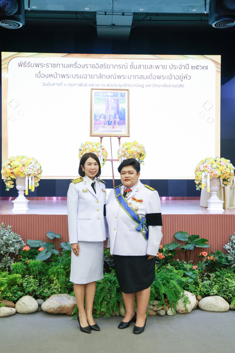มหาวิทยาลัยสวนดุสิต จัดพิธีรับพระราชทานเครื่องราชอิสริยาภรณ์ ชั้นสายสะพาย ประจำปี 2567 เบื้องหน้าพระบรมฉายาลักษณ์พระบาทสมเด็จพระเจ้าอยู่หัว โดยรองศาสตราจารย์ พัชรี สวนแก้ว รองอธิการบดีฝ่ายกิจการนักศึกษา ปฏิบัติการแทนอธิการบดีมหาวิทยาลัยสวนดุสิต เป็นประธานในพิธี ซึ่งมีผู้ได้รับพระราชทานเครื่องราชอิสริยาภรณ์ ชั้นสายสะพาย ประจำปี 2567 ชั้นประถมาภรณ์มงกุฎไทย จำนวนรวมทั้งสิ้น 6 ราย ได้แก่ ผศ.ดร.ชฎามาศ ขาวสะอาด ผศ.ศศิพันธุ์ เปี๊ยนเปี่ยมสิน ผศ.ดร.เอื้ออารี จันทร ผศ.ดร.ธีรเดช ชื่นประภานุสรณ์ ผศ.ดร.สรพล จิระสวัสดิ์ ผศ.ดร.ขนิษฐา ปาลโมกข์ พิธีรับพระราชทานเครื่องราชอิสริยาภรณ์ ชั้นสายสะพาย ประจำปี 2567 เบื้องหน้าพระบรมฉายาลักษณ์พระบาทสมเด็จพระเจ้าอยู่หัว จัดขึ้น ณ หอประชุมรักตะกนิษฐ ชั้น 1 มหาวิทยาลัยสวนดุสิต เมื่อวันที่ 3 กุมภาพันธ์ 2569