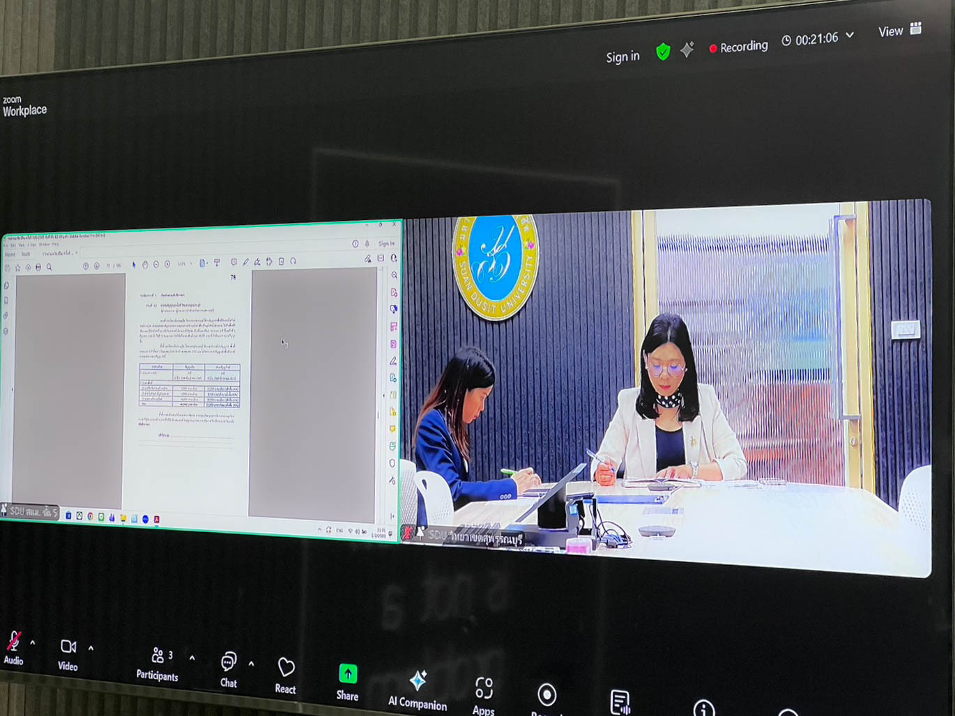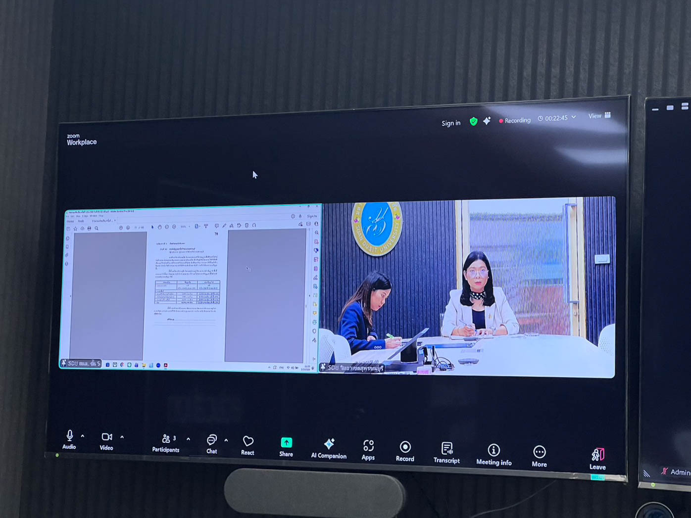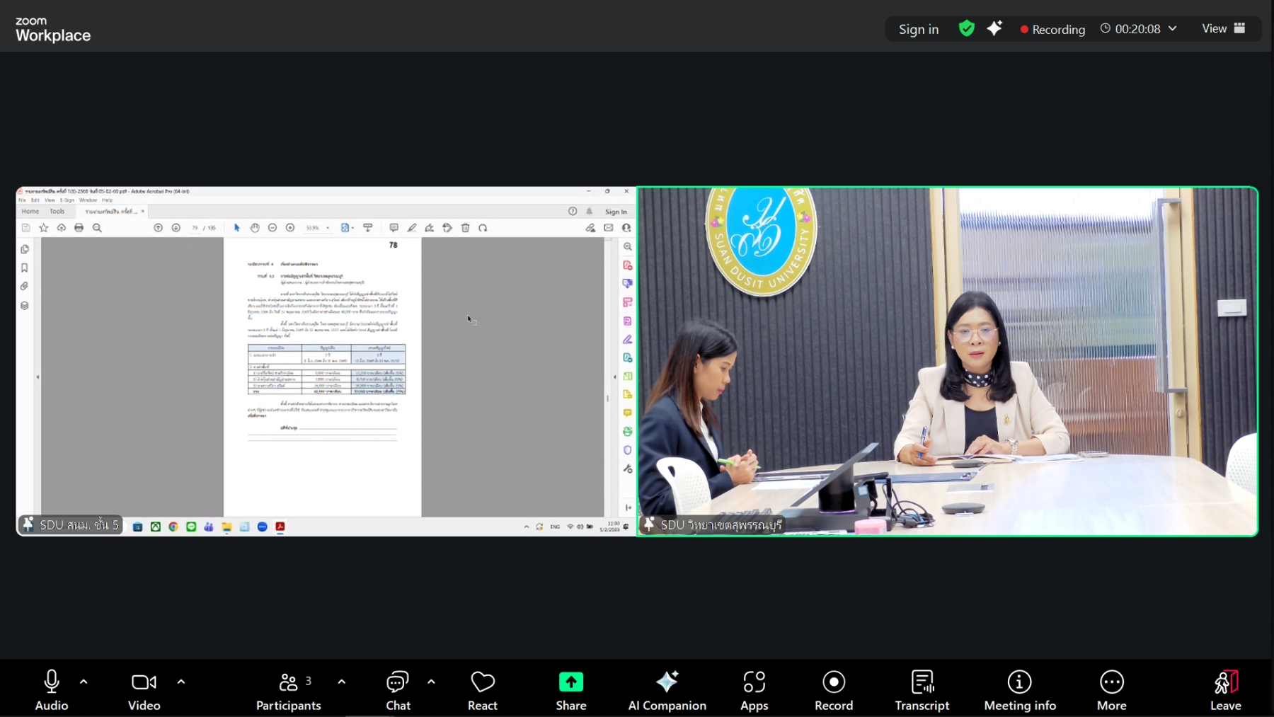 สำนักงานมหาวิทยาลัย จัดการประชุมคณะกรรมการบริหารทรัพย์สินของมหาวิทยาลัยสวนดุสิต ครั้งที่ 1(5)/2569 โดยมี รองศาสตราจารย์ ดร.ชนะศึก นิชานนท์ รองอธิการบดีฝ่ายบริหาร วิจัย และนวัตกรรม เป็นประธานการประชุม โดยมีวาระเรื่อง การขอแจ้งปิดร้าน U-Store ก่อนสิ้นสุดสัญญาเช่าพื้นที่ เรื่อง การจัดทำประกาศการจัดเก็บค่าธรรมเนียมห้องพักและค่าสาธารณูปโภคอาคารหอพักภายในมหาวิทยาลัยสวนดุสิต เรื่อง การต่อสัญญาเช่าพื้นที่ วิทยาเขตสุพรรณบุรี และเรื่อง การต่อสัญญาเช่าพื้นที่ ชมรมกีฬานครนายกเทควันโด ในวันที่ 5 กุมภาพันธ์ 2569 ณ ห้องประชุมสำนักงานมหาวิทยาลัย ชั้น 5 มหาวิทยาลัยสวนดุสิต โดย มหาวิทยาลัยสวนดุสิต วิทยาเขตสุพรรณบุรี นำโดย นางกัณณ์อลิน สุอังคะวาทิน ผู้อำนวยการสำนักงานวิทยาเขตสุพรรณบุรี พร้อมด้วยบุคลากร เข้าร่วมประชุมผ่านระบบ Online โปรแกรม Zoom Meeting ในวันพฤหัสบดีที่ 5 กุมภาพันธ์ 2569 เวลา 10.30 -12.00 น. ณ ห้องประชุม SDU Online 12 ชั้น 3 อาคารสวนแก้ว 1 มหาวิทยาลัยสวนดุสิต วิทยาเขตสุพรรณบุรี