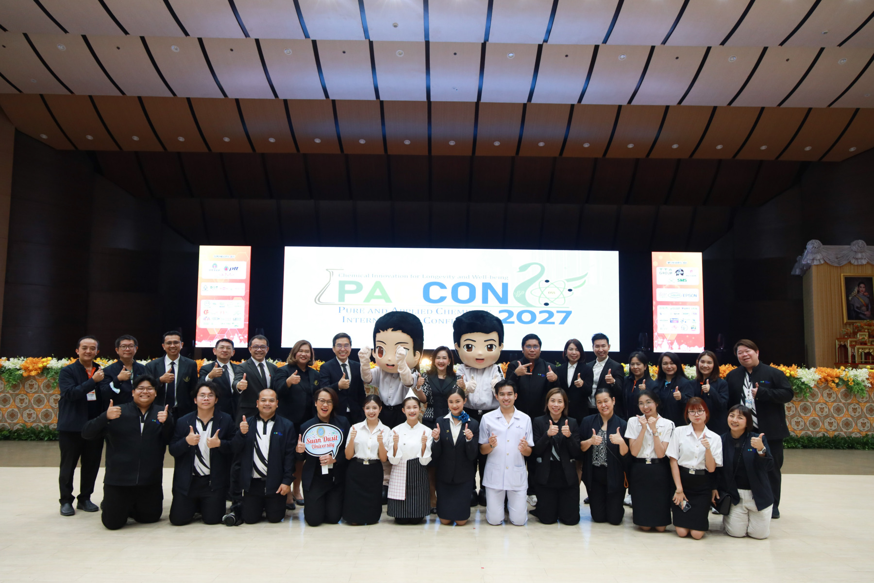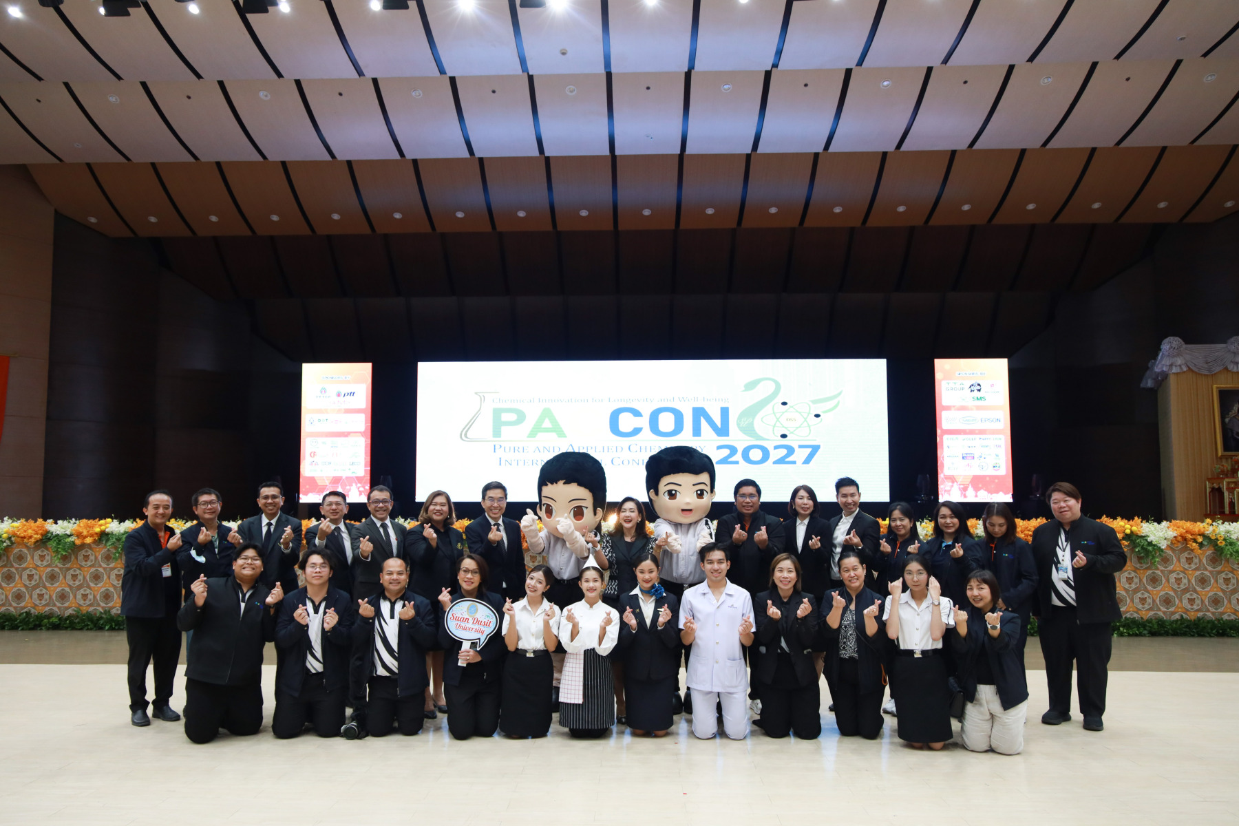 โอกาสนี้ มหาวิทยาลัยสวนดุสิต โดย ผศ.ดร.พรชณิตว์ แก้วเนตร รองอธิการบดีฝ่ายวิชาการ และกิจการต่างประเทศ และกรมวิทยาศาสตร์บริการ โดย ดร.พจมาน ท่าจีน รองอธิบดีกรมวิทยาศาสตร์บริการ และรักษาการอธิบดีกรมวิทยาศาสตร์บริการ ได้ร่วมกันรับมอบธงเพื่อเป็นเจ้าภาพร่วมในการจัดการประชุมวิชาการระดับนานาชาติ Pure and Applied Chemistry Conference (PACCON 2027) ซึ่งจะจัดขึ้นระหว่างวันที่ 11–13 กุมภาพันธ์ 2570 ณ ศูนย์ประชุมวายุภักดิ์โรงแรมเซ็นทารา ไลฟ์ แจ้งวัฒนะ กรุงเทพมหานคร ซึ่งการจัดประชุมวิชาการระดับนานาชาติ Pure and Applied Chemistry Conference (PACCON 2027) ถือเป็นอีกก้าวสำคัญในการส่งเสริมและพัฒนาวงการเคมีในประเทศไทยและระดับนานาชาติต่อไป