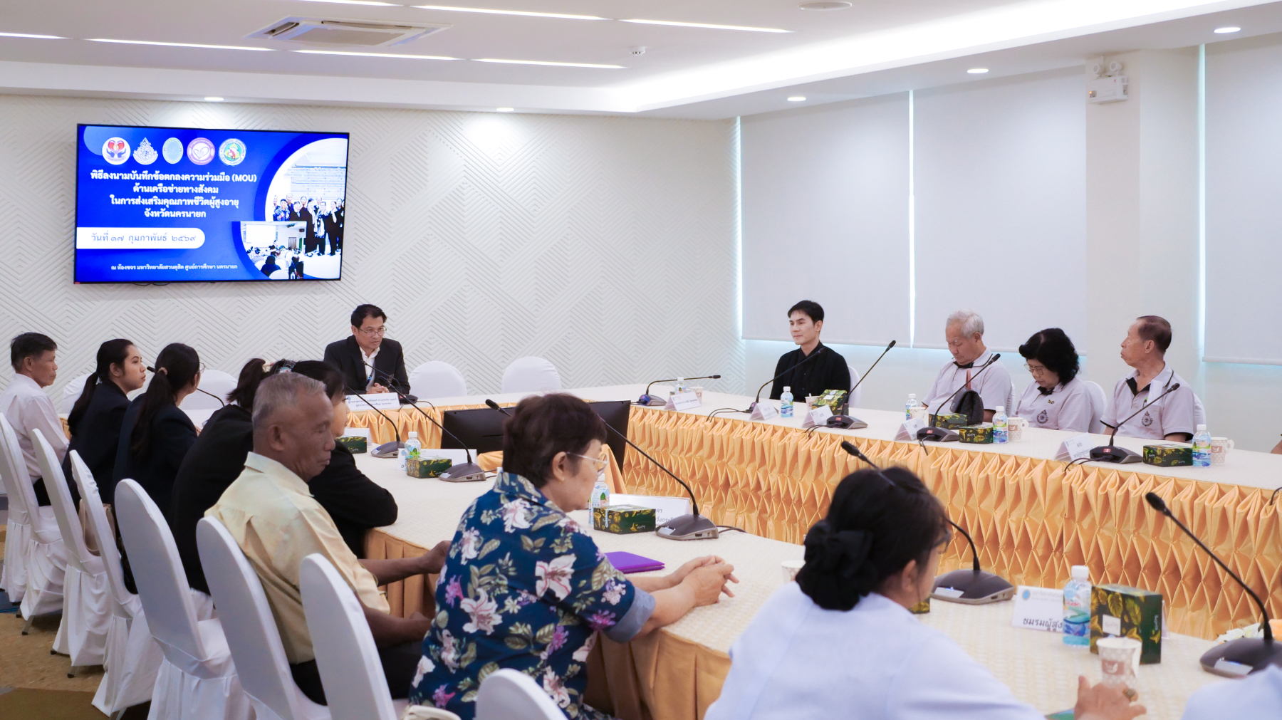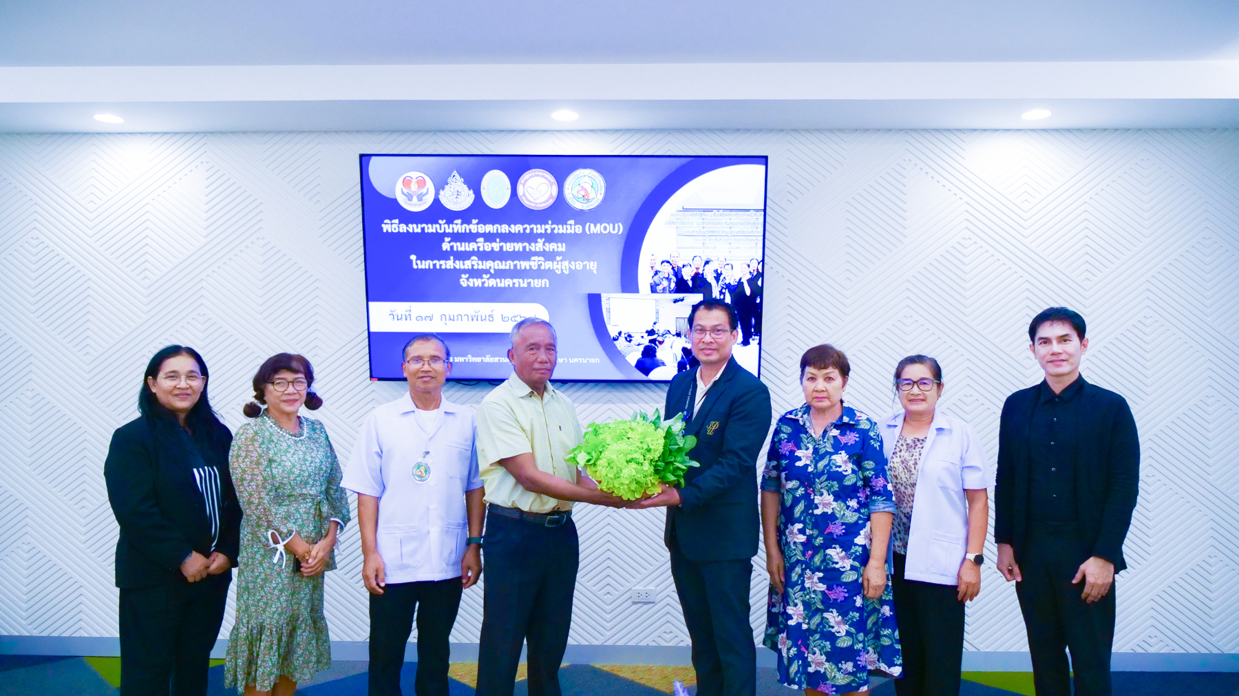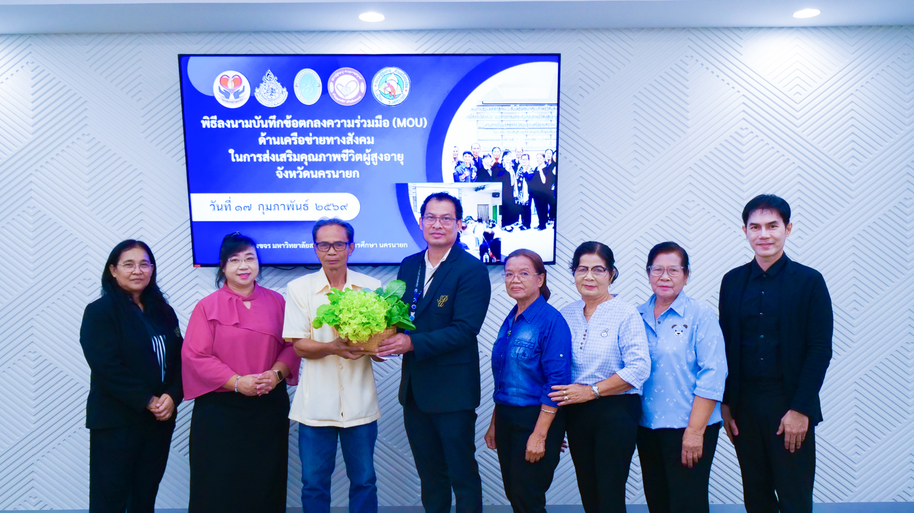 มหาวิทยาลัยสวนดุสิต ศูนย์การศึกษา นครนายก จัดพิธีลงนามบันทึกข้อตกลงความร่วมมือ (MOU) ด้านเครือข่ายทางสังคมในการส่งเสริมคุณภาพชีวิตผู้สูงอายุจังหวัดนครนายก ระหว่างมหาวิทยาลัยสวนดุสิต ศูนย์การศึกษา นครนายก กับชมรมผู้สูงอายุ 4 แห่งในจังหวัดนครนายก ได้แก่ ชมรมผู้สูงอายุตำบลบางสมบูรณ์, ชมรมผู้สูงอายุตำบลวังกระโจม, ชมรมผู้สูงอายุตำบลหนองแสง และชมรมผู้สูงอายุตำบลเขาเพิ่ม จังหวัดนครนายก โดยมีเจตนารมณ์ร่วมกันในการสร้างและพัฒนาเครือข่ายความร่วมมือทางสังคมในการส่งเสริมคุณภาพชีวิตผู้สูงอายุจังหวัดนครนายก ภายใต้งานวิจัย เรื่อง “แนวทางการยกระดับคุณภาพชีวิตผู้สูงอายุในจังหวัดนครนายก ผ่านการเรียนรู้ตลอดชีวิตบนฐานเครือข่ายความร่วมมือ” ในวันที่ 17 กุมภาพันธ์ 2569 เวลา 09.00 – 12.00 น. ณ ห้องประชุมขจร มหาวิทยาลัยสวนดุสิต ศูนย์การศึกษา นครนายก