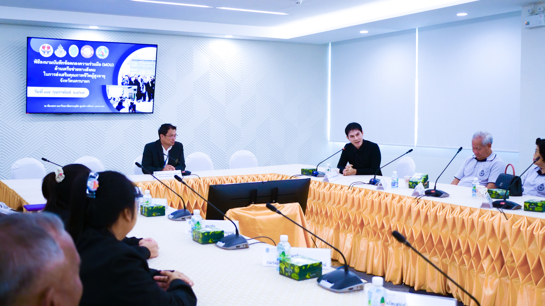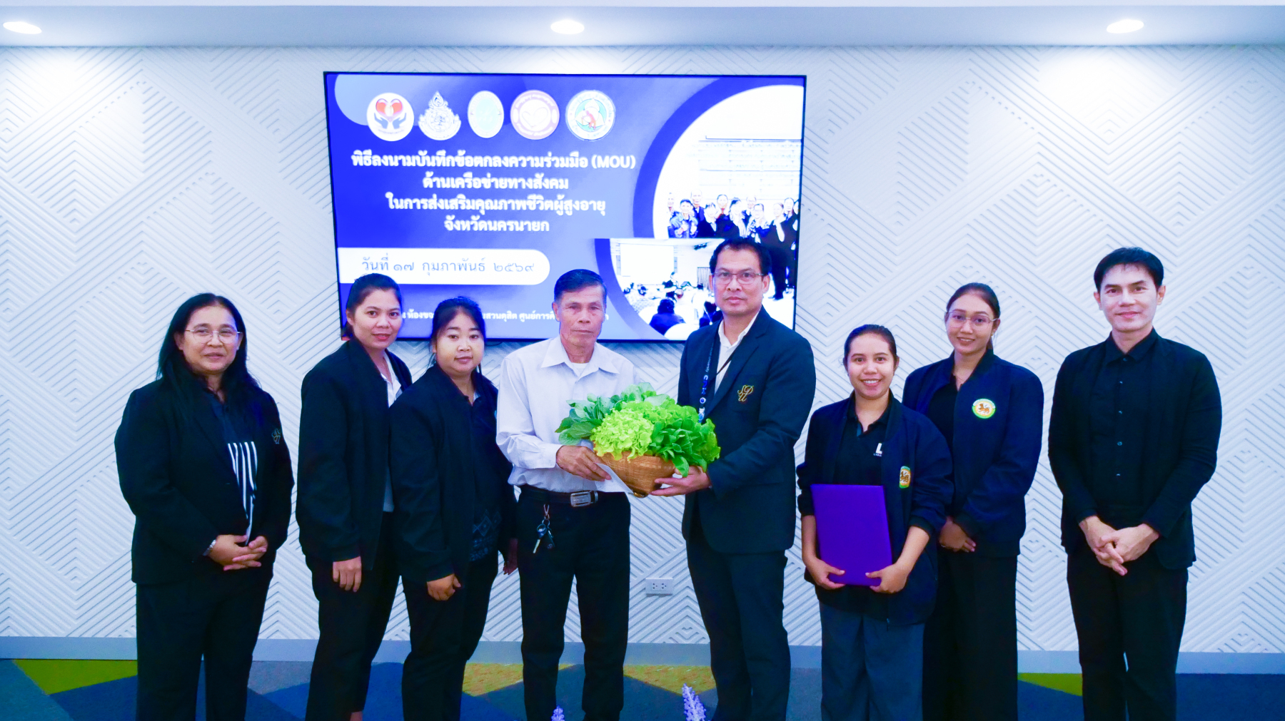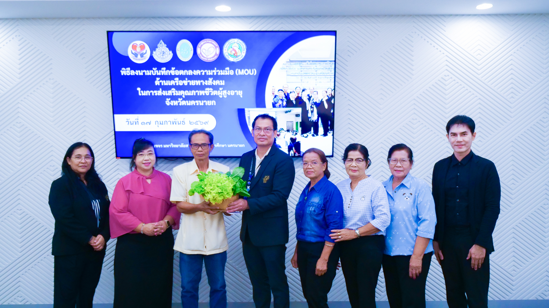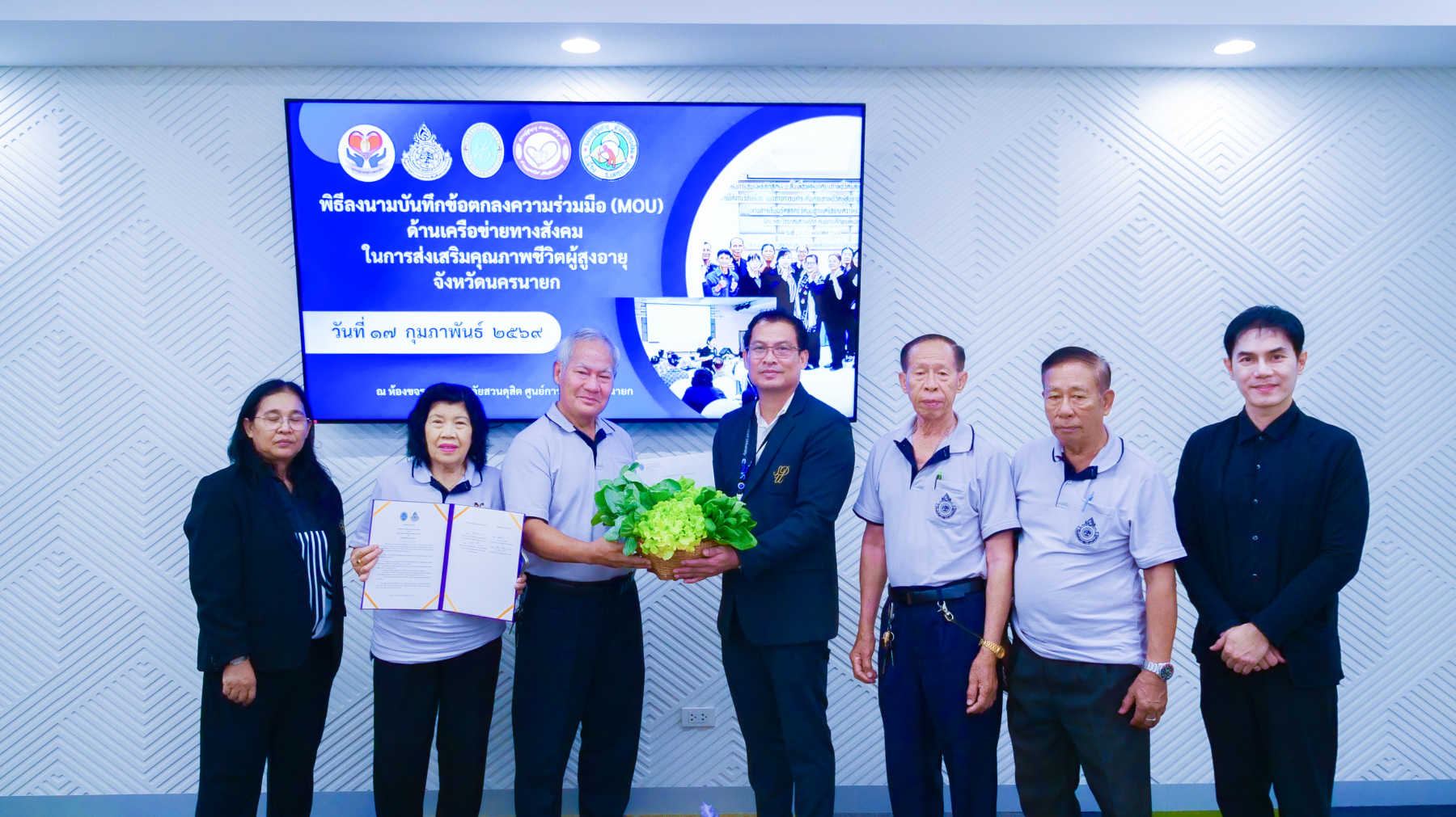 มหาวิทยาลัยสวนดุสิต ศูนย์การศึกษา นครนายก จัดพิธีลงนามบันทึกข้อตกลงความร่วมมือ (MOU) ด้านเครือข่ายทางสังคมในการส่งเสริมคุณภาพชีวิตผู้สูงอายุจังหวัดนครนายก ระหว่างมหาวิทยาลัยสวนดุสิต ศูนย์การศึกษา นครนายก กับชมรมผู้สูงอายุ 4 แห่งในจังหวัดนครนายก ได้แก่ ชมรมผู้สูงอายุตำบลบางสมบูรณ์, ชมรมผู้สูงอายุตำบลวังกระโจม, ชมรมผู้สูงอายุตำบลหนองแสง และชมรมผู้สูงอายุตำบลเขาเพิ่ม จังหวัดนครนายก โดยมีเจตนารมณ์ร่วมกันในการสร้างและพัฒนาเครือข่ายความร่วมมือทางสังคมในการส่งเสริมคุณภาพชีวิตผู้สูงอายุจังหวัดนครนายก ภายใต้งานวิจัย เรื่อง “แนวทางการยกระดับคุณภาพชีวิตผู้สูงอายุในจังหวัดนครนายก ผ่านการเรียนรู้ตลอดชีวิตบนฐานเครือข่ายความร่วมมือ” ในวันที่ 17 กุมภาพันธ์ 2569 เวลา 09.00 – 12.00 น. ณ ห้องประชุมขจร มหาวิทยาลัยสวนดุสิต ศูนย์การศึกษา นครนายก