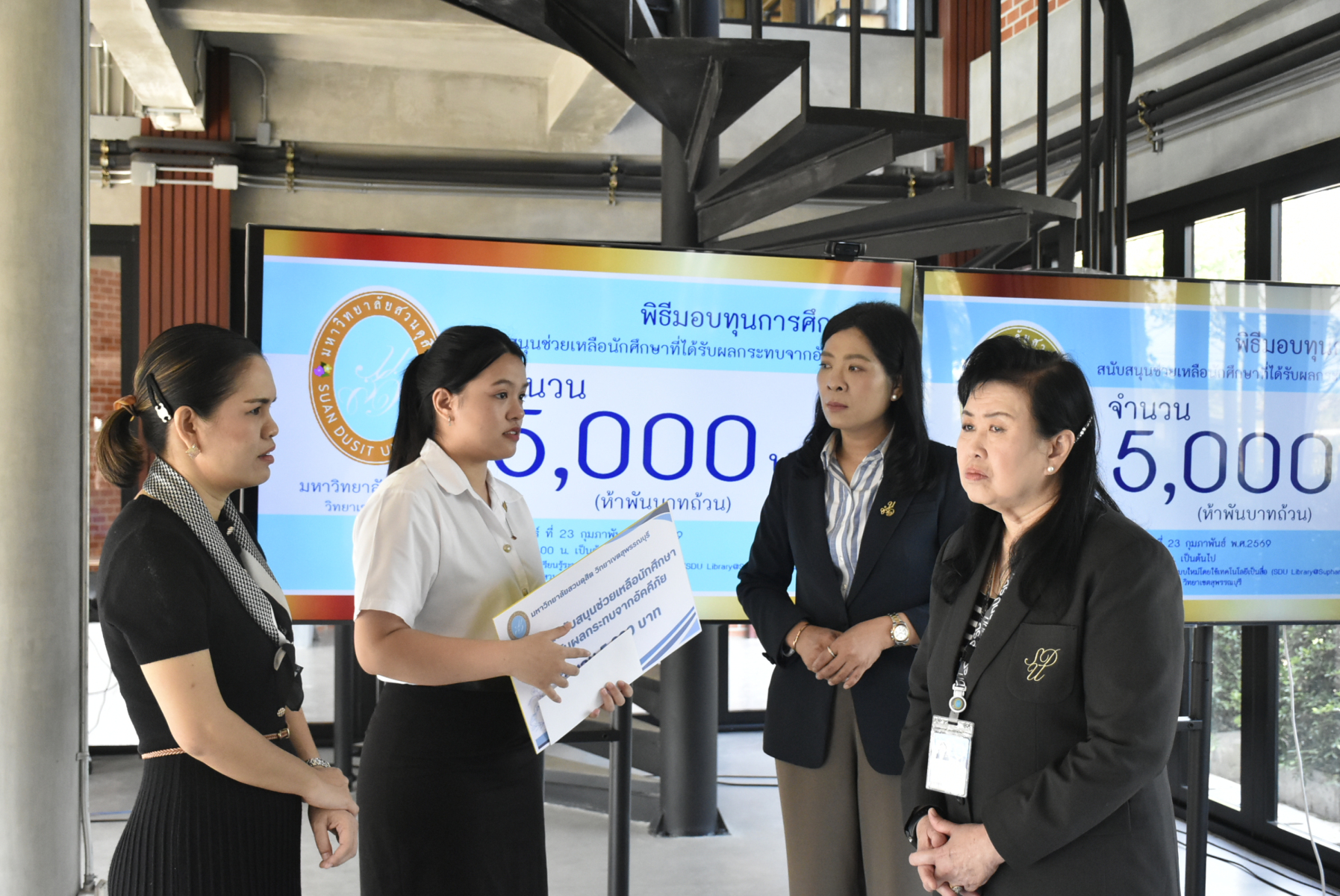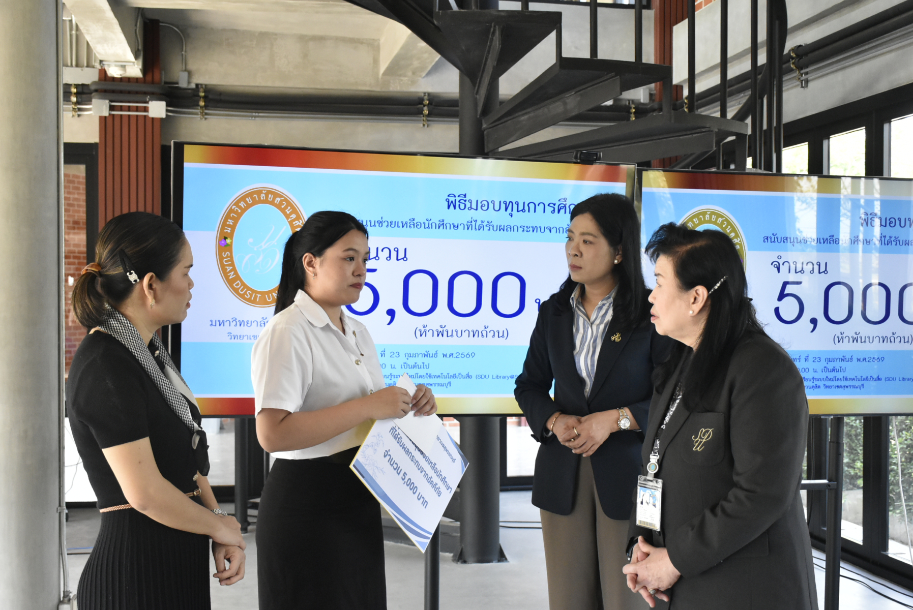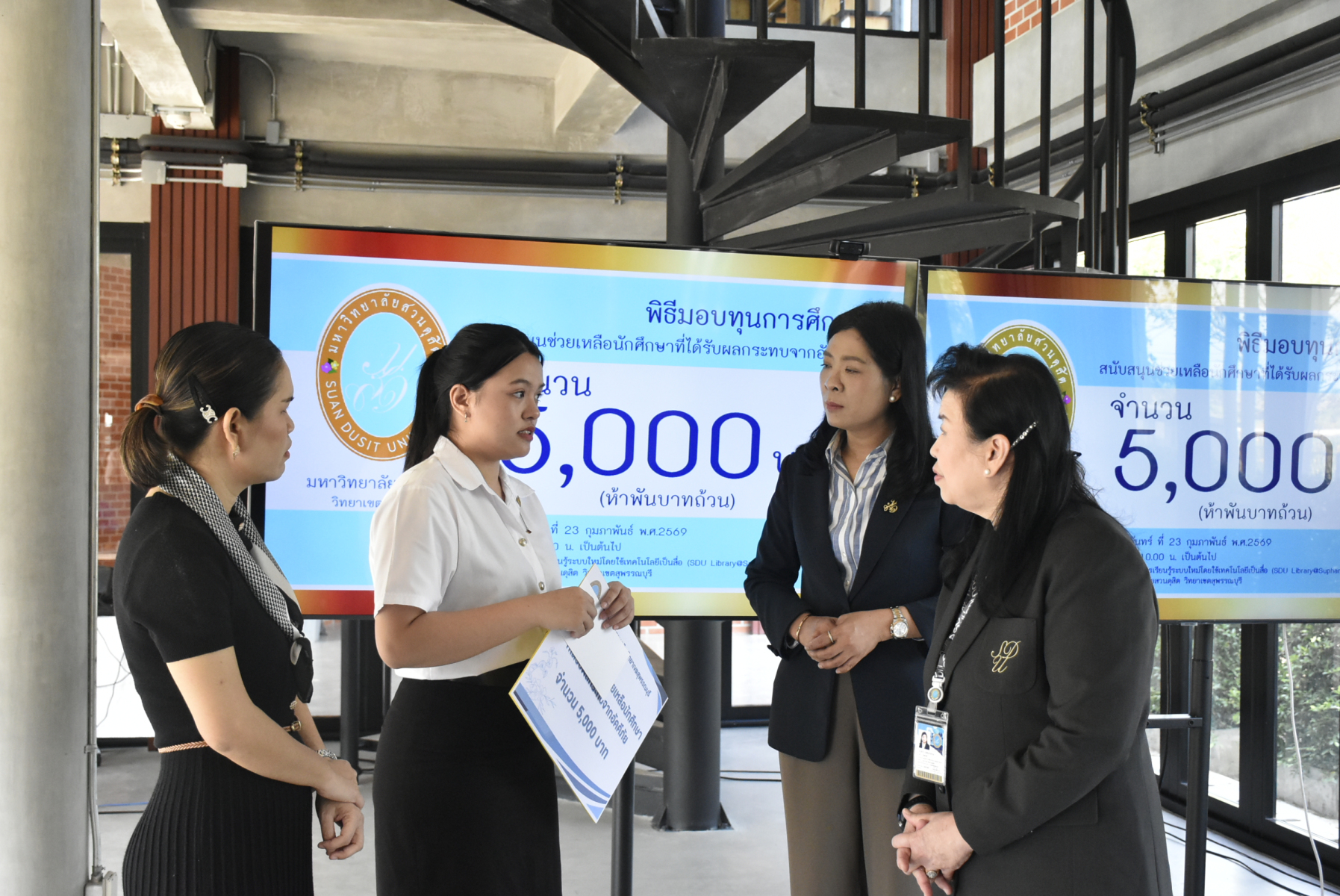 มหาวิทยาลัยสวนดุสิต วิทยาเขตสุพรรณบุรี โดย ดร.วรานี เวสสุนทรเทพ รองอธิการบดีฝ่ายวิทยาเขตสุพรรณบุรี พร้อมคณะผู้บริหารวิทยาเขตฯ มอบทุนการศึกษา ให้แก่ นางสาวปัญญาพร สุขดี นักศึกษาหลักสูตรวิทยาศาสตรบัณฑิต สาขาวิชาวิทยาศาสตร์เครื่องสำอาง ชั้นปี ที่ 3 เพื่อสนับสนุนและช่วยเหลือให้แก่นักศึกษาที่ได้รับผลกระทบจากอัคคีภัย และเพื่อเป็นขวัญและกำลังใจแก่นักศึกษา จำนวน 5,000 บาท (ห้าพันบาทถ้วน) 1 ทุน ในวันจันทร์ที่ 23 กุมภาพันธ์ 2569 เวลา 10.00 น. ณ อาคารศูนย์การเรียนรู้ระบบใหม่โดยใช้เทคโลโลยีเป็นสื่อ (SDU Library@Suphanburi)  ชั้น 1 โซน 2 มหาวิทยาลัยสวนดุสิต วิทยาเขตสุพรรณบุรี