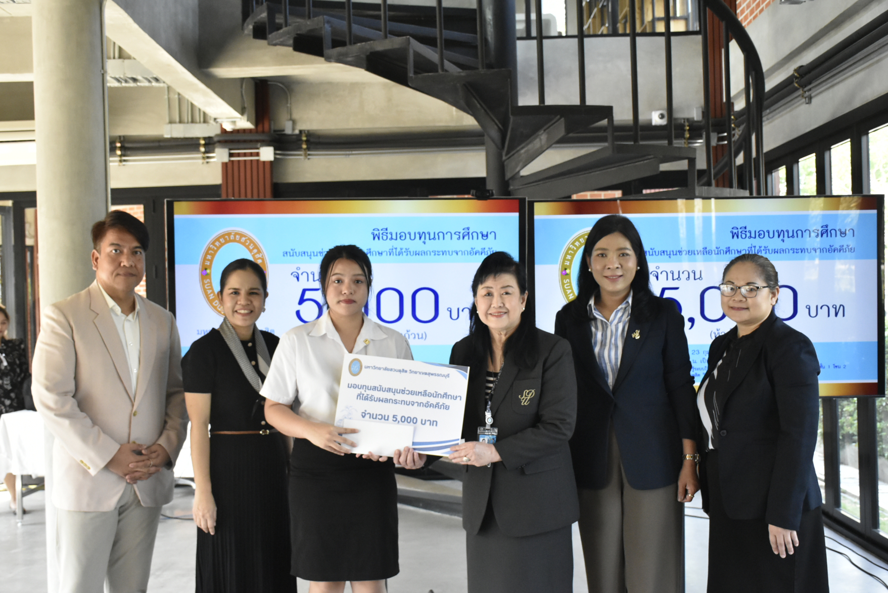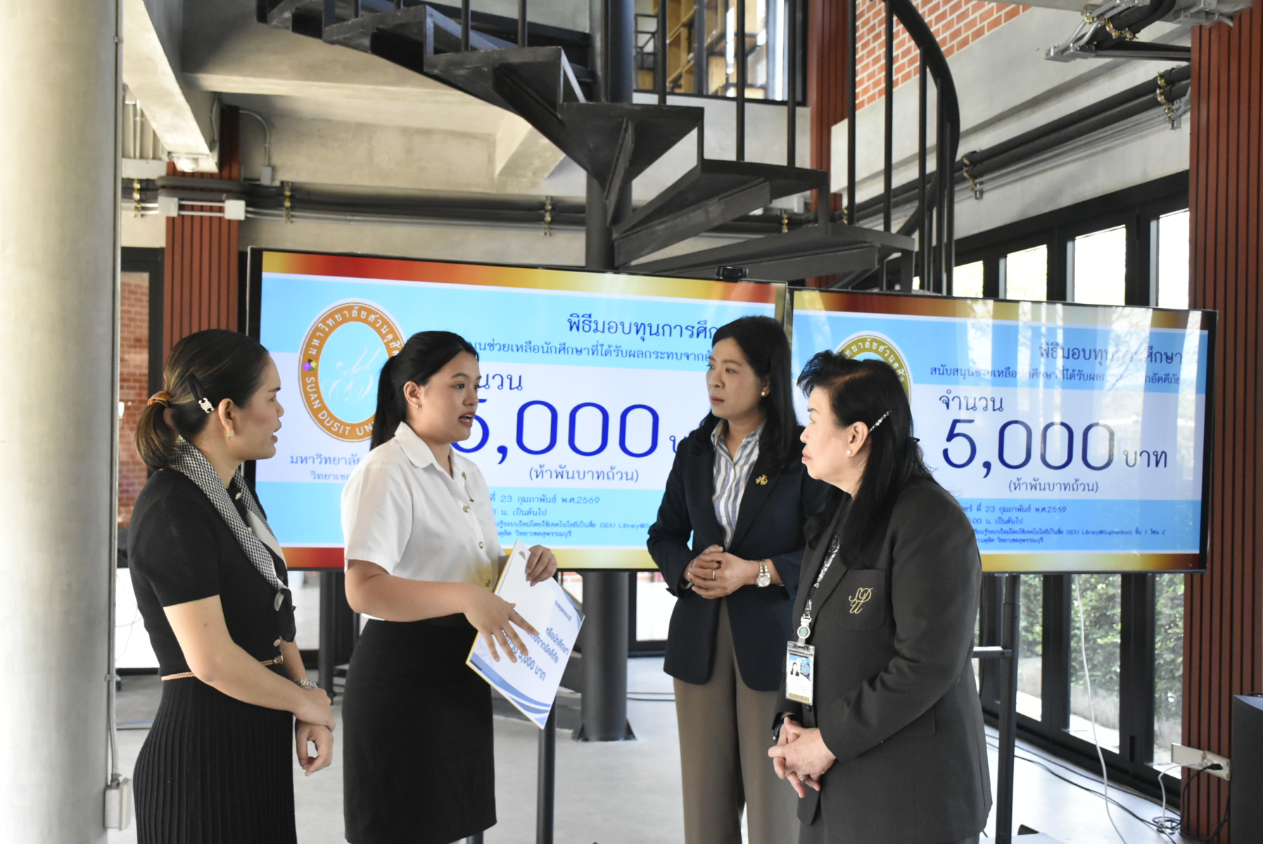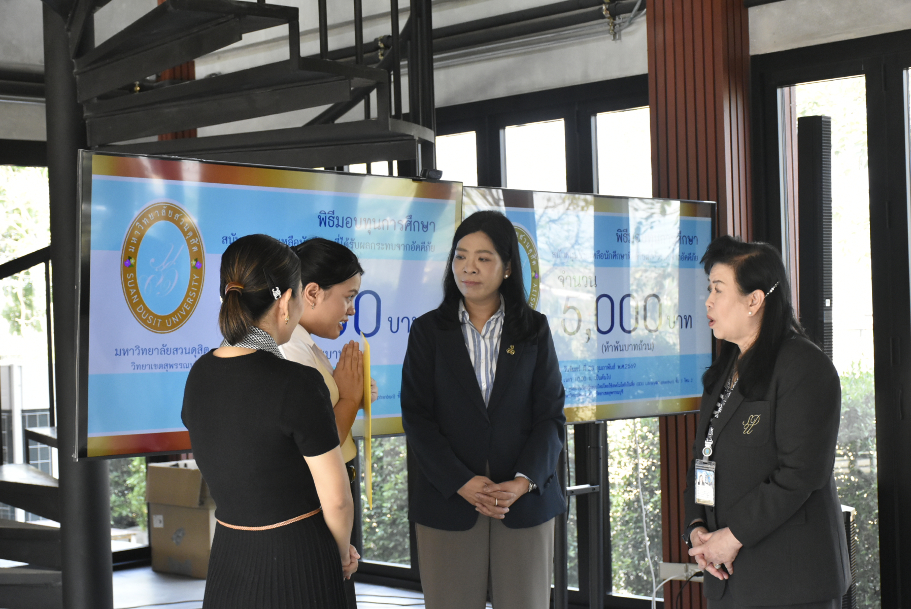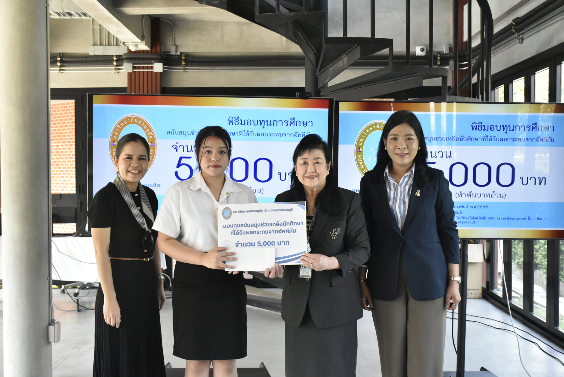 มหาวิทยาลัยสวนดุสิต วิทยาเขตสุพรรณบุรี โดย ดร.วรานี เวสสุนทรเทพ รองอธิการบดีฝ่ายวิทยาเขตสุพรรณบุรี พร้อมคณะผู้บริหารวิทยาเขตฯ มอบทุนการศึกษา ให้แก่ นางสาวปัญญาพร สุขดี นักศึกษาหลักสูตรวิทยาศาสตรบัณฑิต สาขาวิชาวิทยาศาสตร์เครื่องสำอาง ชั้นปี ที่ 3 เพื่อสนับสนุนและช่วยเหลือให้แก่นักศึกษาที่ได้รับผลกระทบจากอัคคีภัย และเพื่อเป็นขวัญและกำลังใจแก่นักศึกษา จำนวน 5,000 บาท (ห้าพันบาทถ้วน) 1 ทุน ในวันจันทร์ที่ 23 กุมภาพันธ์ 2569 เวลา 10.00 น. ณ อาคารศูนย์การเรียนรู้ระบบใหม่โดยใช้เทคโลโลยีเป็นสื่อ (SDU Library@Suphanburi)  ชั้น 1 โซน 2 มหาวิทยาลัยสวนดุสิต วิทยาเขตสุพรรณบุรี