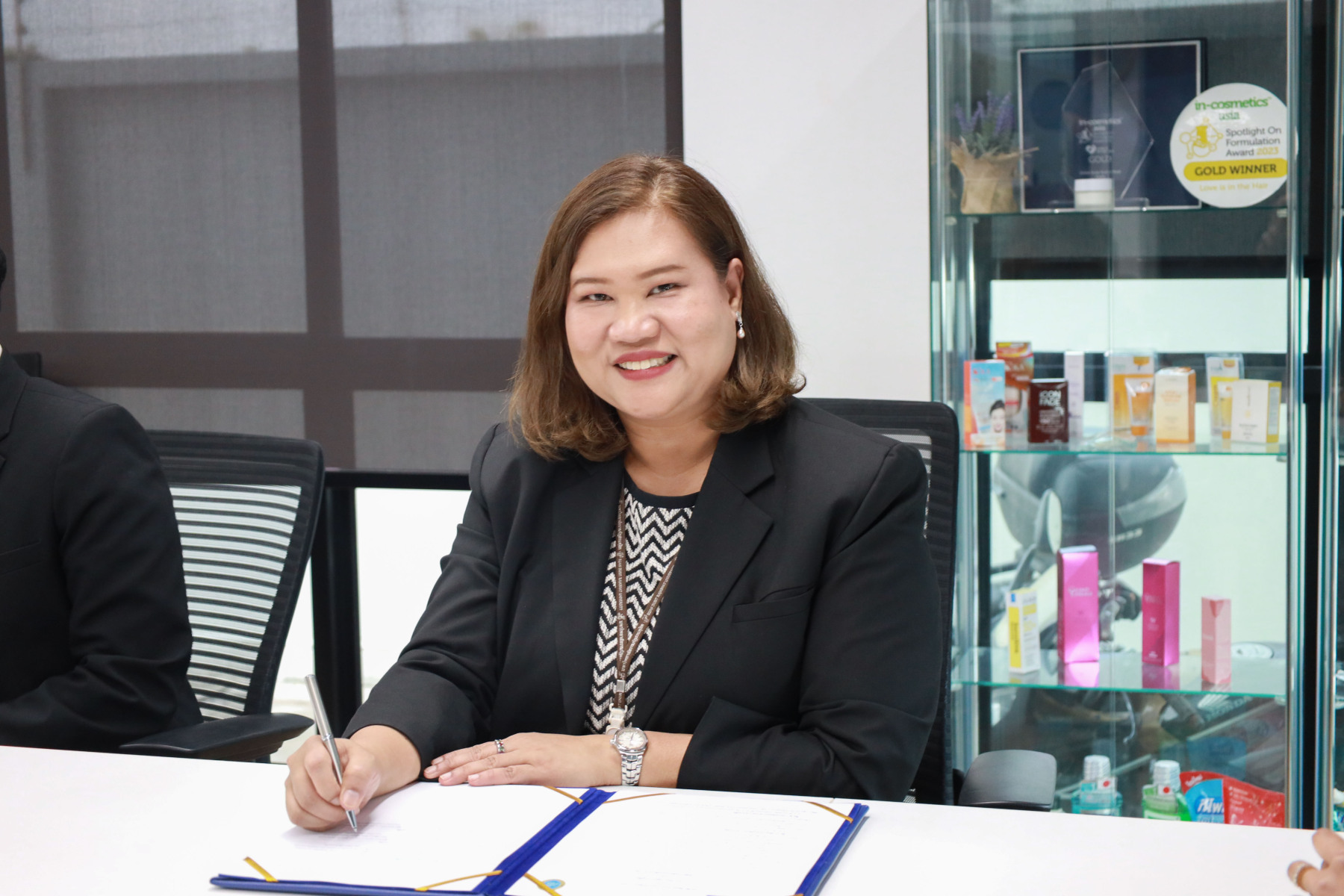 พิธีลงนามในครั้งนี้ ได้รับเกียรติจาก ผู้ช่วยศาสตราจารย์ ดร.พรชณิตว์ แก้วเนตร รองอธิการบดีฝ่ายวิชาการและกิจการต่างประเทศ มหาวิทยาลัยสวนดุสิต เป็นประธานในพิธี โดยมี คุณไวยวิทย์ อัครเรศวิมาน คุณอุดมลักษณ์ คูถิรตระการ กรรมการบริษัท และคุณปรีญาลักษณ์ เพชรเครือ ตำแหน่ง Commercial Manager เป็นผู้แทนลงนามความร่วมมือ ของบริษัท เคมีคอสเมติกส์ จำกัด ทั้งนี้ ผู้ช่วยศาสตราจารย์ ดร.ฐิตินาถ สุคนเขตร์ คณบดีคณะวิทยาศาสตร์และเทคโนโลยี และ ผู้ช่วยศาสตราจารย์ ดร.วิทวัส รัตนถาวร ประธานหลักสูตรวิทยาศาสตรบัณฑิต สาขาวิชาวิทยาศาสตร์เครื่องสำอาง ได้ร่วมกล่าวถึงเจตนารมณ์และวัตถุประสงค์สำคัญของการจัดทำบันทึกข้อตกลงในครั้งนี้