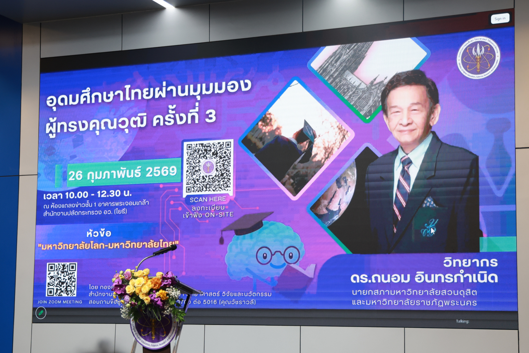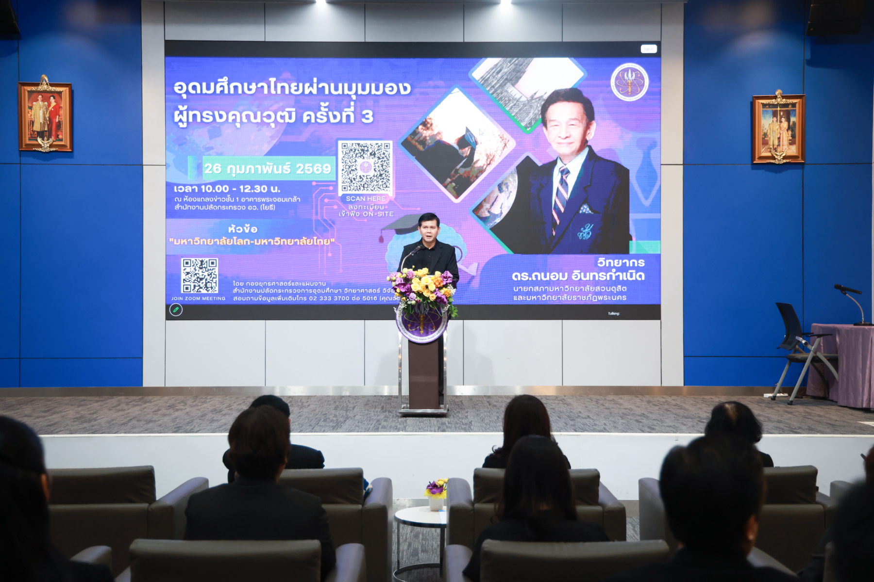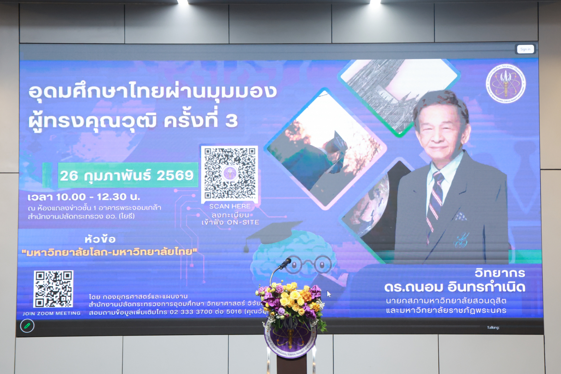 ดร.ถนอม อินทรกำเนิด นายกสภามหาวิทยาลัยสวนดุสิต บรรยายในหัวข้อ “มหาวิทยาลัยโลก-มหาวิทยาลัยไทย” ในโครงการประชุมเชิงปฏิบัติการ “การอุดมศึกษาไทยผ่านมุมมองผู้ทรงคุณวุฒิ” ครั้งที่ 3 โดยเป็นการถอดองค์ความรู้ผู้ทรงคุณวุฒิด้านการบริหารอุดมศึกษา พัฒนาการมหาวิทยาลัยโลก – มหาวิทยาลัยไทย โอกาส ความท้าทาย ของมหาวิทยาลัยไทย ปัจจัยสู่ความสำเร็จของมหาวิทยาลัยเพื่อการพัฒนาท้องถิ่น จัดโดย กองยุทธศาสตร์และแผนงาน สำนักงานปลัดกระทรวงการอุดมศึกษา วิทยาศาสตร์ วิจัยและนวัตกรรม เมื่อวันพฤหัสบดีที่ 26 กุมภาพันธ์ 2569 ณ ห้องแถลงข่าวชั้น 1 อาคารพระจอมเกล้า สำนักงานปลัดกระทรวง อว. (โยธี) และออนไลน์ผ่านระบบ ZOOM
