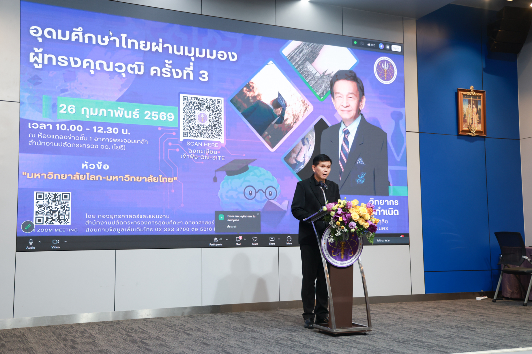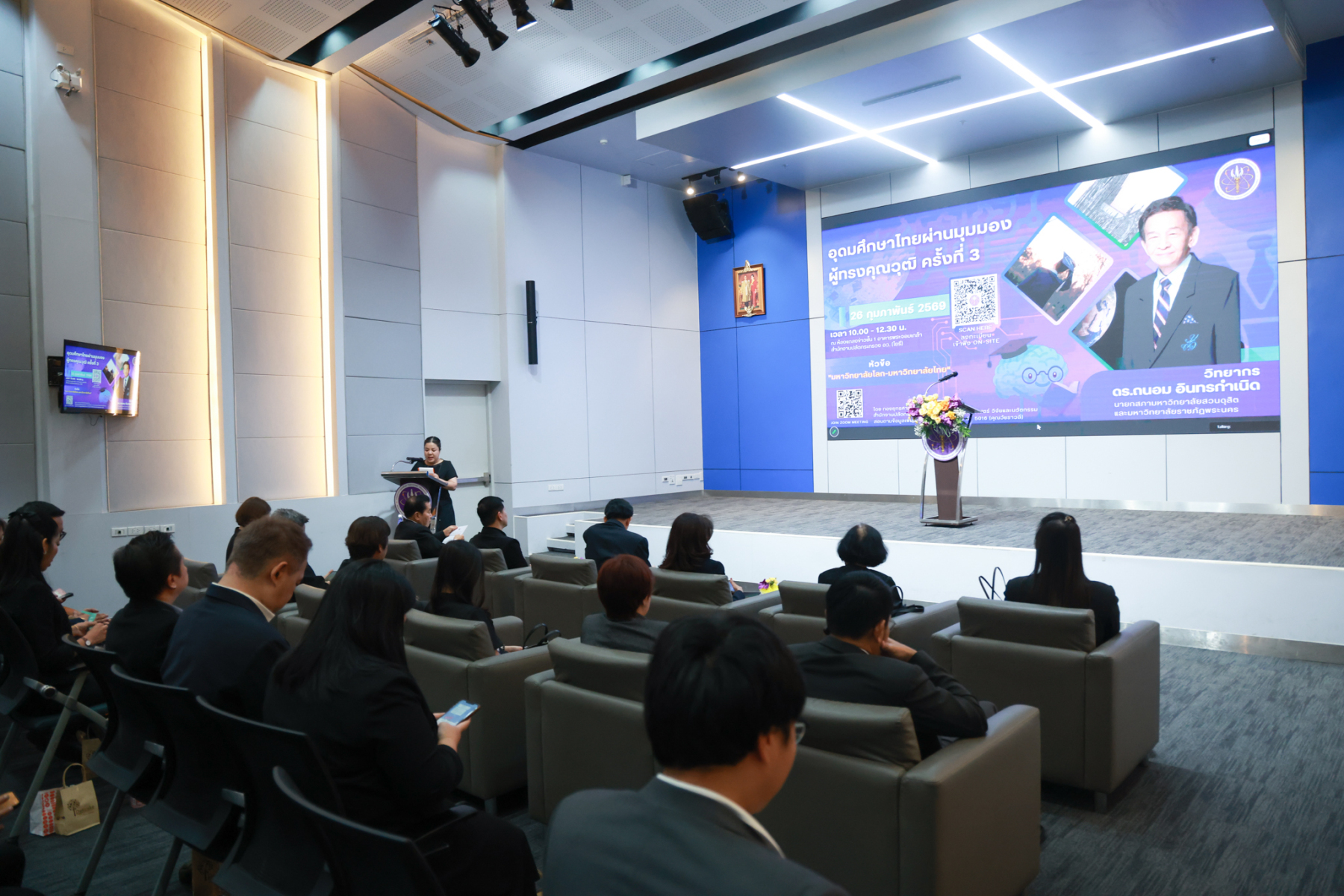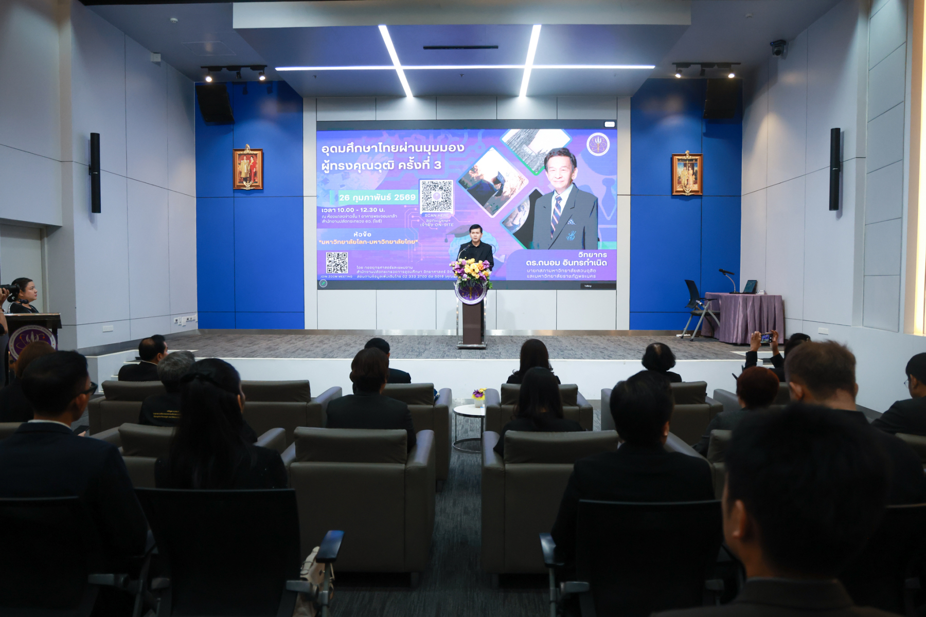 ดร.ถนอม อินทรกำเนิด นายกสภามหาวิทยาลัยสวนดุสิต บรรยายในหัวข้อ “มหาวิทยาลัยโลก-มหาวิทยาลัยไทย” ในโครงการประชุมเชิงปฏิบัติการ “การอุดมศึกษาไทยผ่านมุมมองผู้ทรงคุณวุฒิ” ครั้งที่ 3 โดยเป็นการถอดองค์ความรู้ผู้ทรงคุณวุฒิด้านการบริหารอุดมศึกษา พัฒนาการมหาวิทยาลัยโลก – มหาวิทยาลัยไทย โอกาส ความท้าทาย ของมหาวิทยาลัยไทย ปัจจัยสู่ความสำเร็จของมหาวิทยาลัยเพื่อการพัฒนาท้องถิ่น จัดโดย กองยุทธศาสตร์และแผนงาน สำนักงานปลัดกระทรวงการอุดมศึกษา วิทยาศาสตร์ วิจัยและนวัตกรรม เมื่อวันพฤหัสบดีที่ 26 กุมภาพันธ์ 2569 ณ ห้องแถลงข่าวชั้น 1 อาคารพระจอมเกล้า สำนักงานปลัดกระทรวง อว. (โยธี) และออนไลน์ผ่านระบบ ZOOM