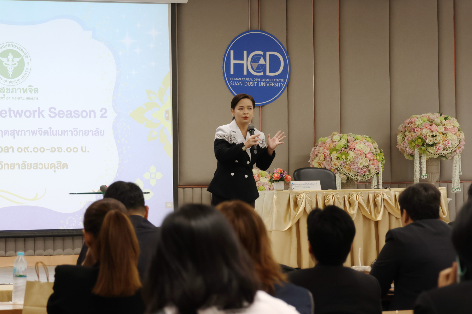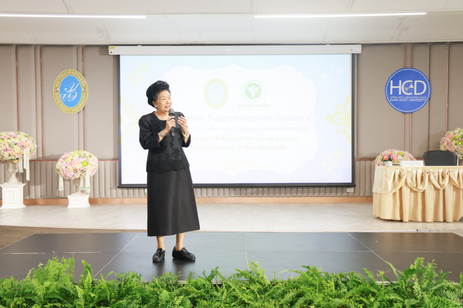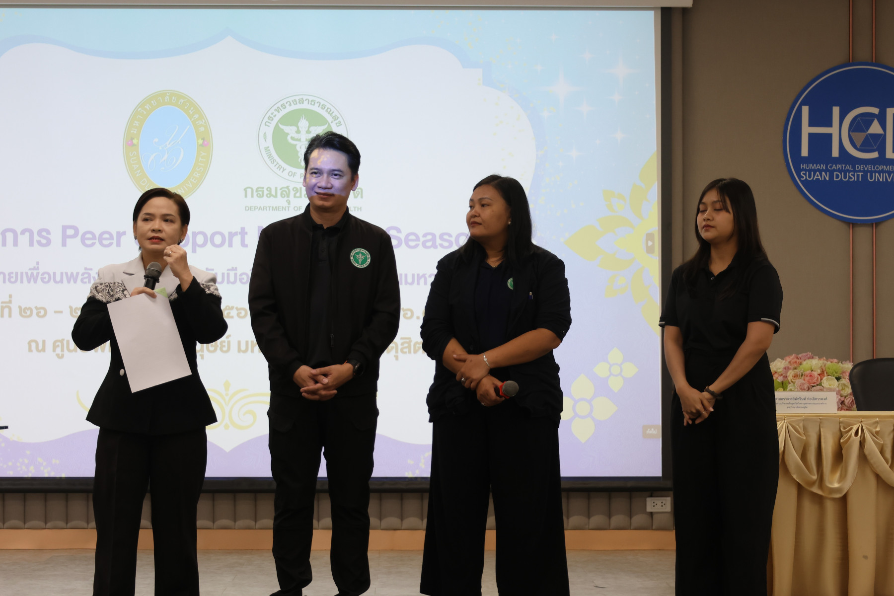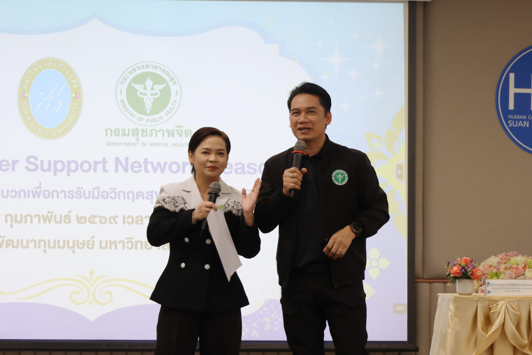 โดยมี ผู้ช่วยศาสตราจารย์พัศรินท์ ก่อเลิศวรพงศ์ กรรมการบริหารหลักสูตรจิตวิทยาอุตสาหกรรมและองค์การ คณะมนุษยศาสตร์และสังคมศาสตร์ มหาวิทยาลัยสวนดุสิต เป็นวิทยากรหลัก และมีทีมผู้ช่วยวิทยากรจากนักศึกษาหลักสูตรจิตวิทยาอุตสาหกรรมและองค์การ รวมทั้งนักศึกษาชมรมเพื่อนพลังบวก (Peer Support Club) ร่วมสนับสนุนการฝึกปฏิบัติ ในช่วงบ่าย เป็นการซ้อมแผนเผชิญเหตุสุขภาพจิตของมหาวิทยาลัยโดยคณะกรรมการบัญชาการเหตุการณ์ด้านสุขภาพจิต (SDU-ICS) พร้อมรับข้อเสนอแนะจากตัวแทนของศูนย์สุขภาพจิตที่ 13 และพิธีปิดการอบรมและมอบเกียรติบัตรแก่ผู้เข้าร่วม ได้รับเกียรติจาก รองศาสตราจารย์พัชรี สวนแก้ว รองอธิการบดีฝ่ายกิจการนักศึกษา มหาวิทยาลัยสวนดุสิต เป็นประธานในพิธี