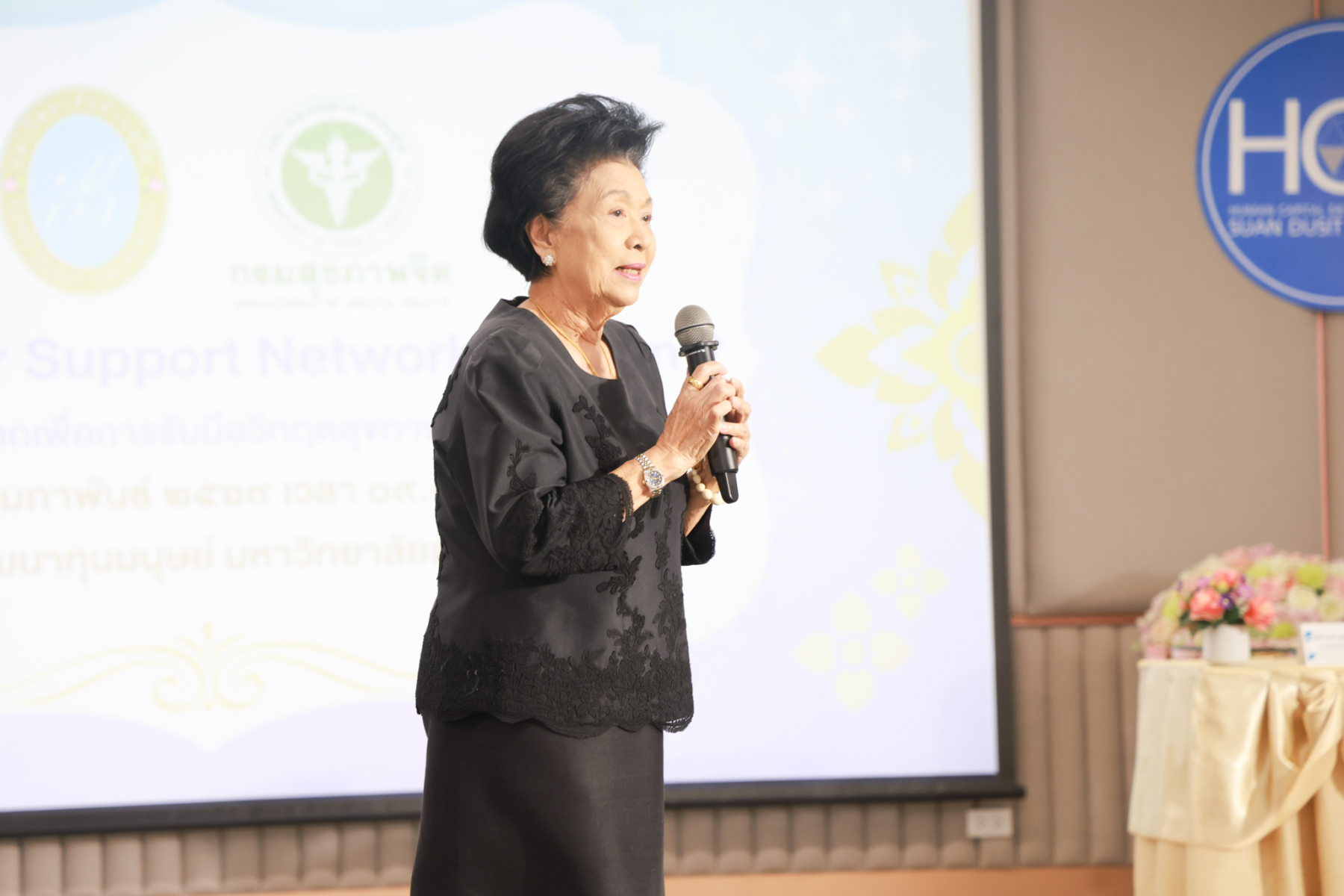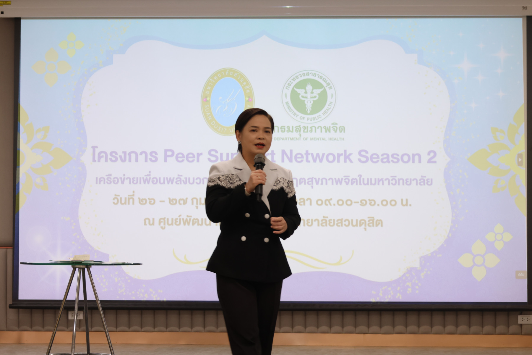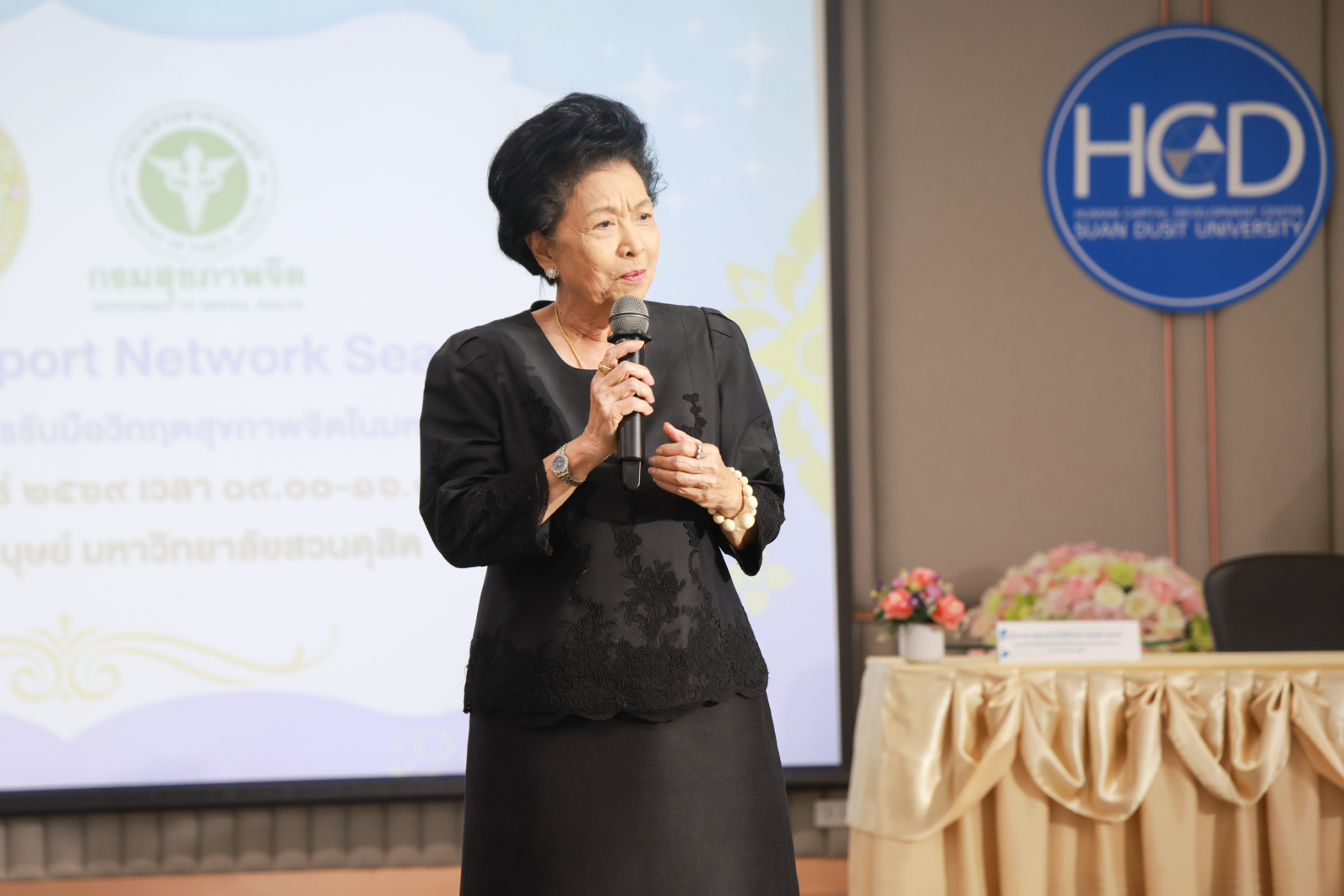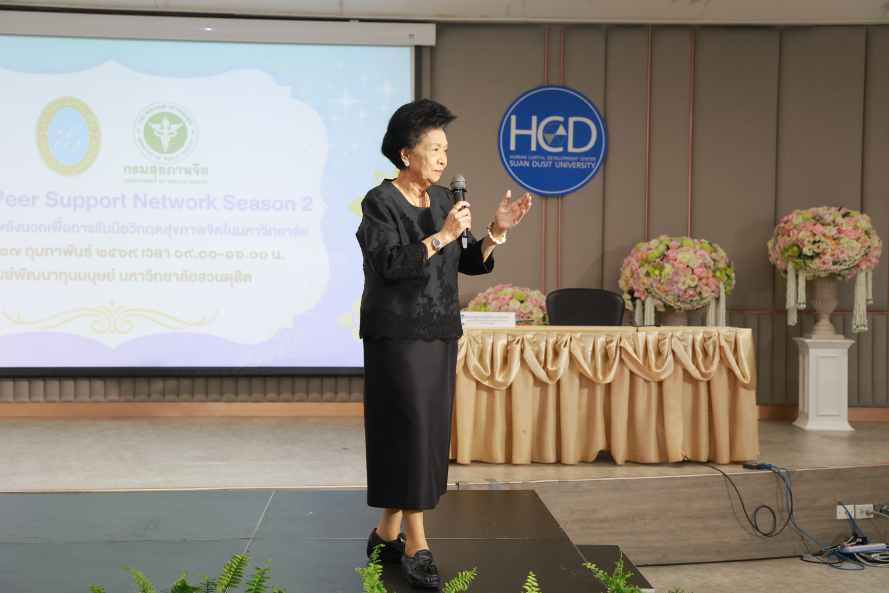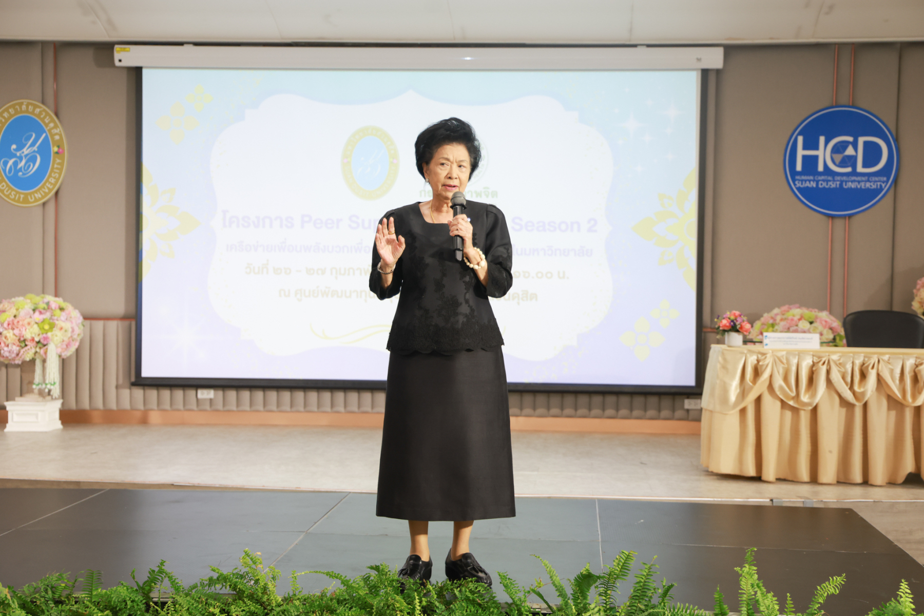 โดยมี ผู้ช่วยศาสตราจารย์พัศรินท์ ก่อเลิศวรพงศ์ กรรมการบริหารหลักสูตรจิตวิทยาอุตสาหกรรมและองค์การ คณะมนุษยศาสตร์และสังคมศาสตร์ มหาวิทยาลัยสวนดุสิต เป็นวิทยากรหลัก และมีทีมผู้ช่วยวิทยากรจากนักศึกษาหลักสูตรจิตวิทยาอุตสาหกรรมและองค์การ รวมทั้งนักศึกษาชมรมเพื่อนพลังบวก (Peer Support Club) ร่วมสนับสนุนการฝึกปฏิบัติ ในช่วงบ่าย เป็นการซ้อมแผนเผชิญเหตุสุขภาพจิตของมหาวิทยาลัยโดยคณะกรรมการบัญชาการเหตุการณ์ด้านสุขภาพจิต (SDU-ICS) พร้อมรับข้อเสนอแนะจากตัวแทนของศูนย์สุขภาพจิตที่ 13 และพิธีปิดการอบรมและมอบเกียรติบัตรแก่ผู้เข้าร่วม ได้รับเกียรติจาก รองศาสตราจารย์พัชรี สวนแก้ว รองอธิการบดีฝ่ายกิจการนักศึกษา มหาวิทยาลัยสวนดุสิต เป็นประธานในพิธี