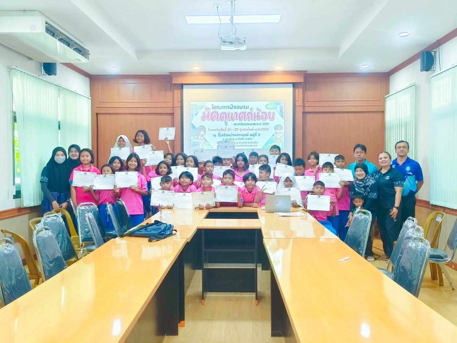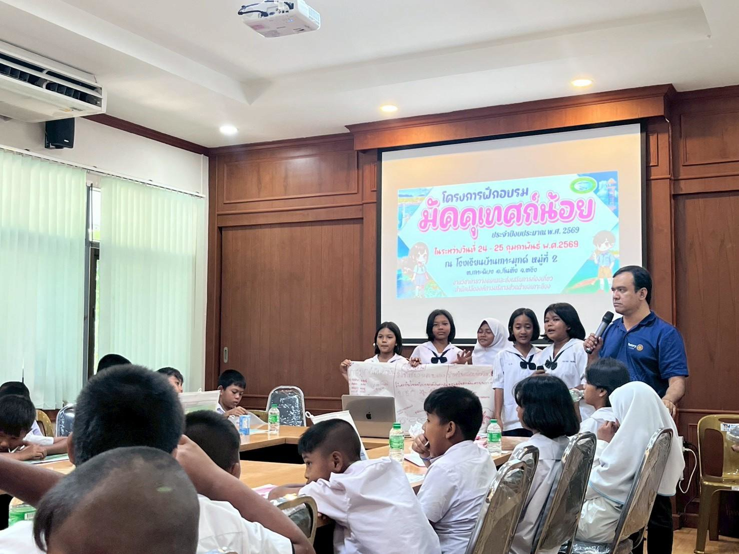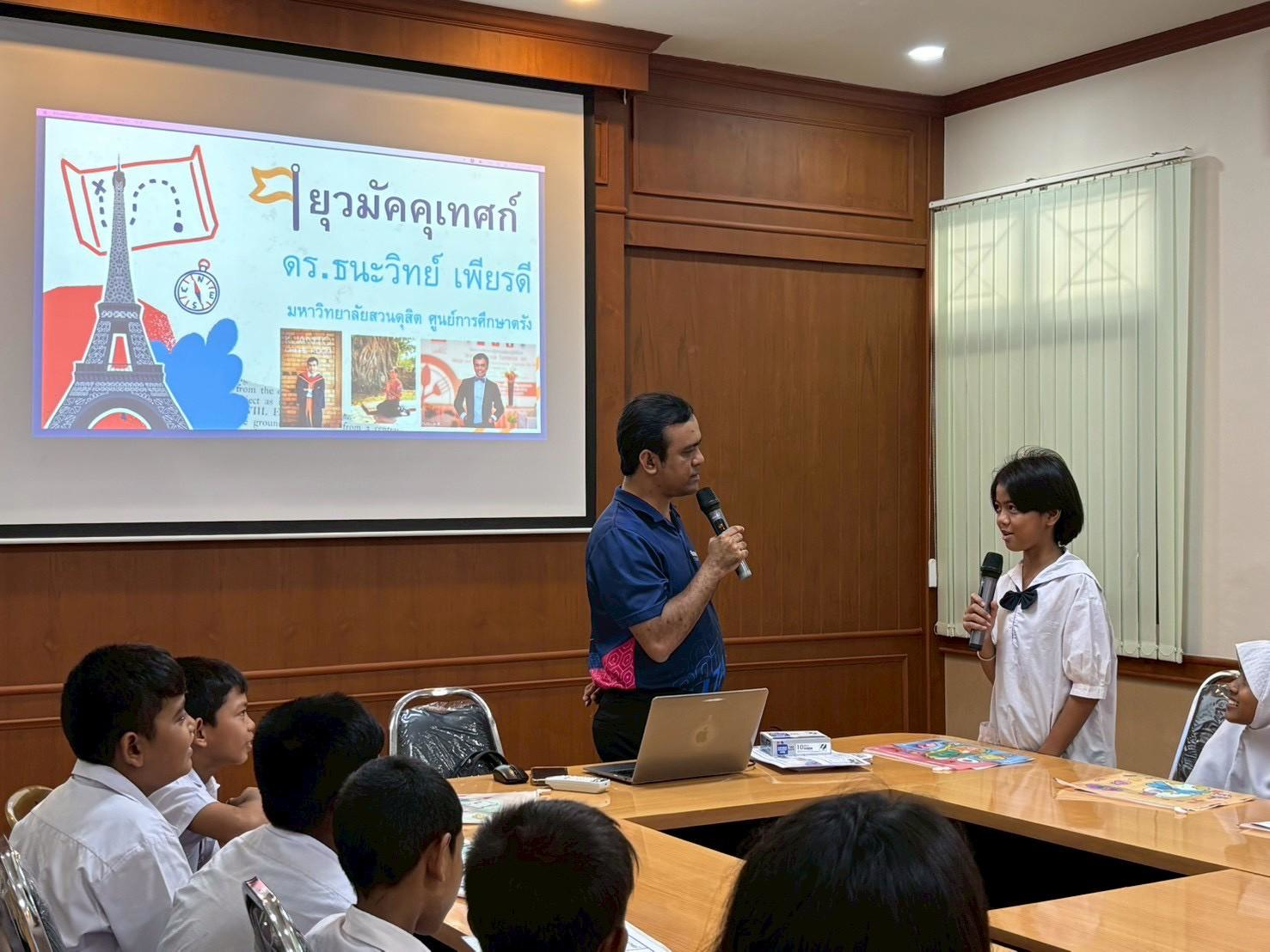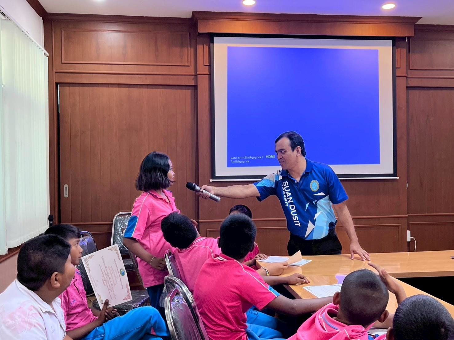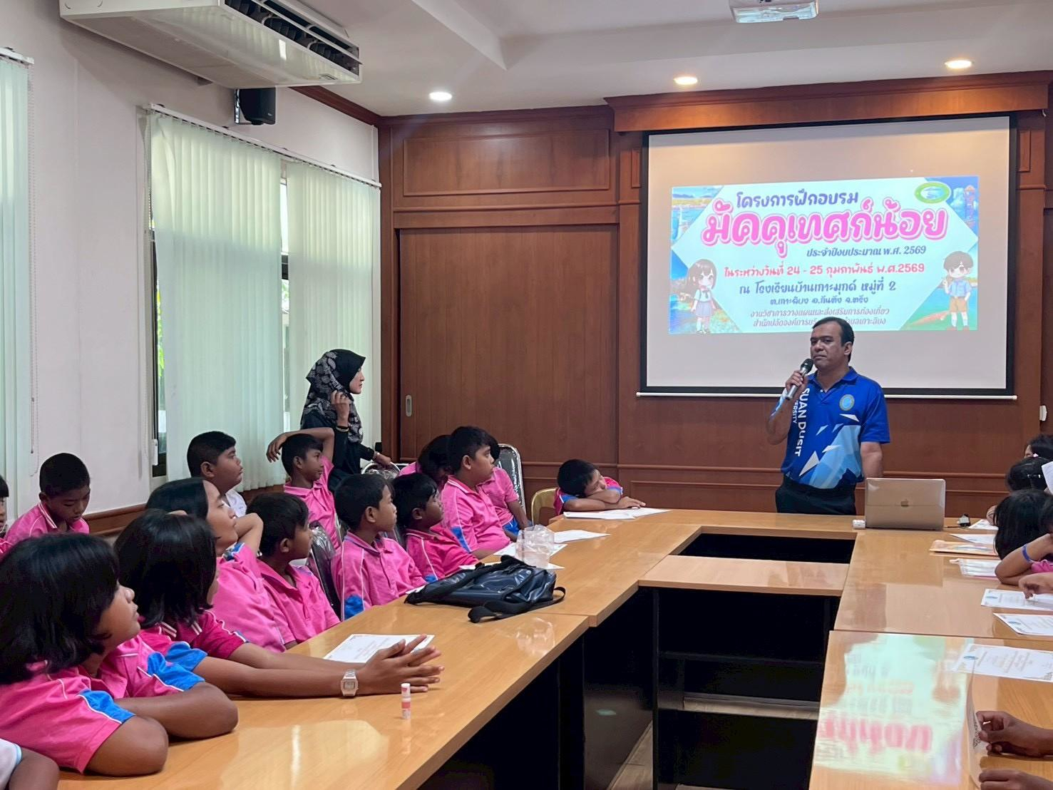 วันที่ 24 ถึง 25 กุมภาพันธ์ 2569  ดร.ธนะวิทย์ เพียรดี อาจารย์ประจำสาขาวิชาการท่องเที่ยว มหาวิทยาลัยสวนดุสิต ศูนย์การศึกษาตรัง ได้รับเกียรติเป็นวิทยากรในโครงการฝึกอบรมมัคคุเทศก์น้อย ซึ่งจัดโดยงานวิชาการวางแผนและส่งเสริมการท่องเที่ยว สำนักปลัด องค์การบริหารส่วนตำบลเกาะลิบง โครงการนี้จัดอบรมให้แก่นักเรียนจำนวน 40 คน ชั้นประถมศึกษาปีที่ 5 โรงเรียนบ้านเกาะมุกด์ หมู่ที่ 2 ตำบลเกาะลิบง อำเภอกันตัง จังหวัดตรัง และการอบรมในครั้งนี้มีวัตถุประสงค์เพื่อให้เด็กและเยาวชนในเกาะมุกด์ใช้เวลาเวลาว่างให้เป็นประโยชน์ รู้จักเผยแพร่วัฒนธรรมท้องถิ่น รักษ์บ้านเกิดและภูมิลำเนาของตนเอง และสามารถนำองค์ความรู้ทางด้านการท่องเที่ยวและของมัคคุเทศก์ไปใช้ให้เกิดประโยชน์และปฏิบัติงานได้ในสถานการณ์จริง ทั้งนี้มีการฝึกอบรมภาคทฤษฎีและภาคปฏิบัติในแหล่งท่องเที่ยวที่สำคัญของเกาะมุกด์ ได้แก่ สะพานท่าเรือเกาะมุกด์ หอชมพะยูน หาดฝรั่ง (หาดชาลี) ร้านอาหาร Miss Island Bakery &Restaurant @Kohmook (ร้านมาดามฮาลาลฟู้ด) ร้านผลิตภัณฑ์จากกะลามะพร้าว Hand Made From Coconut Shell