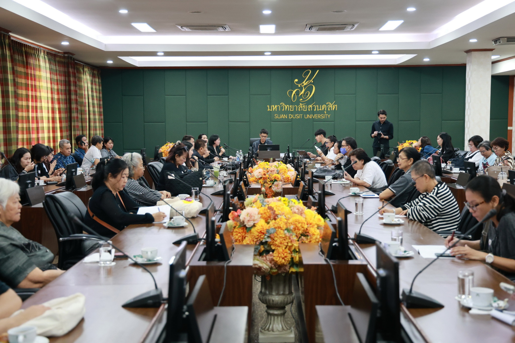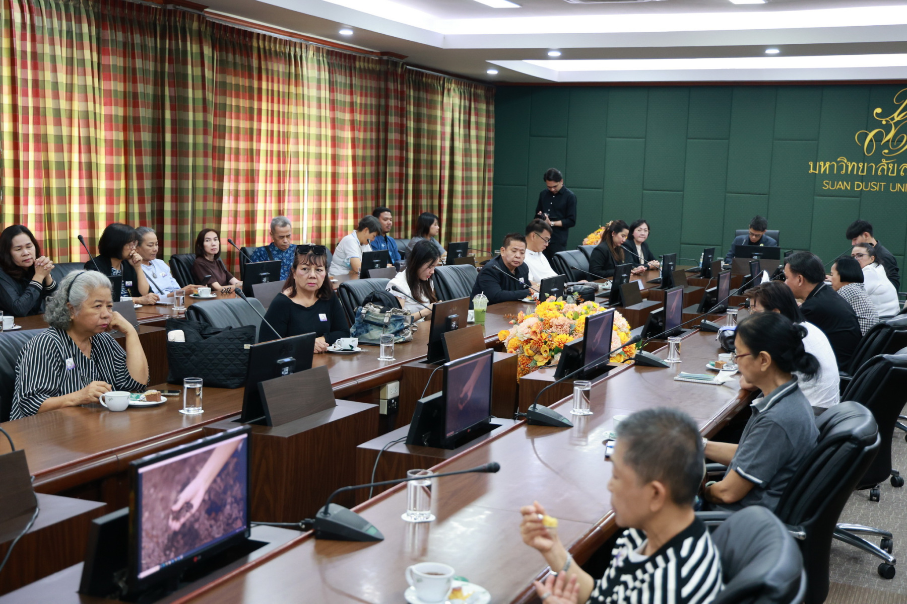 อาจารย์เป็นเอก ทรัพย์สิน อาจารย์ประจำหลักสูตรวิทยาศาสตรบัณฑิต สาขาวิชาเทคโนโลยีการประกอบอาหารและการบริการ โรงเรียนการเรือน มหาวิทยาลัยสวนดุสิตพร้อมคณาจารย์ ให้การต้อนรับคณะศึกษาดูงานจาก สำนักงานพัฒนาชุมชนจังหวัดนนทบุรี ในการจัดทำโครงการเพิ่มมูลค่าผลิตภัณฑ์ OTOP ด้วยนวัตกรรมยุคใหม่ (Clinic OTOP) นำผู้ผลิต ผู้ประกอบการ OTOP จังหวัดนนทบุรีและเจ้าหน้าที่โครงการ จำนวน ๖๕ คนเข้ารับฟังการบรรยายเกี่ยวกับกระบวนการพัฒนาผลิตภัณฑ์ การบริหารจัดการ และแนวทางการพัฒนาผลิตภัณฑ์สู่เชิงพาณิชย์ของสวนดุสิตโฮมเบเกอรี่ พร้อมทั้งศึกษาดูงานสวนดุสิตโฮมเบเกอรี่ ครัวสวนดุสิตและศูนย์ฝึกปฎิบัติการอาหารนานาชาติ ณ ห้องประชุมลำพอง 2 โรงแรมสวนดุสิต เพลส