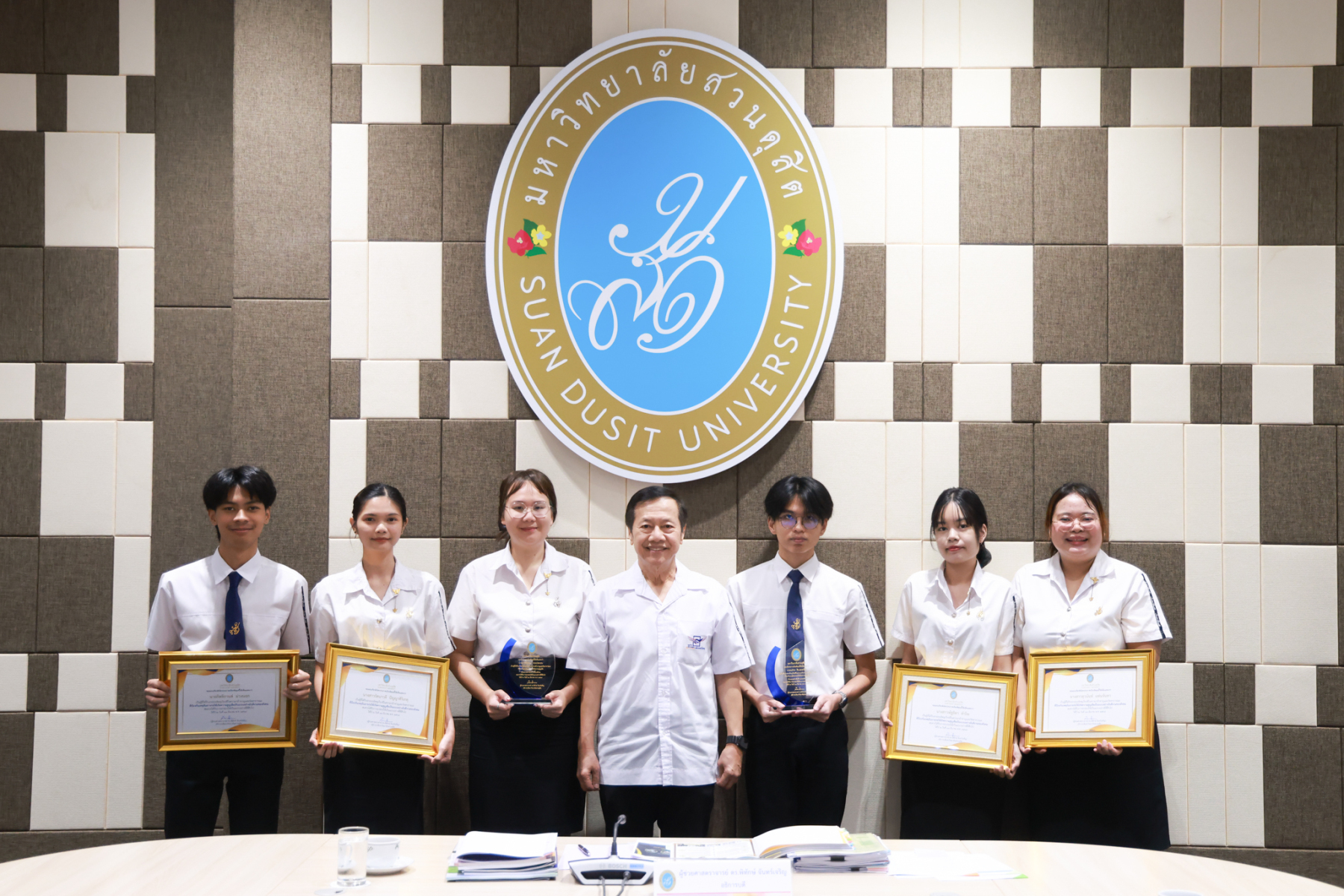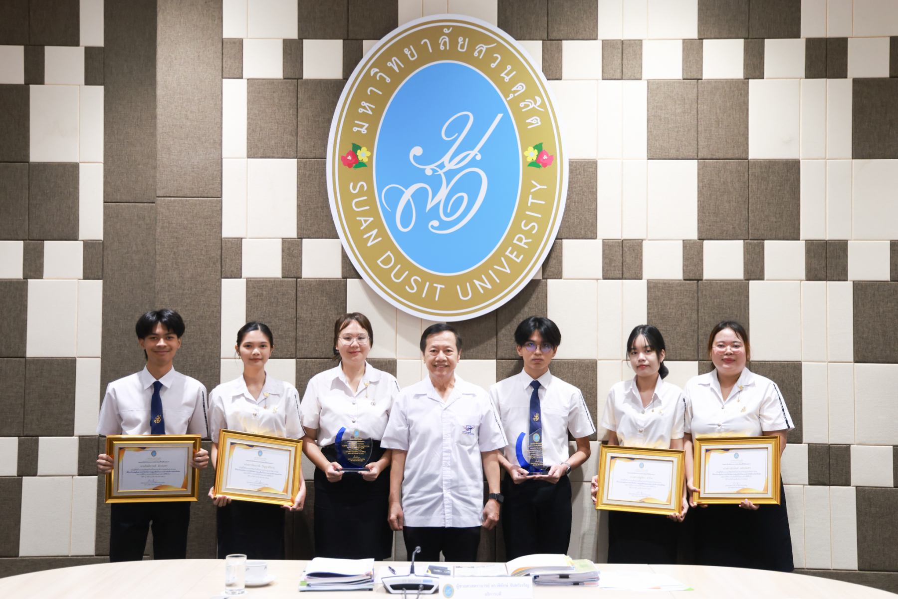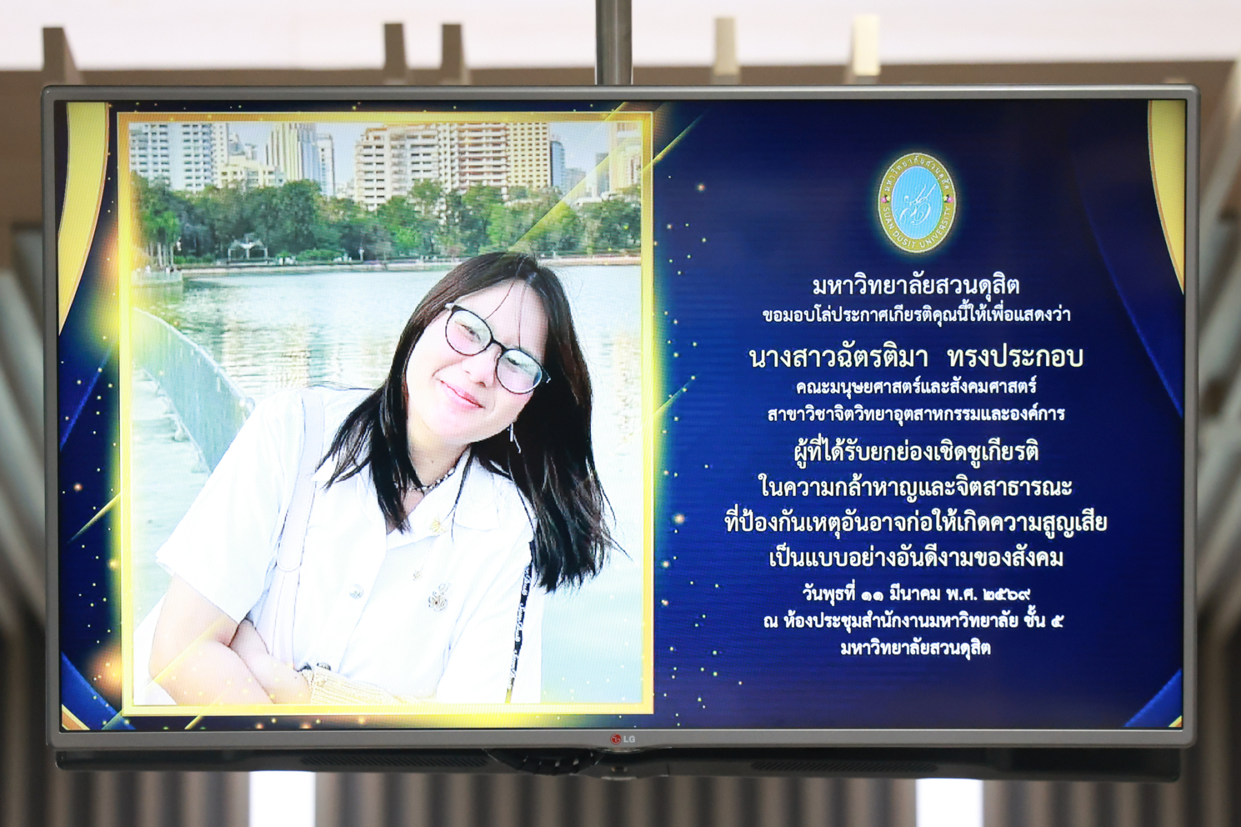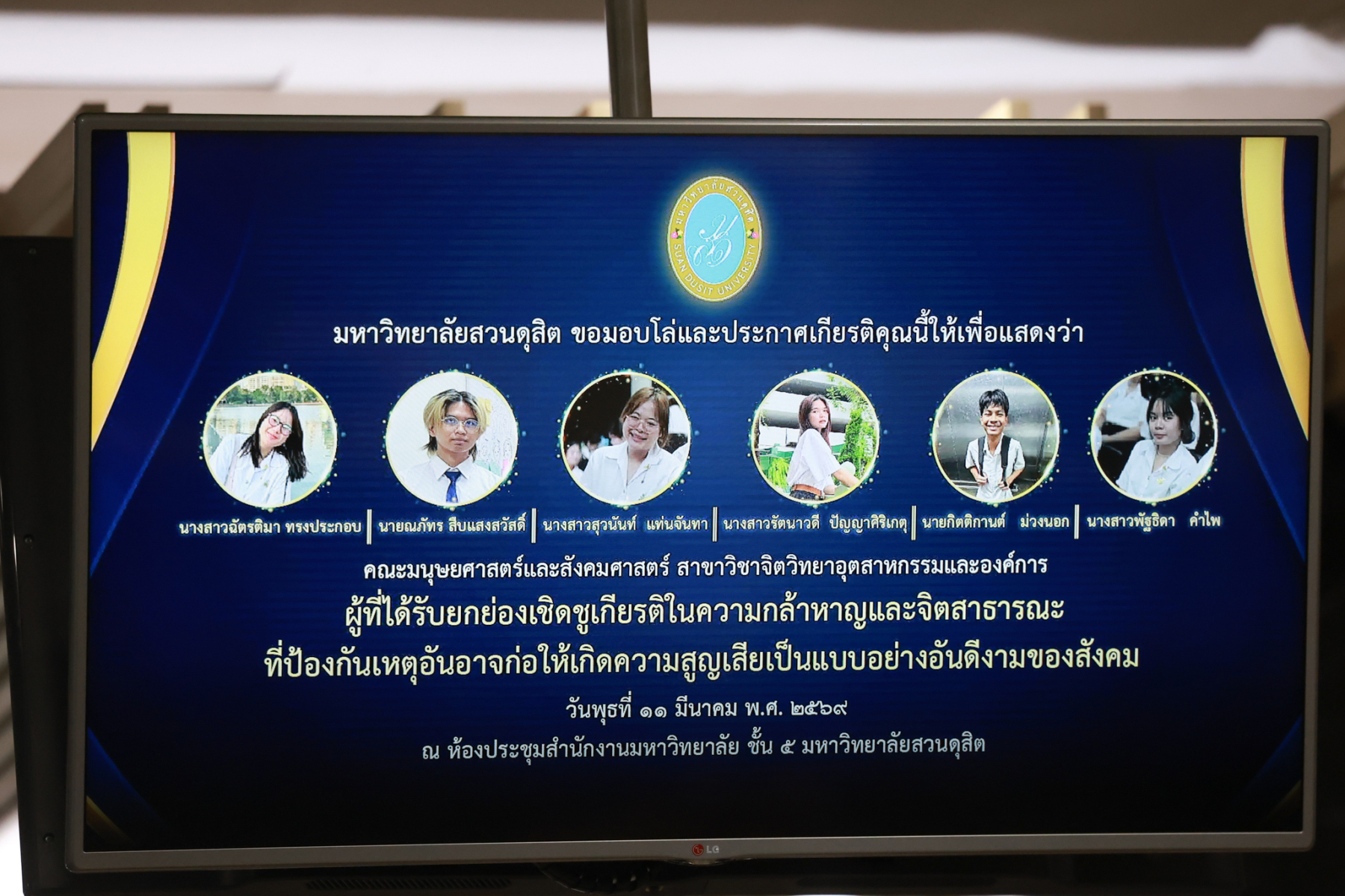 โดยนักศึกษาที่ได้รับยกย่องเชิดชูเกียรติในความกล้าหาญและจิตสาธารณะที่ป้องกันเหตุอันอาจก่อให้เกิดความสูญเสียเป็นแบบอย่างอันดีงามของสังคม จากเหตุการณ์เมื่อวันที่ 16 กุมภาพันธ์ 2569 ณ บริเวณสะพานซังฮี้ โดยนางสาวฉัตรติมา ทรงประกอบ นักศึกษาสาขาวิชาจิตวิทยาอุตสาหกรรมและองค์การ ผู้กระทำความดี และแสดงออกถึงความมีจิตสาธารณะ ได้สังเกตเห็นชายรายหนึ่งถอดรองเท้า และมีท่าทีผิดปกติ ซึ่งขณะนั้นมี นายณภัทร สืบแสงสวัสดิ์ นักศึกษารุ่นพี่ (ศิษย์เก่า) เดินผ่านมาบริเวณดังกล่าว จึงได้ปรึกษากัน โดยพิจารณาสัญญาณเตือนที่อาจนำไปสู่พฤติกรรมการฆ่าตัวตาย ซึ่งเคยได้รับการเรียนรู้จากรายวิชา “การให้คำปรึกษาในสภาวะวิกฤต” และจากการสัมมนาแลกเปลี่ยนเรียนรู้ในหัวข้อ “การเจราจาต่อรองในภาวะวิกฤติ” วิทยากร สิบตำรวจโท เชษฐา สร้อยยังสุข สถานีตำรวจนครบาลสามเสน ในขณะเดียวกันได้สื่อสารผ่านกลุ่มไลน์เพื่อน เพื่อขอคำแนะนำในการช่วยเหลือเพิ่มเติม เพื่อนได้ให้เบอร์โทรศัพท์เจ้าหน้าที่ตำรวจรายดังกล่าว นักศึกษาทั้งสองจึงได้ประสานงานเจ้าหน้าที่ตำรวจโดยทันที พร้อมทั้งเฝ้าสังเกตพฤติกรรมของชายคนดังกล่าวอย่างใกล้ชิด จนเจ้าหน้าที่ตำรวจเดินทางมาถึง และสามารถให้ความช่วยเหลือได้อย่างทันท่วงที ส่งผลให้สถานการณ์คลี่คลายลงโดยปลอดภัย การกระทำของนักศึกษาสะท้อนถึงความมีสติ การทำงานเป็นทีม และความรับผิดชอบต่อสังคม กองพัฒนานักศึกษา มหาวิทยาลัยสวนดุสิต จึงพิจารณาเห็นสมควรยกย่องเชิดชูเกียรตินักศึกษามหาวิทยาลัยสวนดุสิต จำนวน 6 คน ดังกล่าว