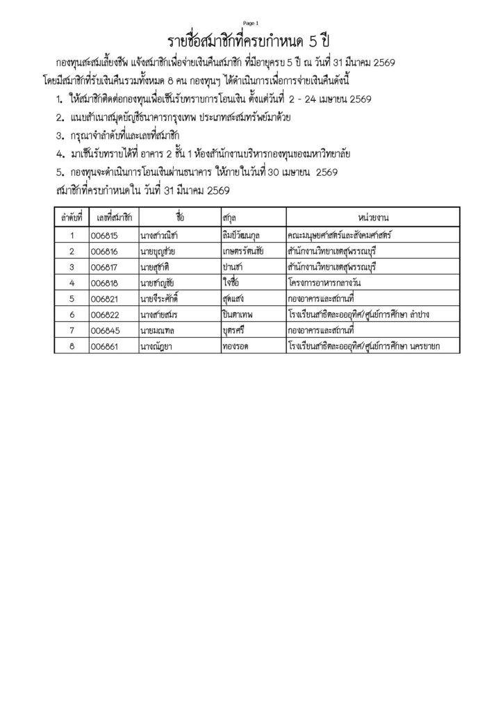 กองทุนสะสมเลี้ยงชีพ แจ้งสมาชิกเพื่อจ่ายเงินคืนสมาชิก ที่มีอายุครบ 5 ปี ณ วันที่ 31 มีนาคม 2569