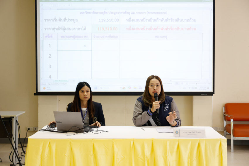 กองกลาง สำนักงานวิทยาเขตสุพรรณบุรี มหาวิทยาลัยสวนดุสิต ดำเนินการขายทอดตลาดพัสดุ จำนวน 32 รายการ โดยวิธีประมูลราคาด้วยวาจา โดยมี นางกัณณ์อลิน สุอังคะวาทิน ผู้อำนวยการสำนักงานวิทยาเขตสุพรรณบุรี กล่าวต้อนรับผู้เข้าร่วมการประมูล เเละชี้เเจงในรายละเอียดประกาศข้อกำหนดสำคัญในการประมูล และนางสาวจุฑารัตน์ จิ๋วสง่า ผู้อำนวยการกองกลาง เป็นผู้ดำเนินการประมูล เเละมีนายปริญญา หนูนุรัตน์ ผู้อำนวยการกองอาคารและสิ่งแวดล้อม พร้อมคณะกรรมการฯ ร่วมสังเกตุการและอำนวยความสะดวกในการดำเนินงาน ซึ่งมีผู้ให้ความสนใจเข้าร่วมการประมูล จำนวน 21 ราย ในวันศุกร์ที่ 24 เมษายน 2569 เวลา 09.00-10.30 น. ณ ห้อง STUDENTS CENTER ชั้น 1 อาคารสระว่ายน้ำศิลปอาชา มหาวิทยาลัยสวนดุสิต วิทยาเขตสุพรรณบุรี