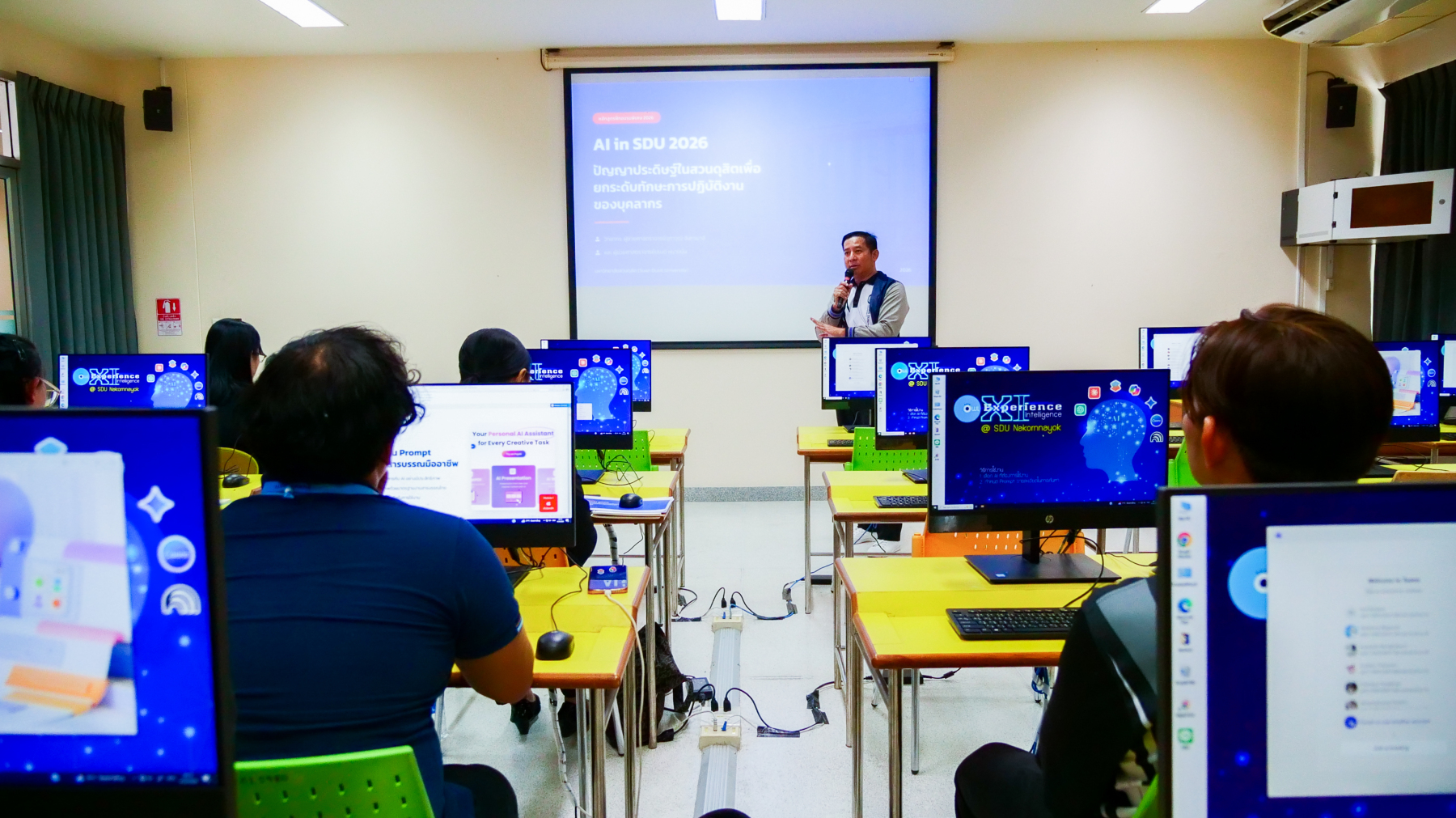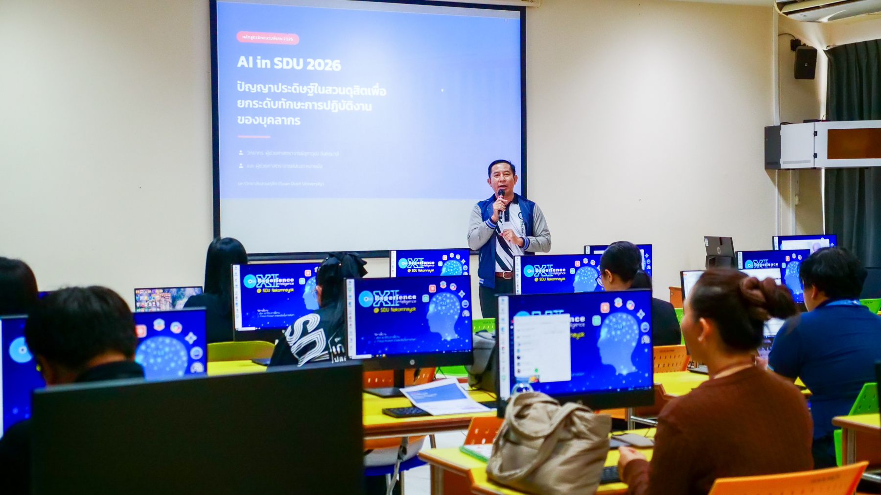มหาวิทยาลัยสวนดุสิต ศูนย์การศึกษา นครนายก จัดอบรมโครงการ AI in SDU 2026 : ปัญญาประดิษฐ์ในสวนดุสิต เพื่อยกระดับทักษะการปฏิบัติงานของบุคลากร ประจำปีงบประมาณ พ.ศ. 2569 ให้แก่บุคลากรสายวิชาการและสายสนับสนุน มหาวิทยาลัยสวนดุสิต ศูนย์การศึกษา นครนายก และบุคลากรศูนย์การเรียนรู้เกษตรปลอดภัยและสุขภาวะ จังหวัดปราจีนบุรี โดยได้รับเกียรติจากผู้ช่วยศาสตราจารย์จุฑาวุฒิ จันทรมาลี ประธานหลักสูตรวิทยาการคอมพิวเตอร์ และผู้ช่วยศาสตราจารย์ปเนต หมายมั่น กรรมการบริหารหลักสูตรวิทยาการคอมพิวเตอร์ มหาวิทยาลัยสวนดุสิต เป็นวิทยากรผู้ให้ความรู้ ณ อาคาร 5 ชั้น 2 ห้องปฏิบัติการคอมพิวเตอร์ มหาวิทยาลัยสวนดุสิต ศูนย์การศึกษา นครนายก