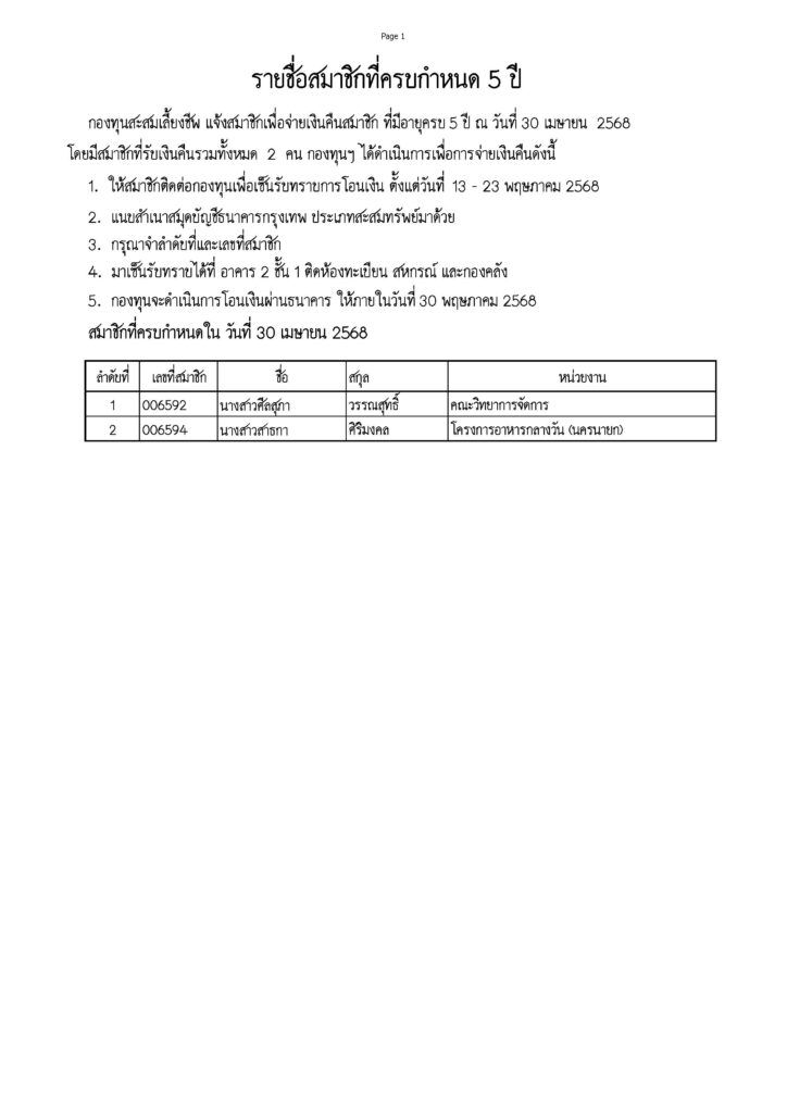 กองทุนสะสมเลี้ยงชีพ แจ้งสมาชิกเพื่อจ่ายเงินคืนสมาชิก ที่มีอายุครบ 5 ปี ณ วันที่ 31 ตุลาคม 2568