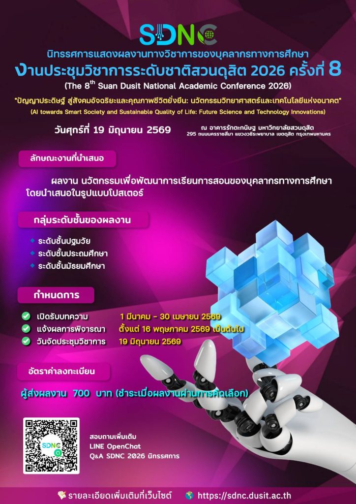 คณะวิทยาศาสตร์และเทคโนโลยี มหาวิทยาลัยสวนดุสิต ขอเชิญร่วมงานประชุมวิชาการระดับชาติสวนดุสิต 2026 ครั้งที่ 8 (SDNC) “ปัญญาประดิษฐ์ สู่สังคมอัจฉริยะและคุณภาพชีวิตยั่งยืน : นวัตกรรมวิทยาศาสตร์และเทคโนโลยีแห่งอนาคต” วันศุกร์ที่ 19 มิถุนายน 2569 ณ หอประชุมรักตะกนิษฐ มหาวิทยาลัยสวนดุสิต สอบถามรายละเอียดโทร.024239401-6