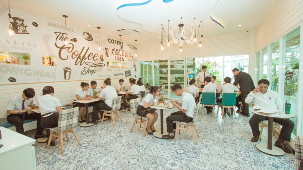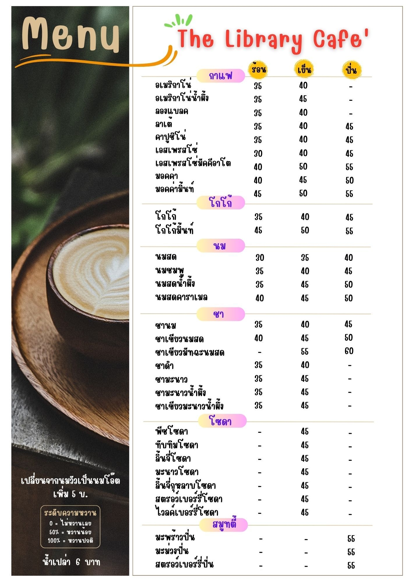 ร้านกาแฟ (Café library) ในสวนดุสิตจึงเกิดขึ้น เพื่อให้คนได้คุยกัน ได้มองเห็นกัน รวมทั้งยังทำให้คนนอกได้เข้าใช้งานด้วย สิ่งเหล่านี้ทำให้เกิดการเรียนรู้ที่หลากหลายมากยิ่งขึ้น และนำเสนอทั้งเมนูกาแฟยอดนิยมที่มีรสชาติและส่วนผสมที่ลงตัว นอกจากกาแฟแล้ว ยังมีเครื่องดื่มทางเลือกสำหรับคนรักสุขภาพ ที่คิดค้นออกมาเป็นเมนูสายชาและช็อกโกแลต นำเสนอรสชาติลงตัวที่อยากให้ทุกคนได้มาลองชิมในราคาที่ย่อมเยา พิเศษสำหรับนักศึกษา รับส่วนลด 10% ทุกเมนู เวลาให้บริการ 07.30 – 16.00 น. วันจันทร์ – วันศุกร์